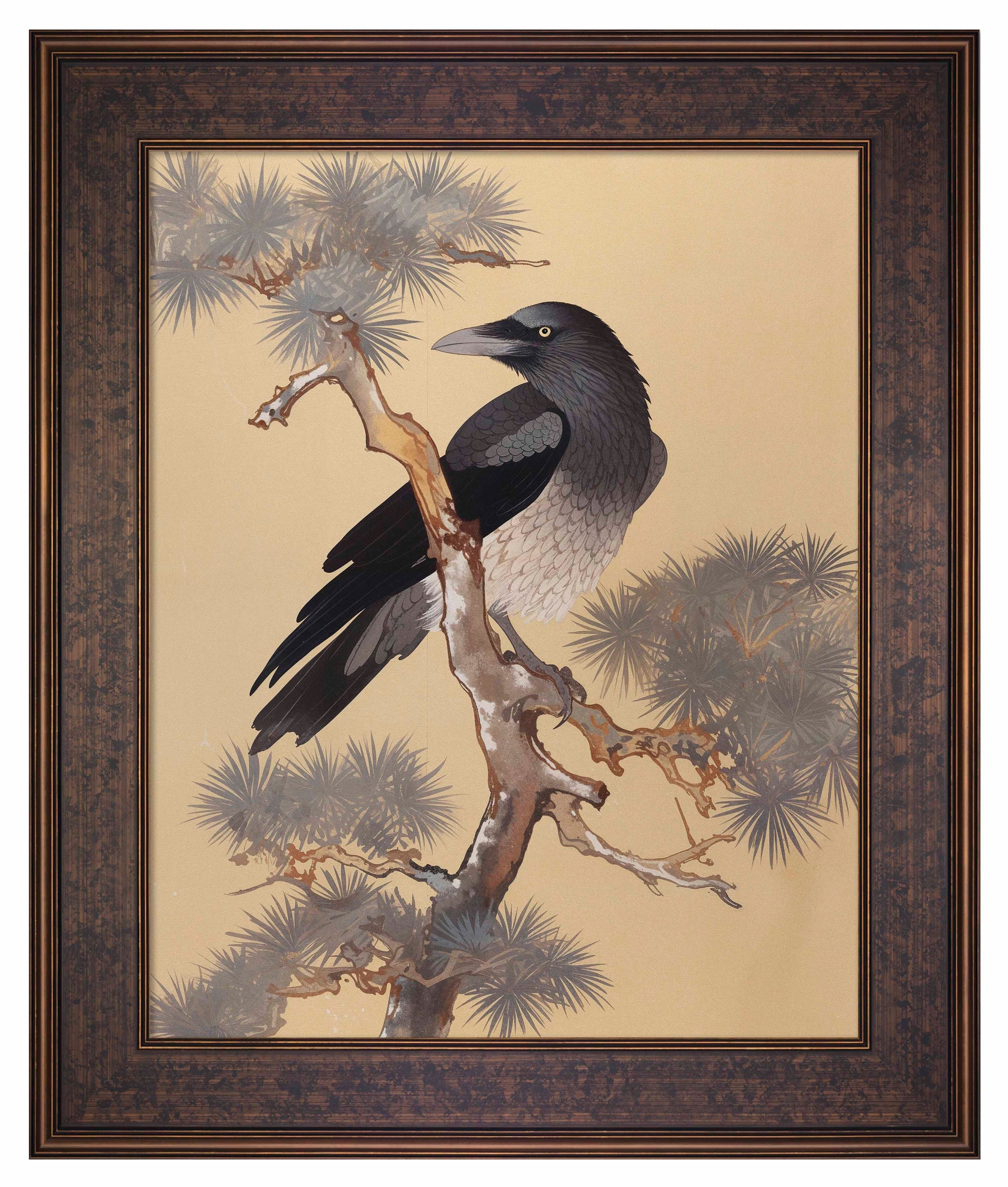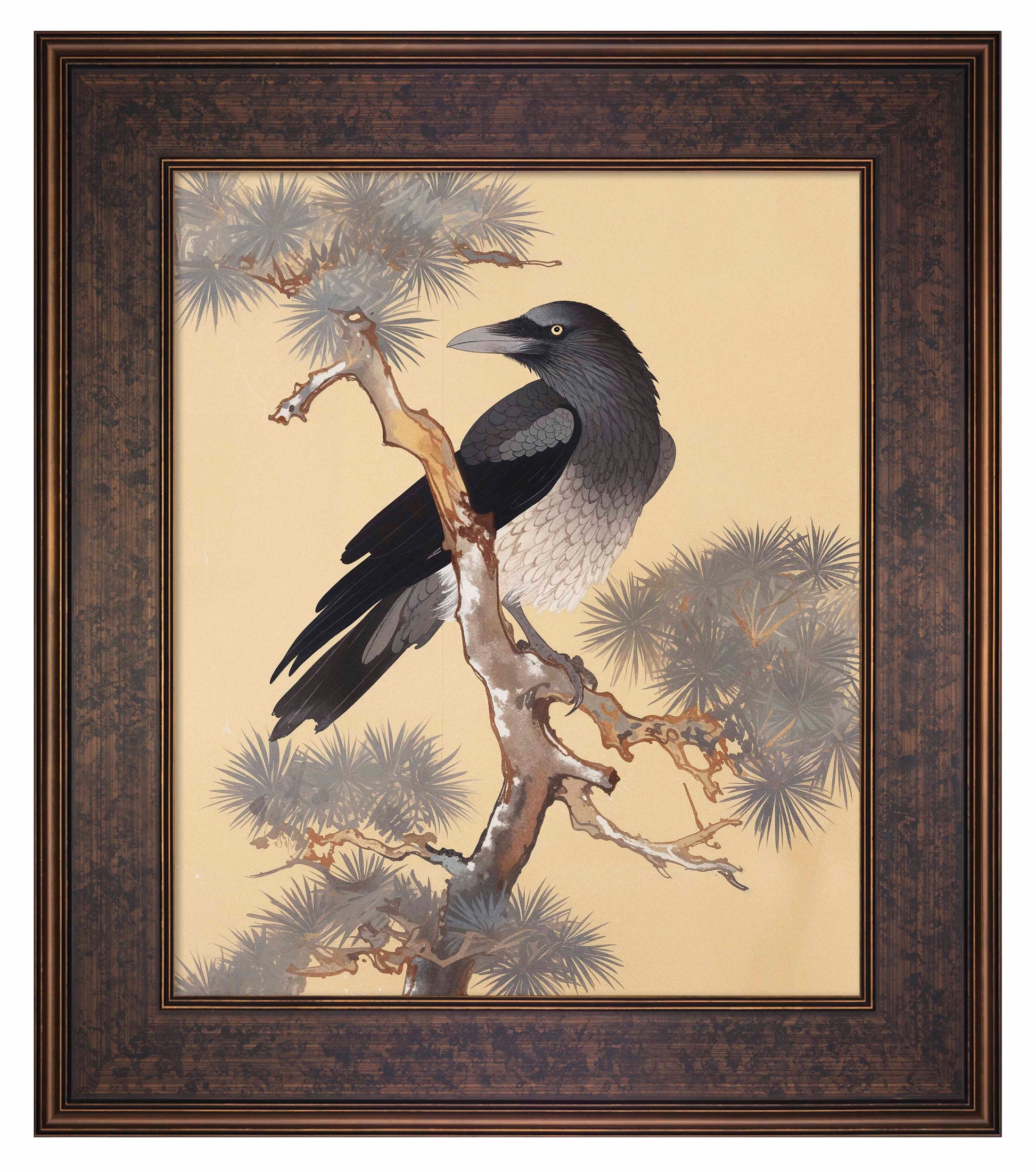 The artist's masterful use of color and composition highlights the raven's intelligent and watchful demeanor. This painting exudes a sense of mystery and contemplation, inviting viewers to ponder the symbolic meanings often associated with ravens. Mystic Watcher - Raven in Pine Grove is perfect for collectors and nature enthusiasts who appreciate the profound beauty and subtle intrigue of avian subjects, elegantly captured in the style of traditional Japanese art.