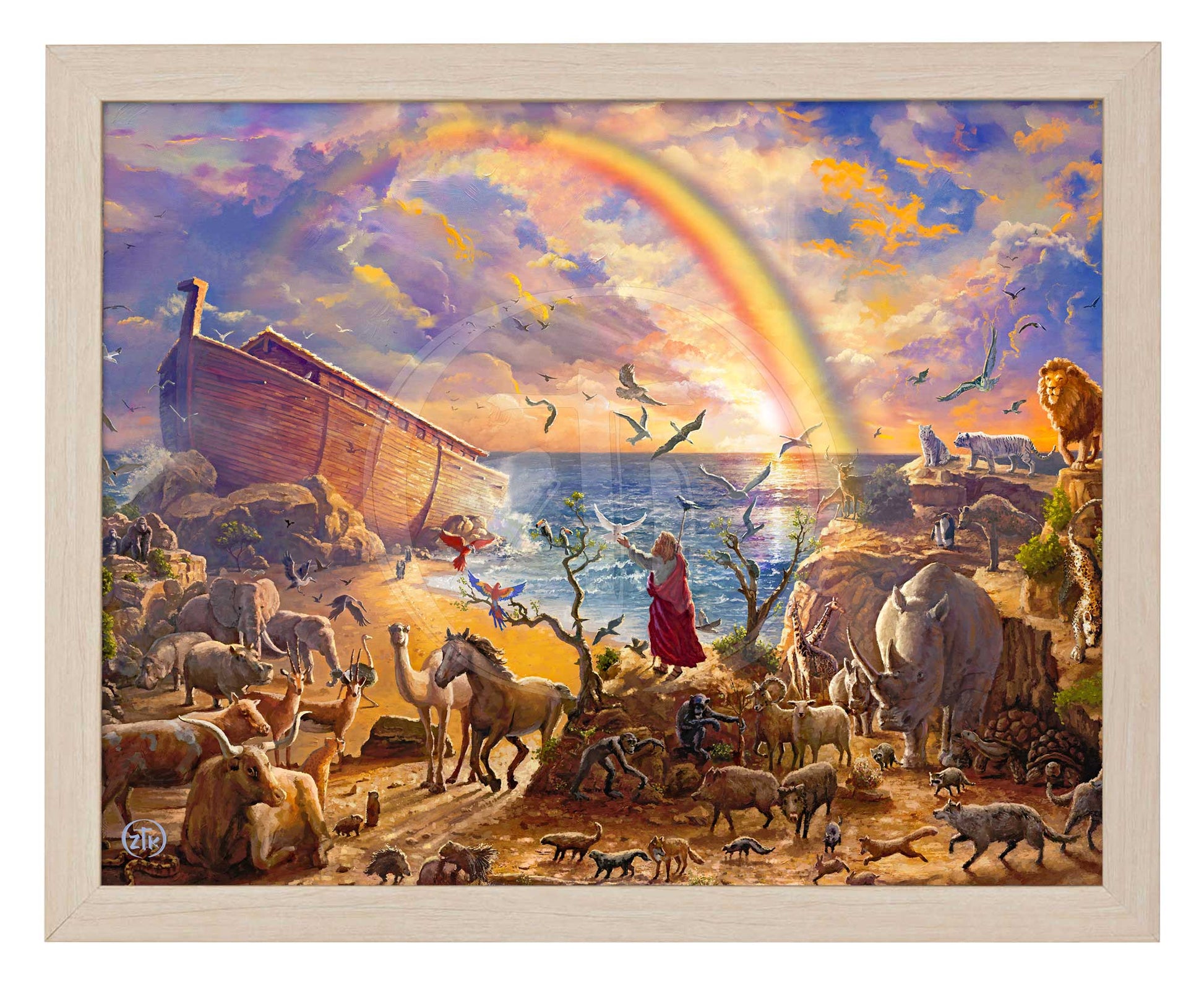 There are few Bible stories more familiar than that of Noah's Ark. It is first taught to children in Sunday school as a tale highlighting the importance of obedience to God and of His promise to provide a means to wash away sin without washing away the sinner. The account gives foundation to the new covenant and the story of Jesus and Calvary. In an attempt to capture that narrative as an artist, I wanted to give prominence to the rainbow of God as an act of the Divine as opposed to a by-product of rain and light. To that purpose, I painted the rainbow extending beyond what is possible and into what can be done by the hand of the Creator. I enjoyed selecting the animals and wanted to represent the flood as a world event so I tried to find some balance between the animals of each continent, from the African lion to the North American elk. I also wanted all life represented: from reptile to bird to mammal, both domestic and wild. In that regard, I hope you enjoy exploring my menagerie. This is the first in a suite of four paintings I am planning which will also include the story of Exodus, the Christmas story and the story of creation in the Garden of Eden. Each will attempt to capture a narrative in a manner both meaningful in Biblical and literary theme and beautiful in color, composition and aesthetic. I truly am honored to continue in my Uncle's tradition and to share this and my future work with all who have enjoyed his paintings. I am also grateful to those of you who may be just discovering my own efforts independently of what has come before. Speaking for those of us at Art Brand Studios, thank you all for sharing the light, both old and new; both then and now. - Zac Kinkade