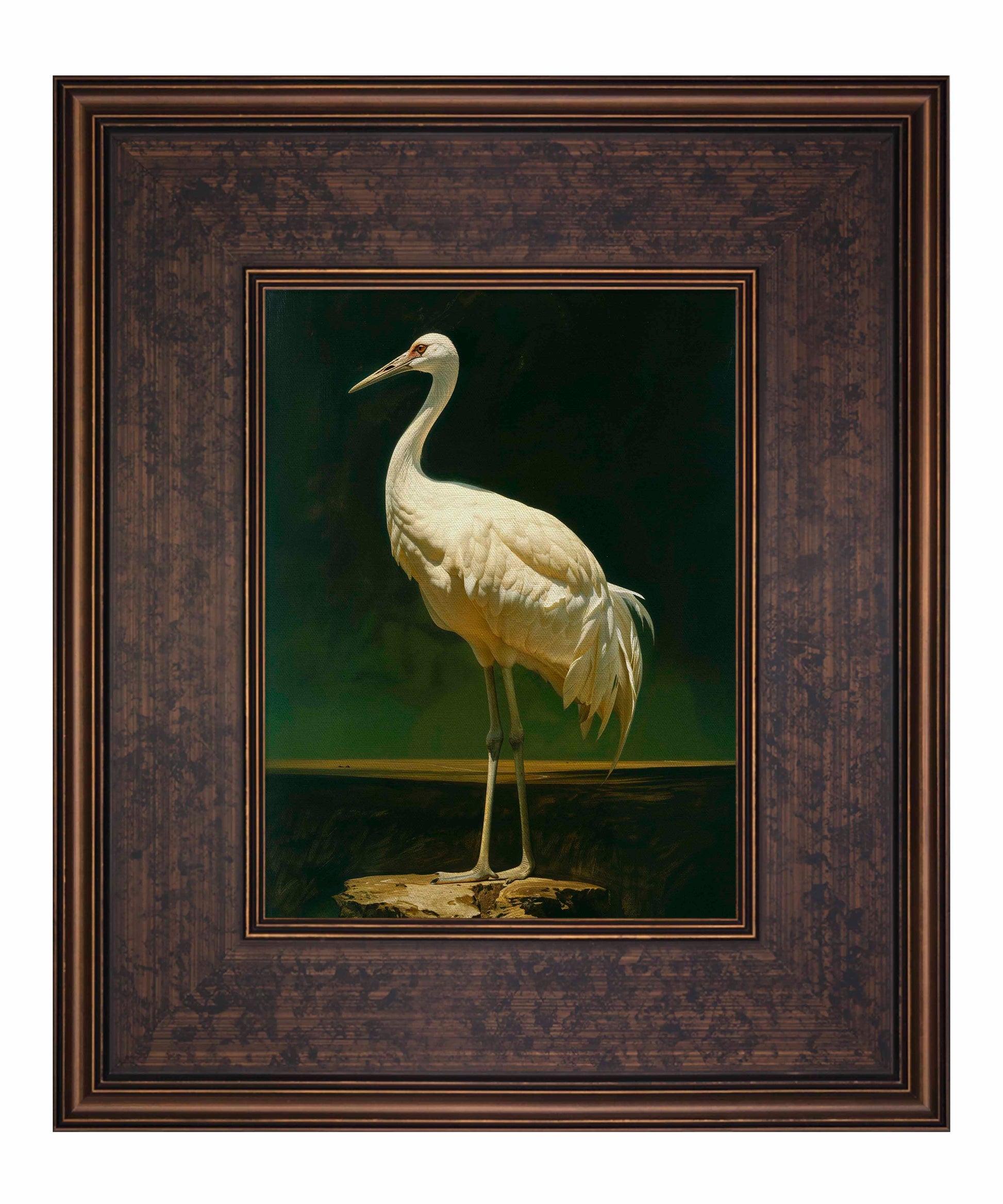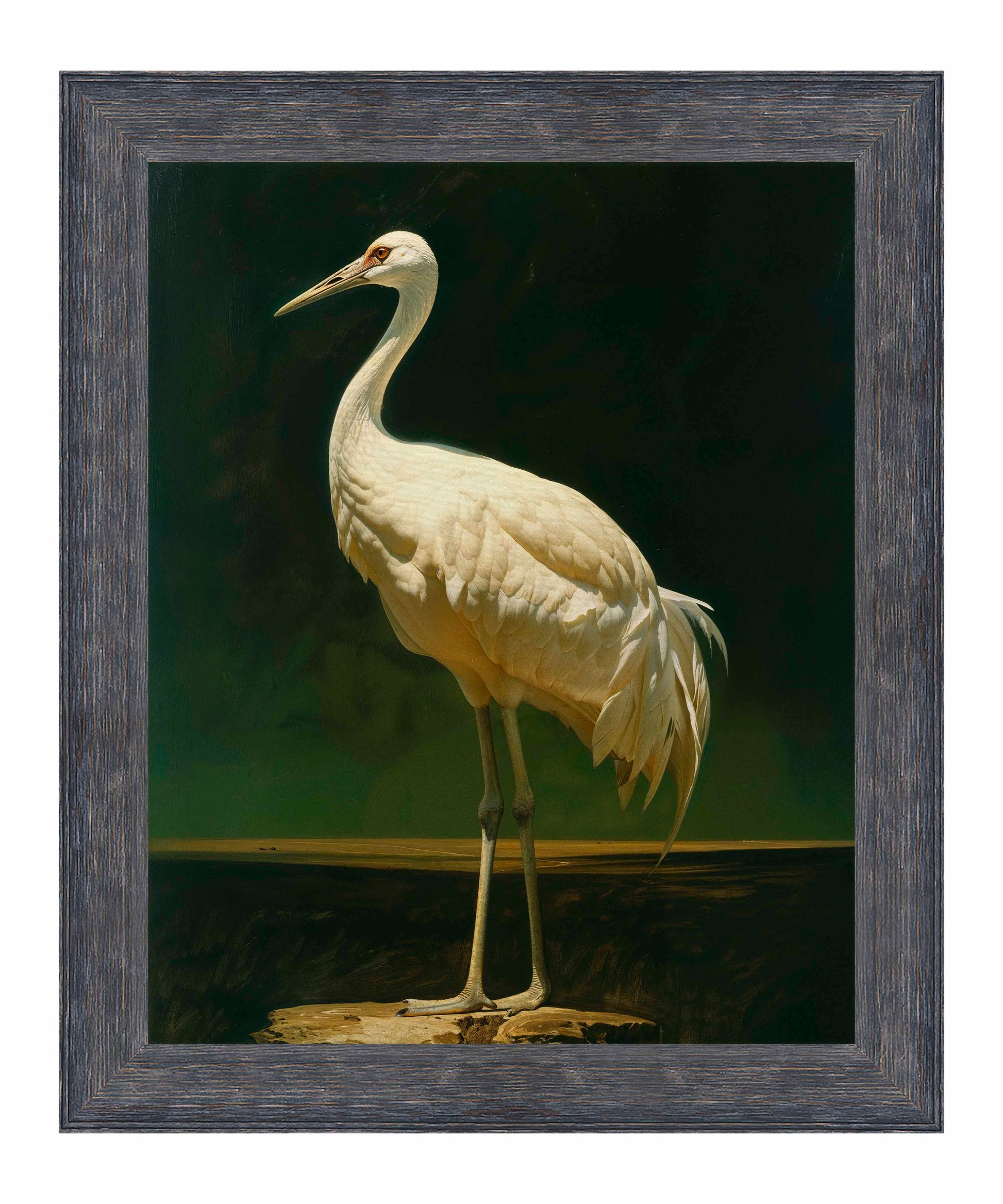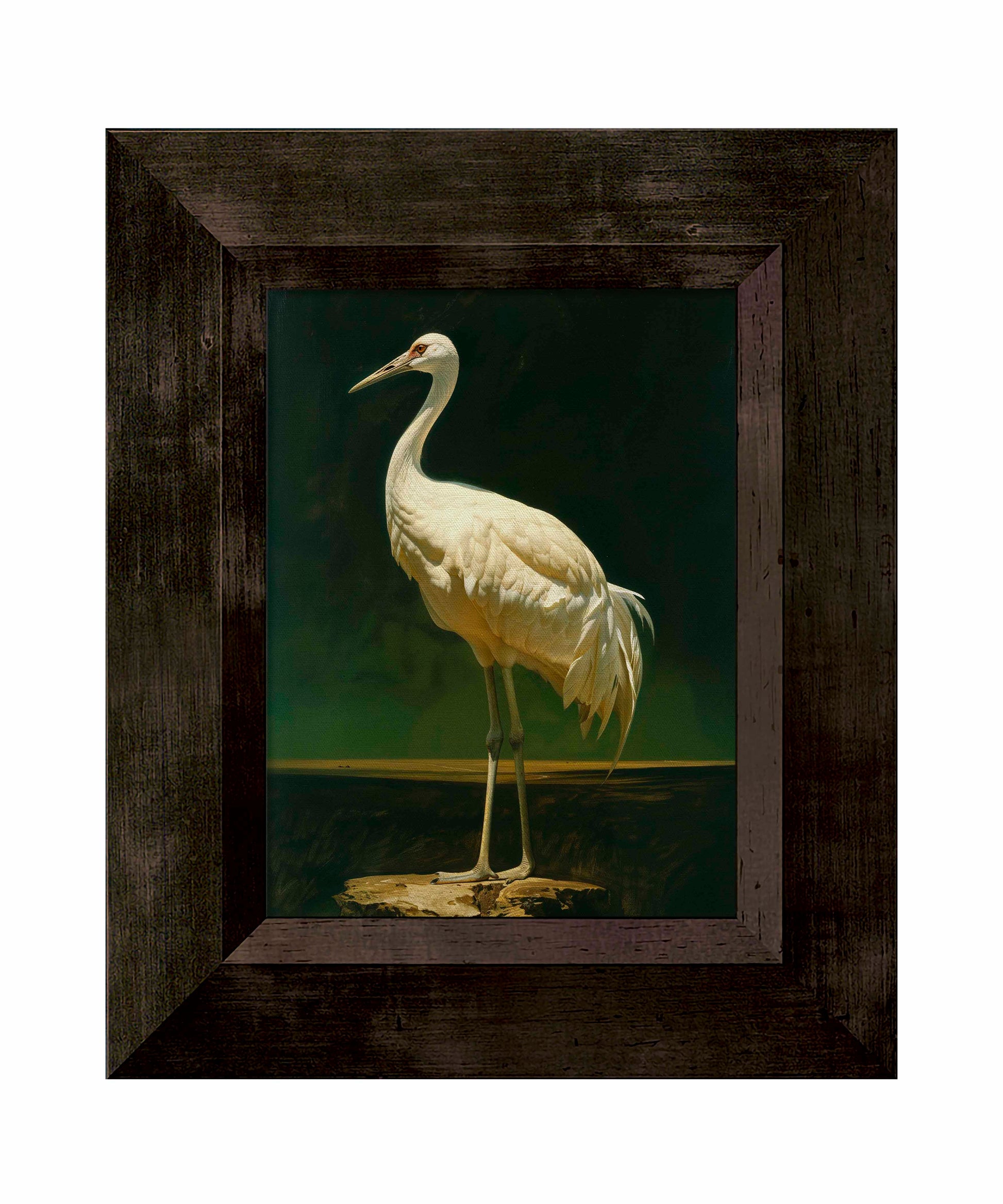 Noble Grace - Crane is an exquisite painting from the Royal Academia Collection, capturing the poised and majestic presence of a crane with exceptional detail and elegance. The crane, depicted with its immaculate white plumage, stands tall and serene against a deep, muted background, emphasizing its refined demeanor and the artist's meticulous attention to detail.