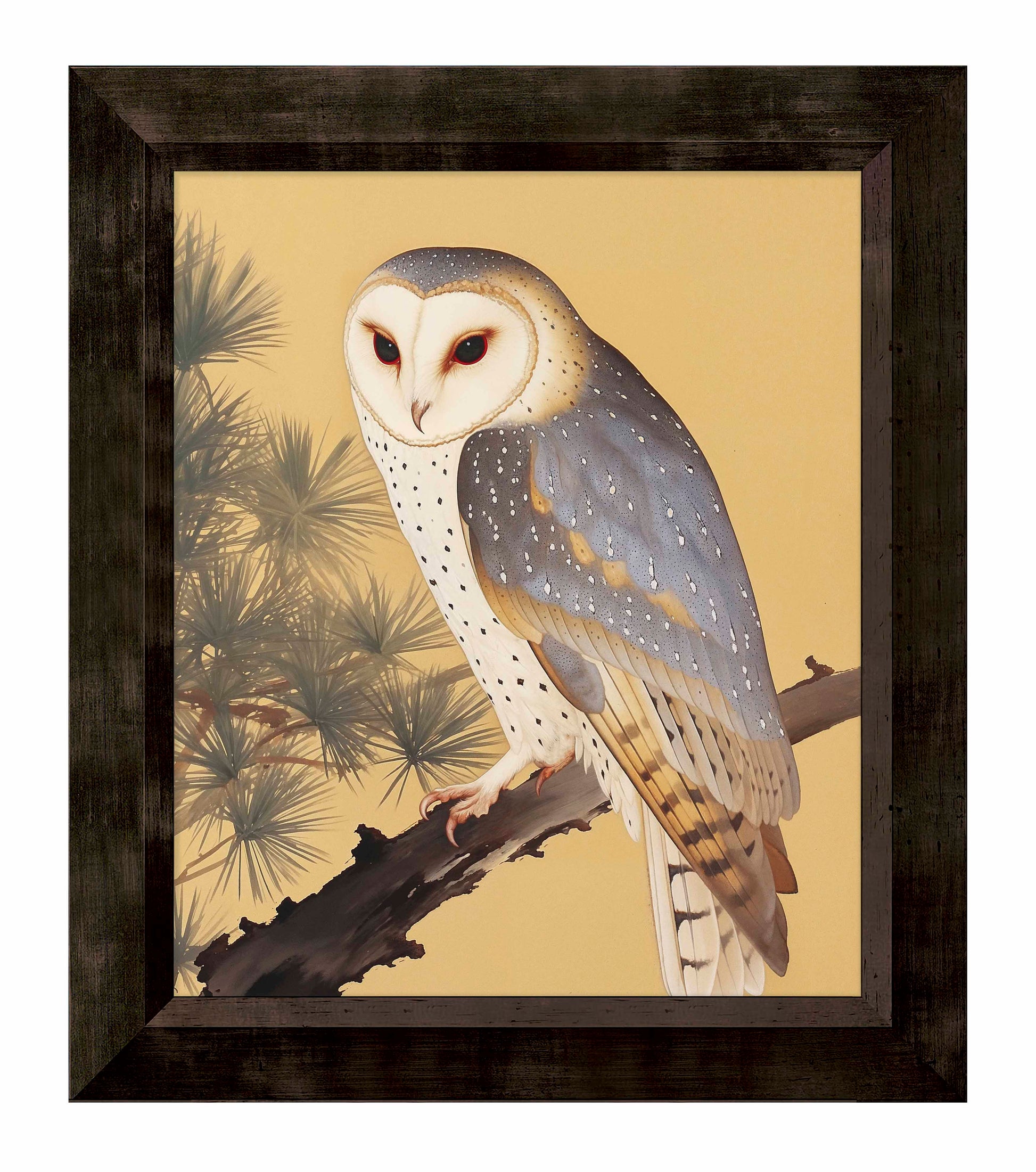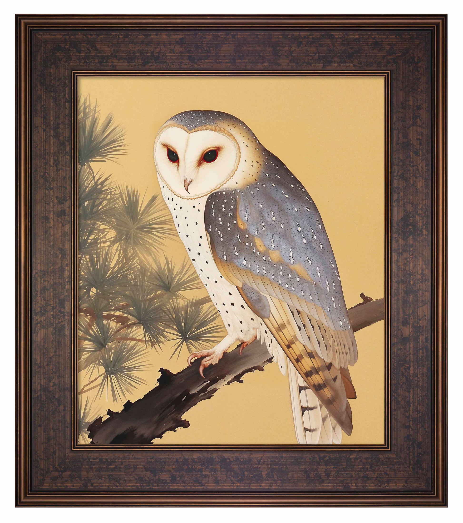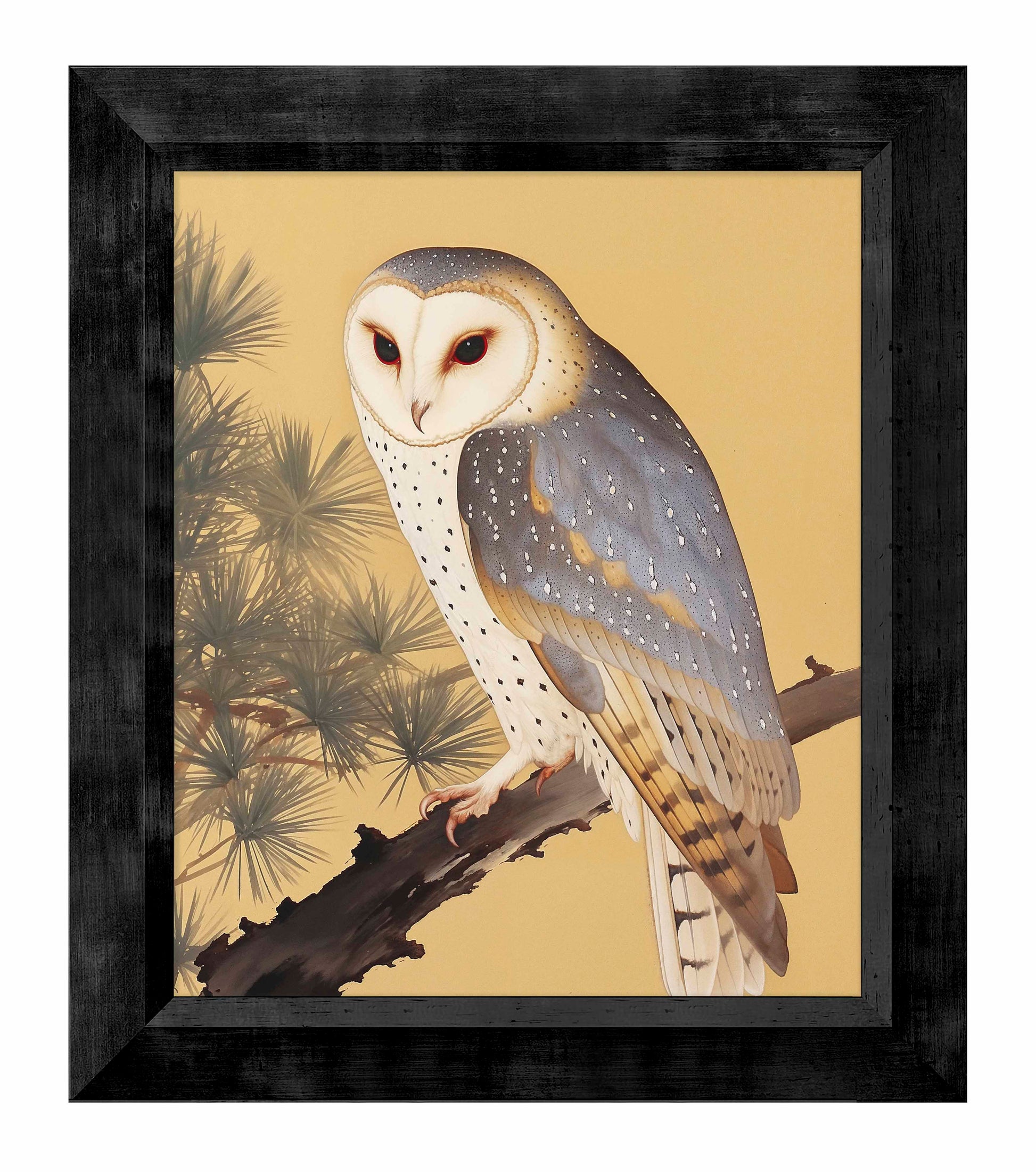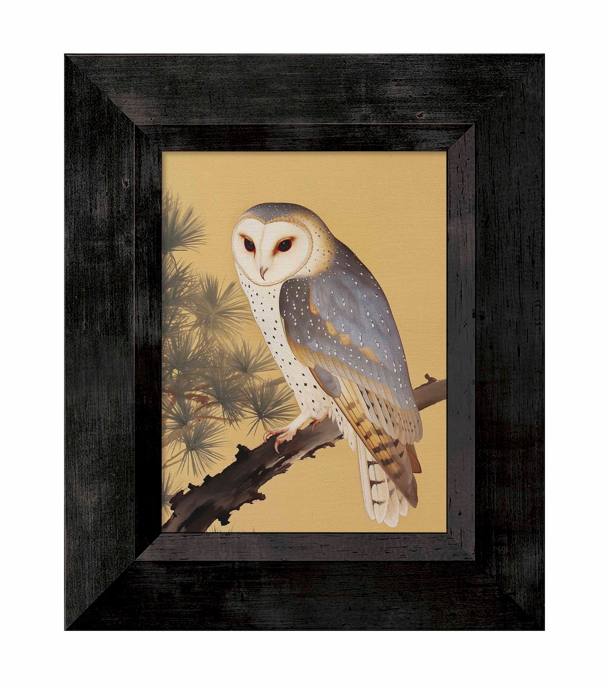 Nocturnal Whisper - Barn Owl in Pine Glade is a serene and captivating piece from the Kyoto Summer Collection, featuring the enigmatic presence of a barn owl perched gracefully on a pine branch. The barn owl's striking white face and speckled plumage stand out against the warm, golden backdrop and the lush needles of the pine tree. The tranquil composition evokes a sense of calm and mystery, inviting viewers to immerse themselves in the peaceful ambiance of a quiet glade.