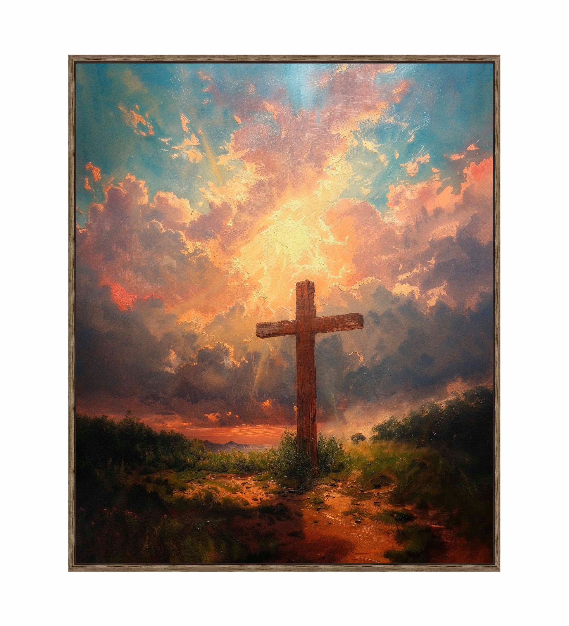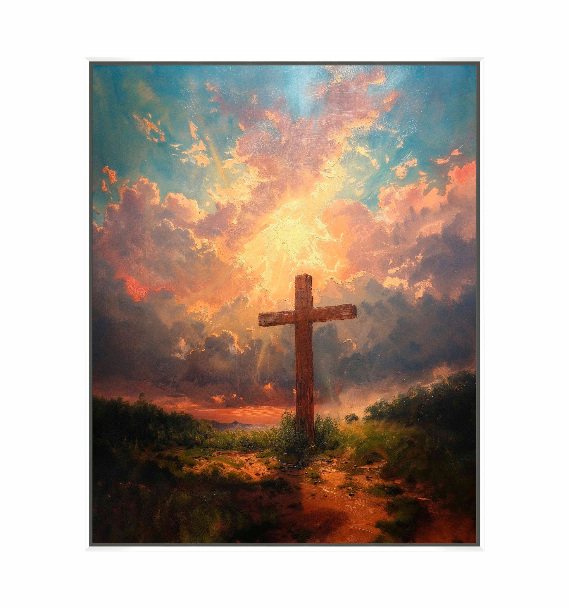 The Old Rugged Cross is a powerful representation of faith, symbolizing strength and hope in the face of adversity. The dramatic use of light and color, combined with the simplicity of the cross, creates a moving visual narrative to reflect on themes of redemption, salvation, and the enduring power of faith.