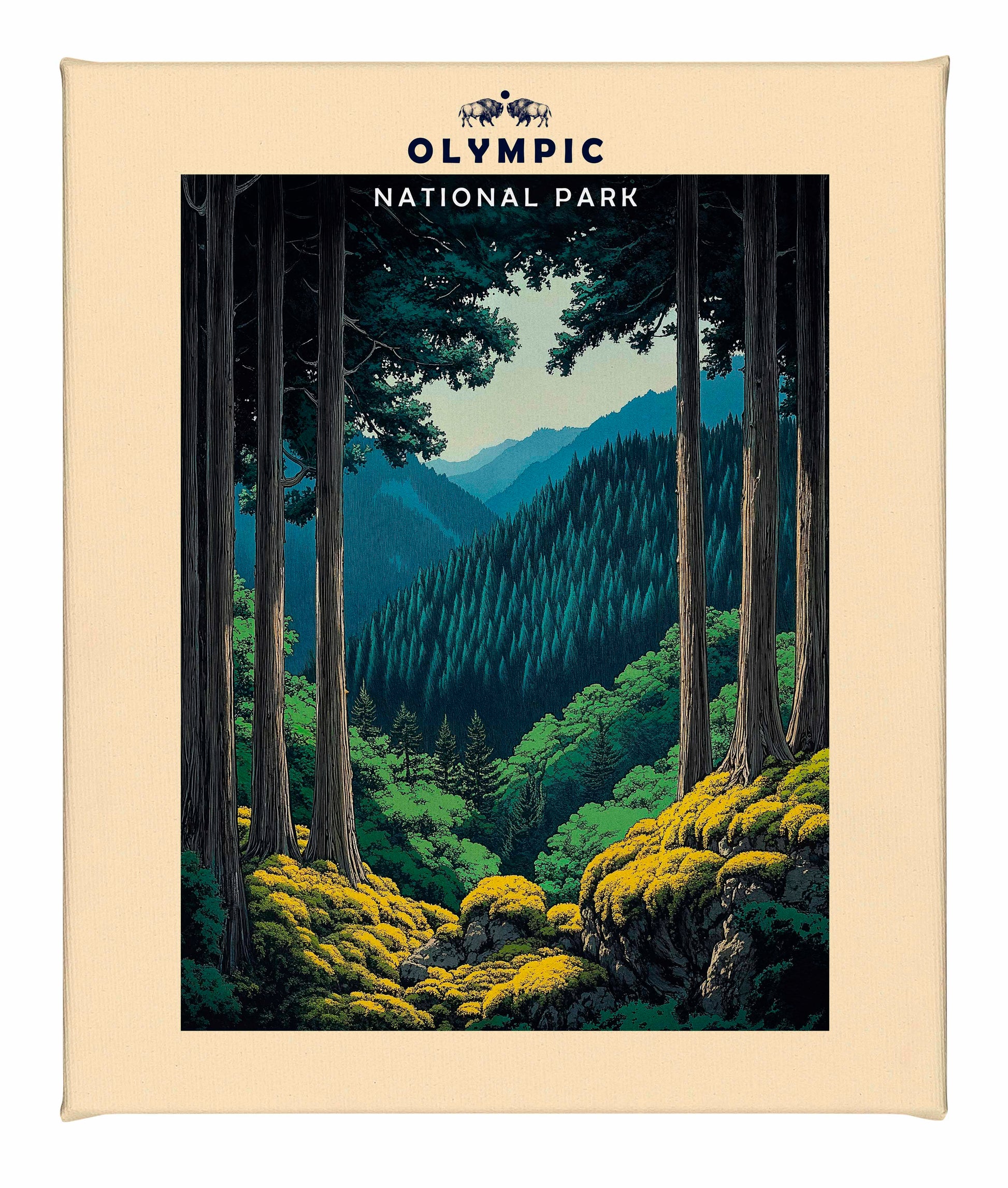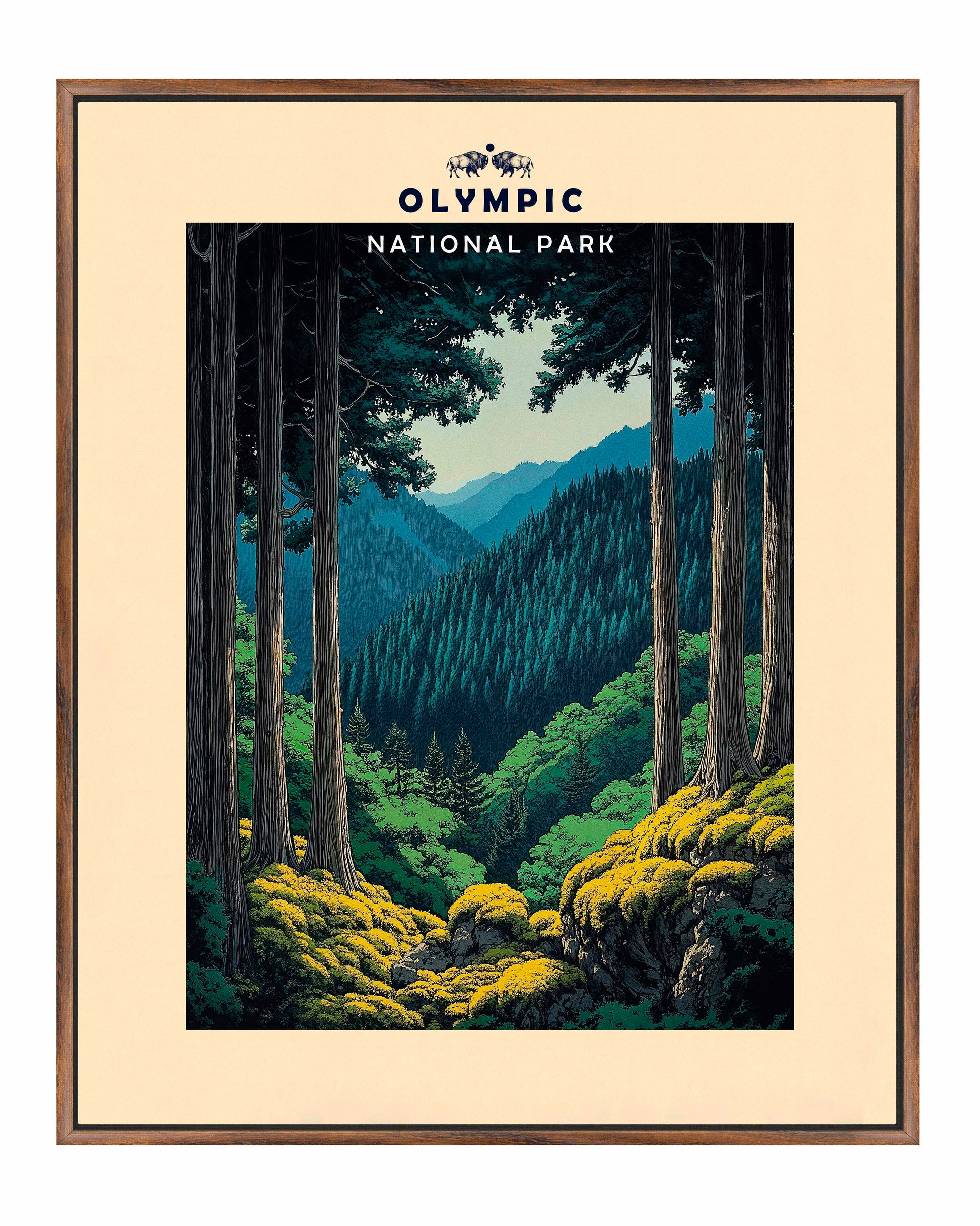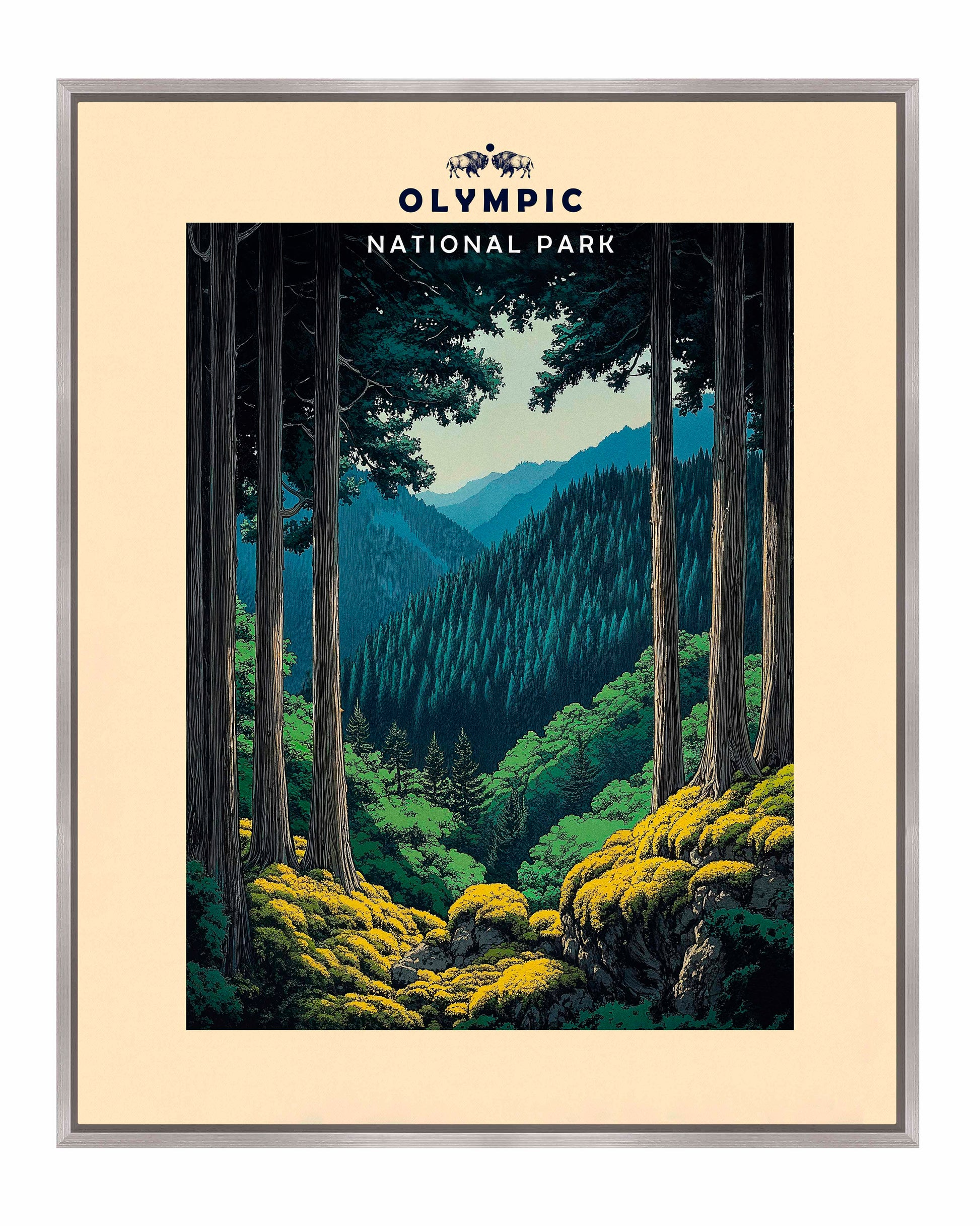 This vintage-style poster art of Olympic National Park masterfully captures the lush, verdant beauty of the Pacific Northwest rainforest. The composition draws the viewer into a serene forest scene, framed by towering evergreens whose trunks create a natural window to the distant, misty mountains. The foreground is richly detailed with vibrant yellow-green moss covering rocks and fallen logs, adding a pop of color and texture. Layers of forest stretch into the distance, rendered in varying shades of green that convey depth and the dense, diverse ecosystem. The misty blue mountains in the background hint at the park's vast wilderness. This artwork effectively uses a limited color palette dominated by cool greens and blues, with touches of warm yellow, to evoke the park's temperate rainforest atmosphere. The poster beautifully encapsulates the serene majesty of Olympic's old-growth forests, inviting viewers to explore its primeval landscapes.