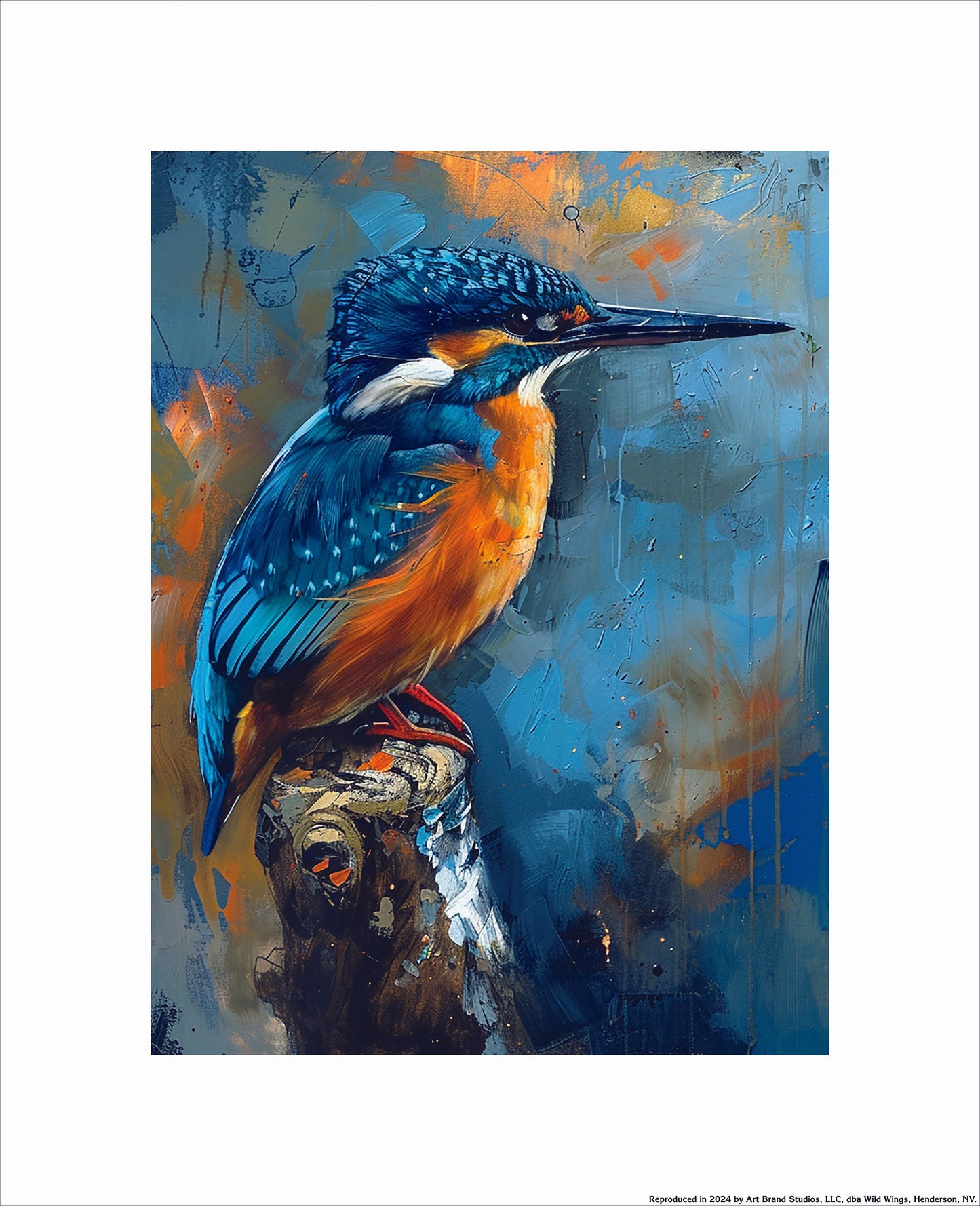 "On the Lookout" masterfully captures the essence of a Ringed Kingfisher perched atop a stump, its gaze sharply attuned to the surroundings as it searches for its next meal. The bird's plumage, painted in rich shades of blue and golden orange, is vividly rendered. This vibrant portrayal highlights the bird's alert posture and the intense focus in its eyes, conveying a sense of immediacy and readiness that is characteristic of this species. The background of the painting is equally compelling, featuring deep blue hues with golden highlights that not only complement the kingfisher’s colors but also enhance the overall dramatic impact of the scene. The use of paint drips adds a dynamic, modern twist to the composition, creating a sense of movement and fluidity that contrasts with the stillness of the Kingfisher.