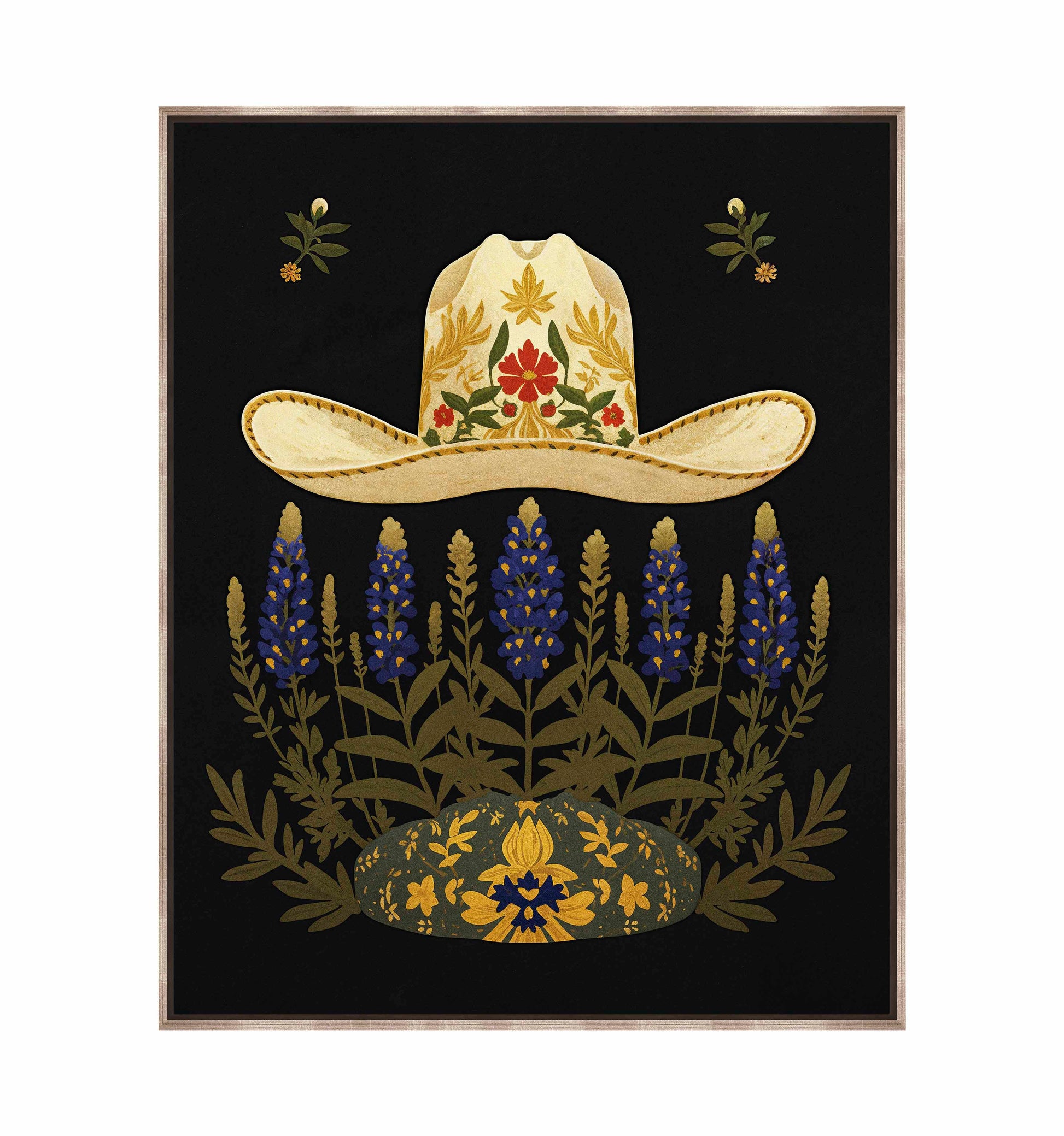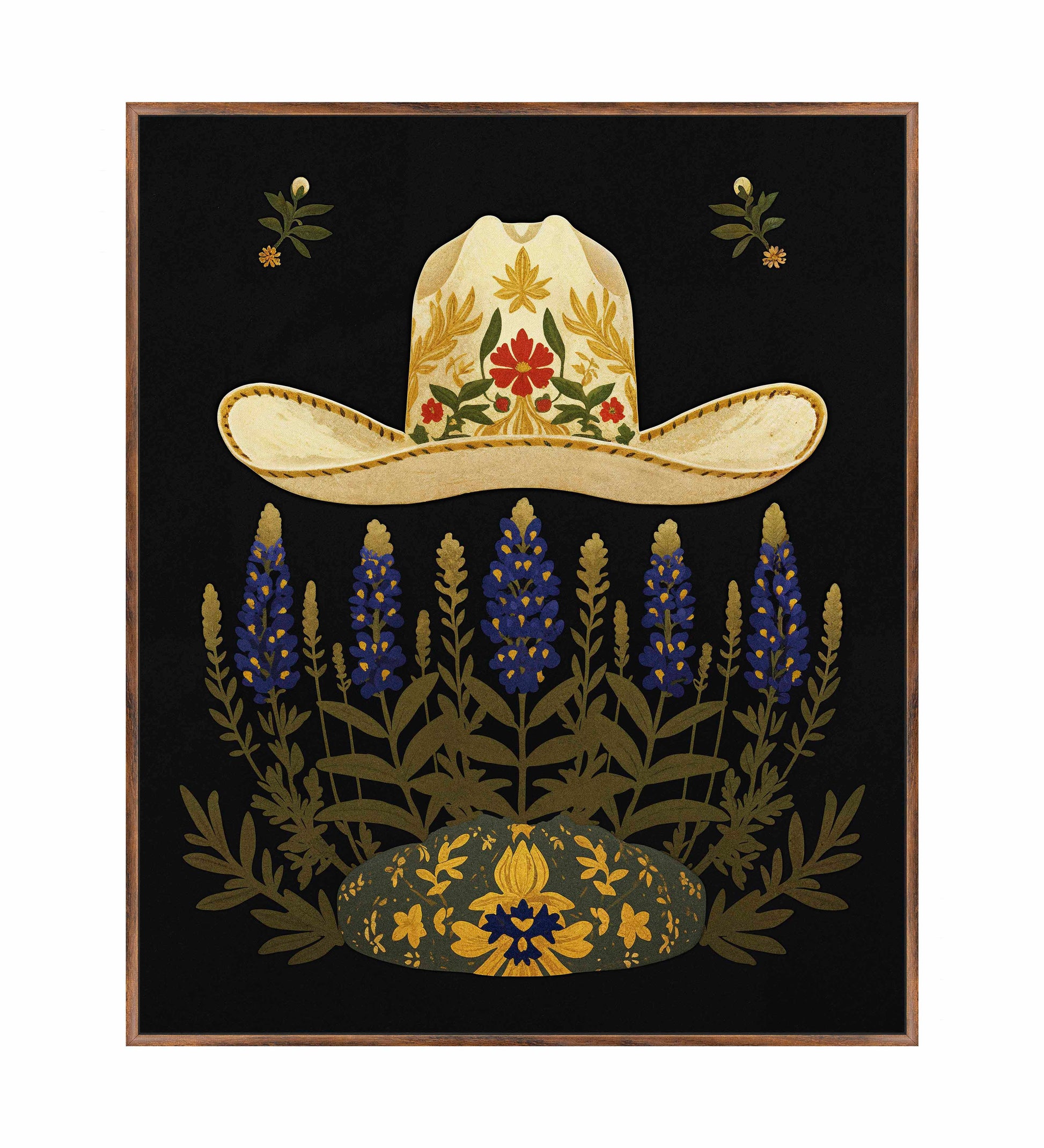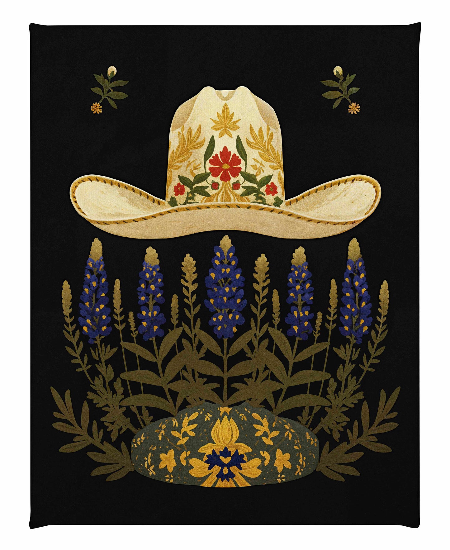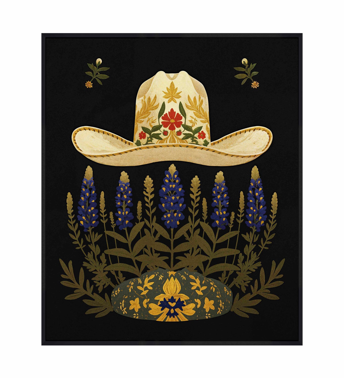 Beneath the hat, a cluster of bluebonnets—Texas's state flower—stands tall, adding a sense of depth and natural beauty to the composition. The bluebonnets are meticulously detailed, with deep blue and gold accents that contrast vividly against the dark backdrop. Additionally, at the base of the bluebonnets, a decorated stone or badge features a similar floral motif, tying the elements of the painting together with a cohesive visual theme.