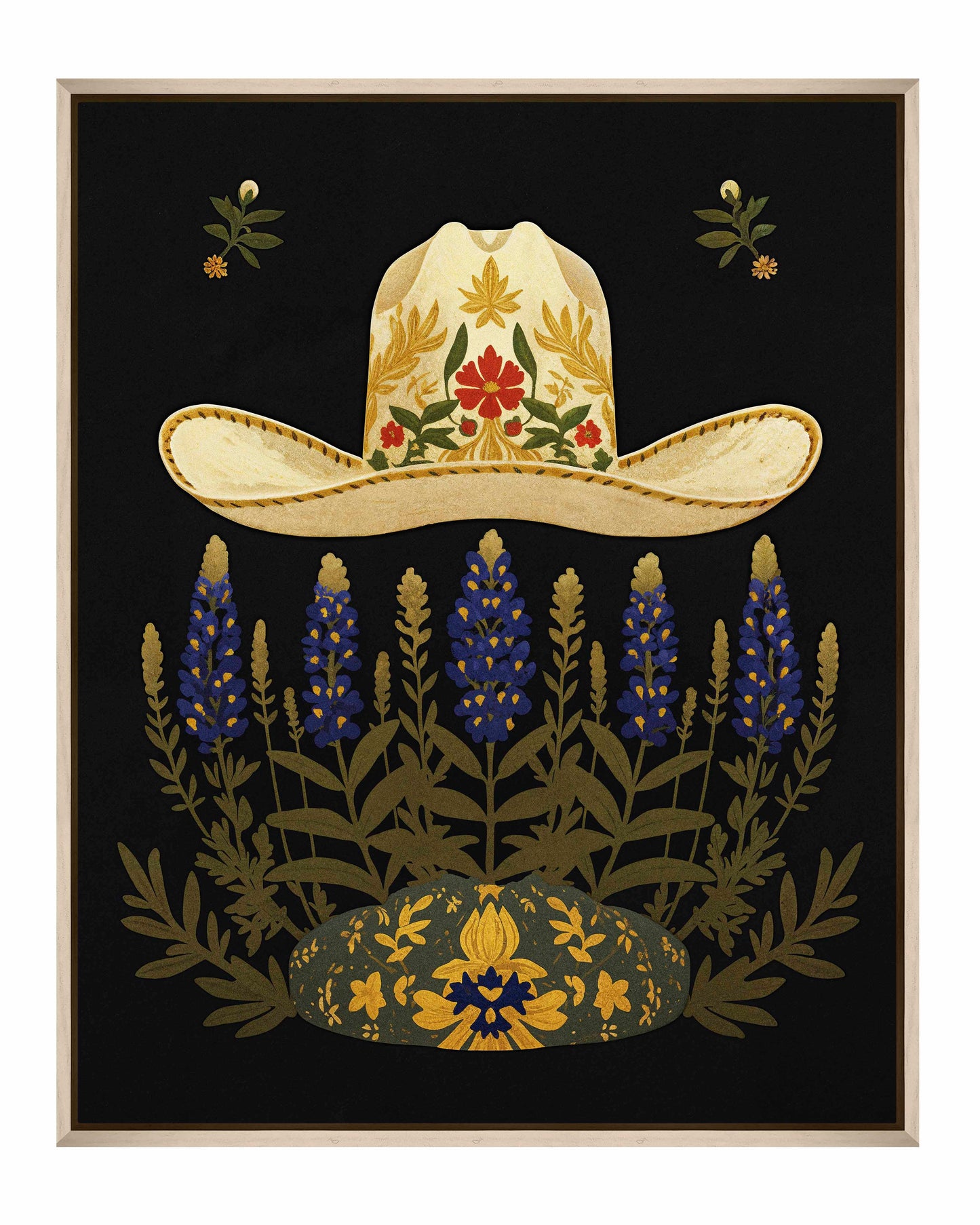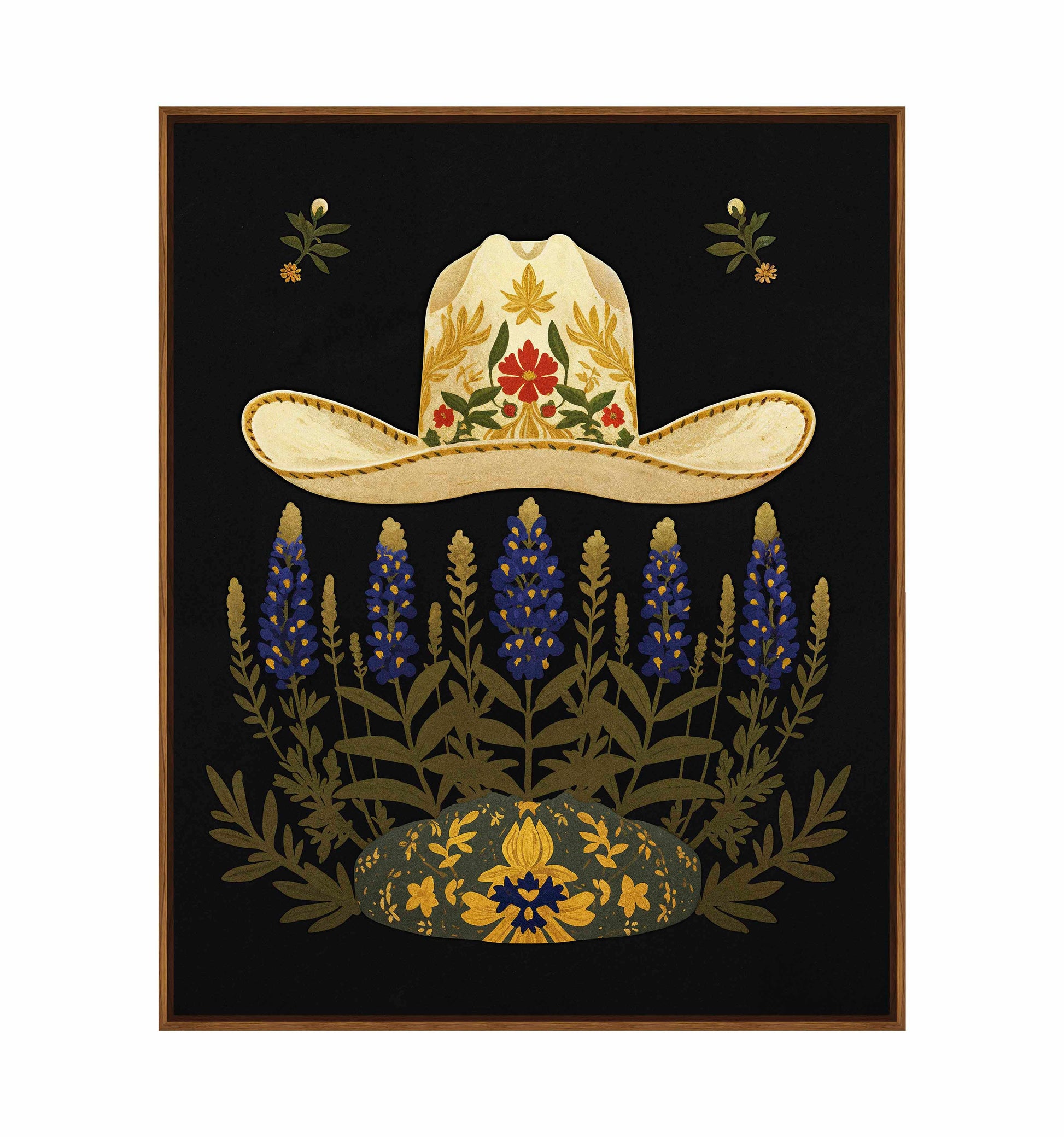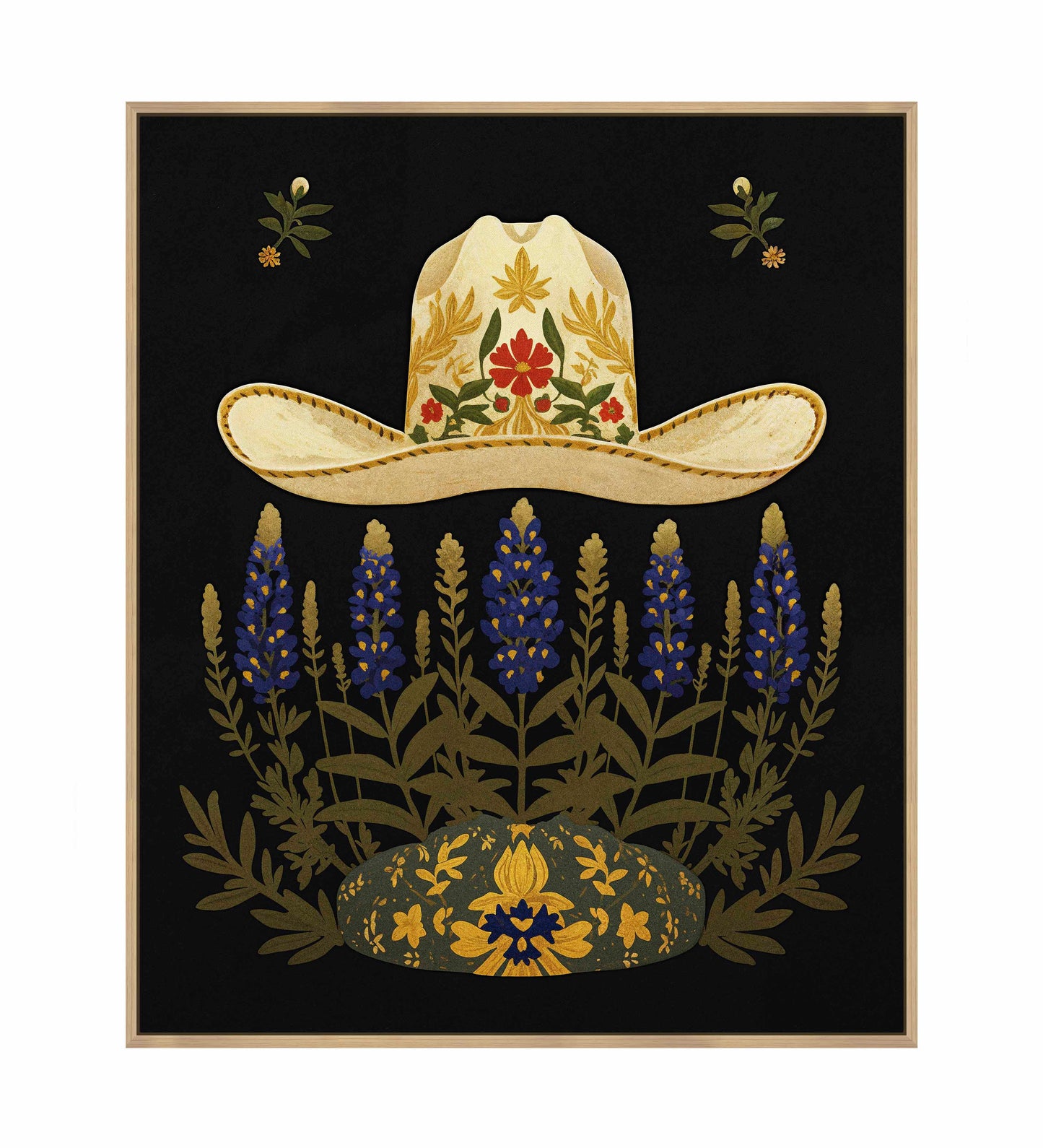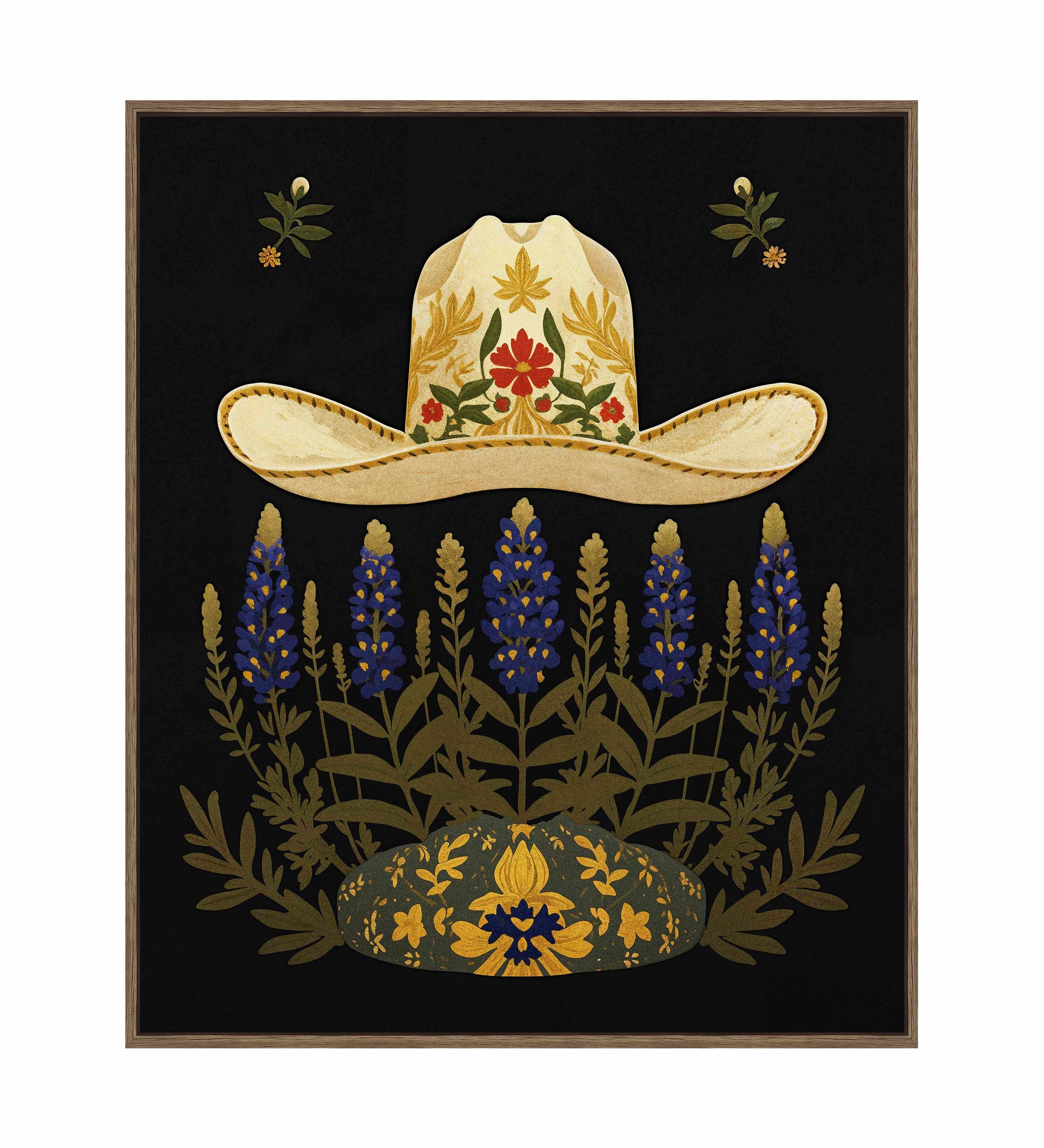 Beneath the hat, a cluster of bluebonnets—Texas's state flower—stands tall, adding a sense of depth and natural beauty to the composition. The bluebonnets are meticulously detailed, with deep blue and gold accents that contrast vividly against the dark backdrop. Additionally, at the base of the bluebonnets, a decorated stone or badge features a similar floral motif, tying the elements of the painting together with a cohesive visual theme.