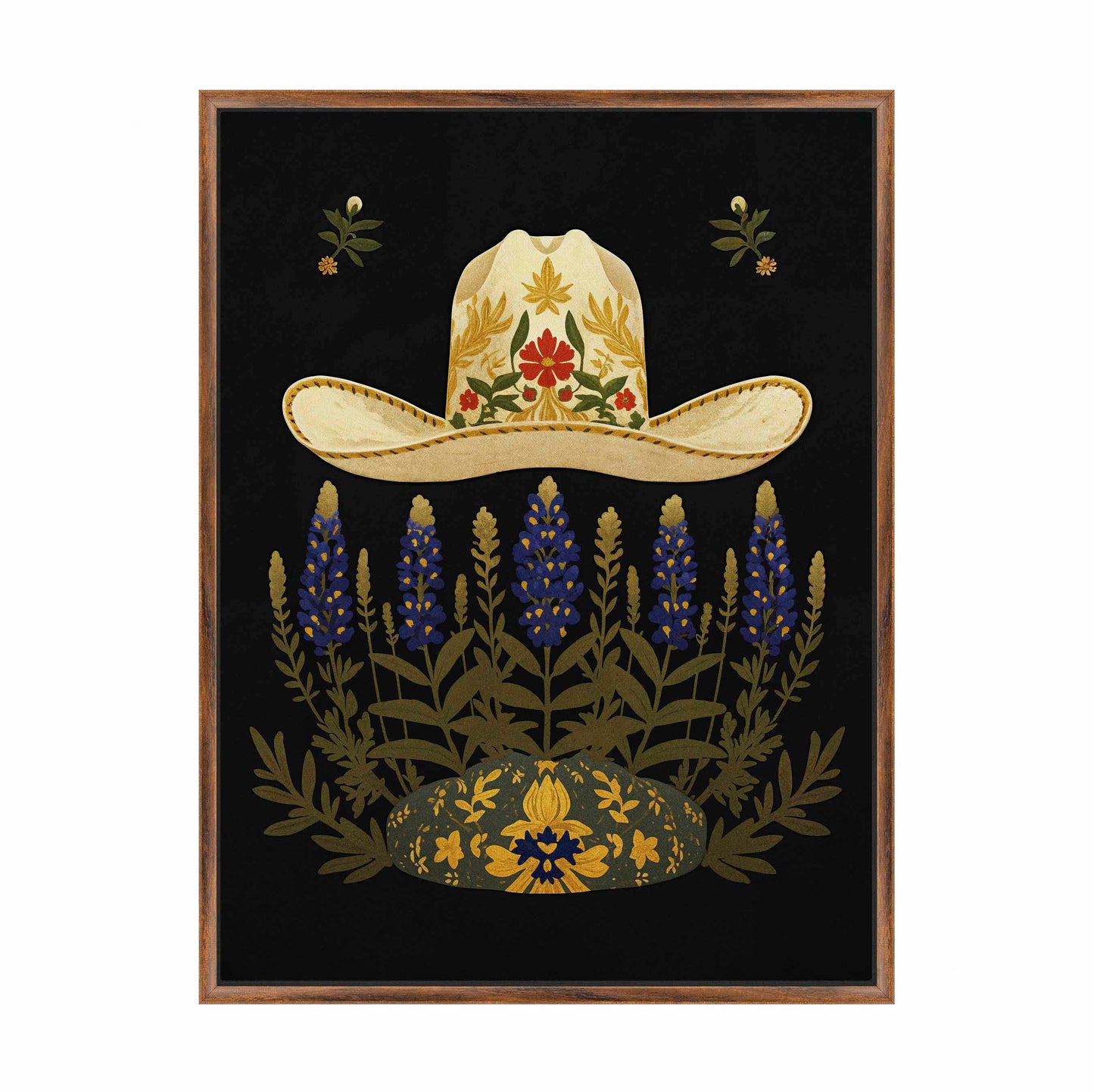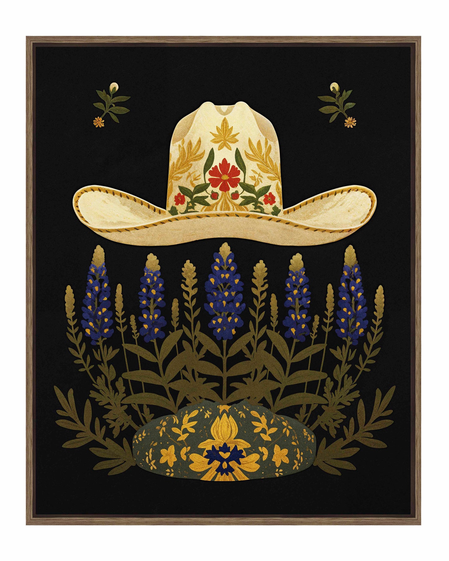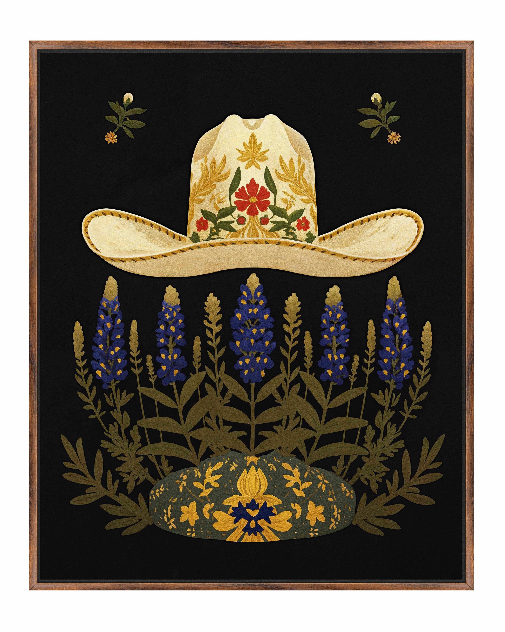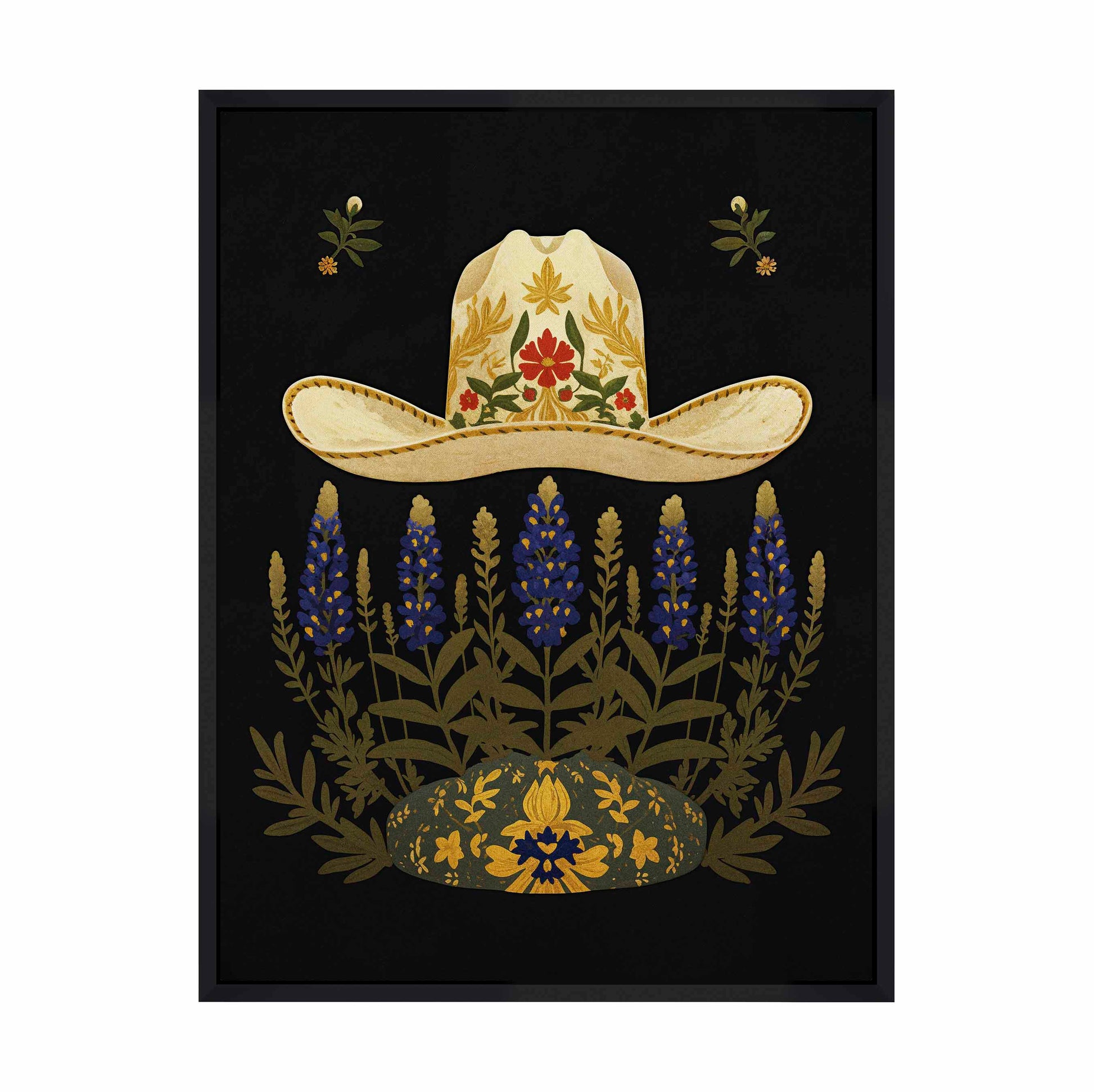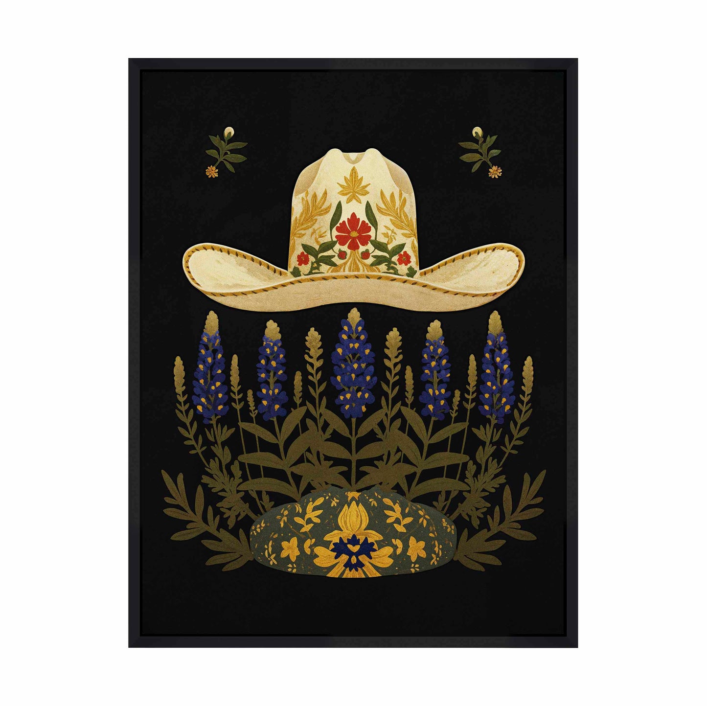 Beneath the hat, a cluster of bluebonnets—Texas's state flower—stands tall, adding a sense of depth and natural beauty to the composition. The bluebonnets are meticulously detailed, with deep blue and gold accents that contrast vividly against the dark backdrop. Additionally, at the base of the bluebonnets, a decorated stone or badge features a similar floral motif, tying the elements of the painting together with a cohesive visual theme.