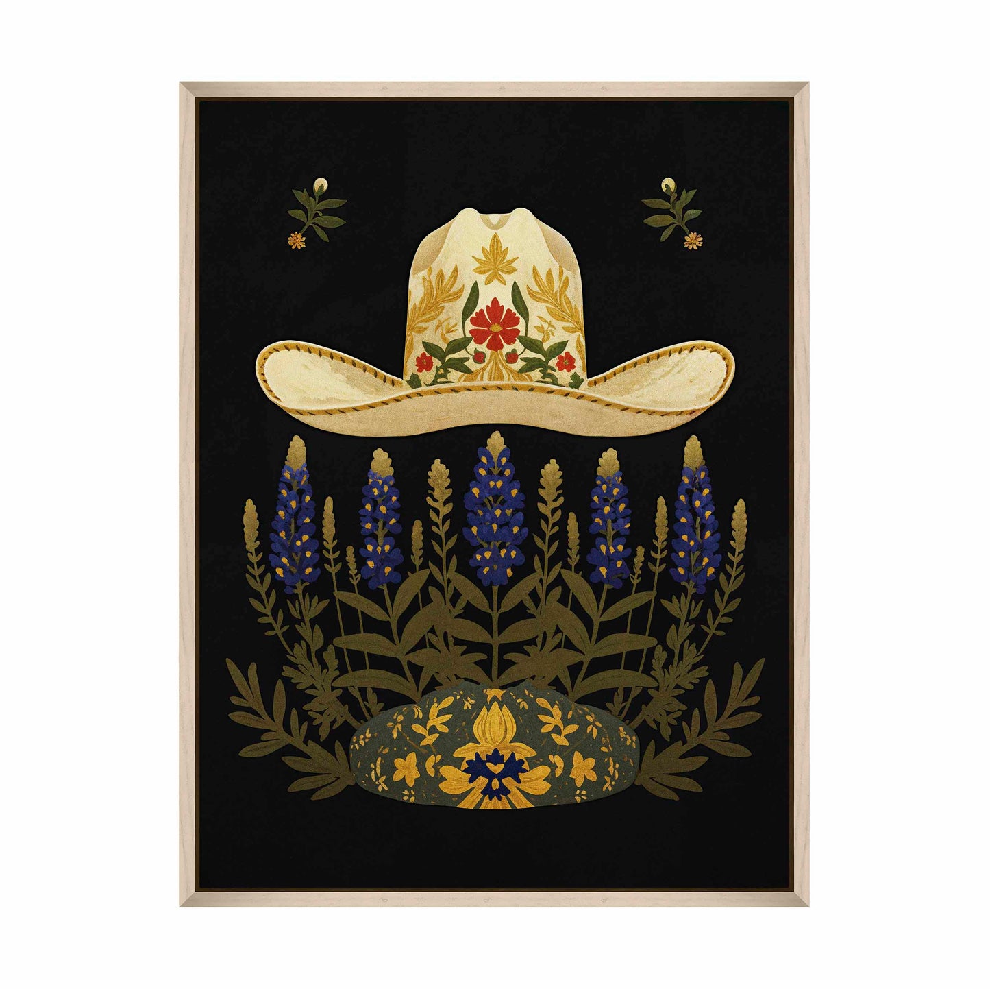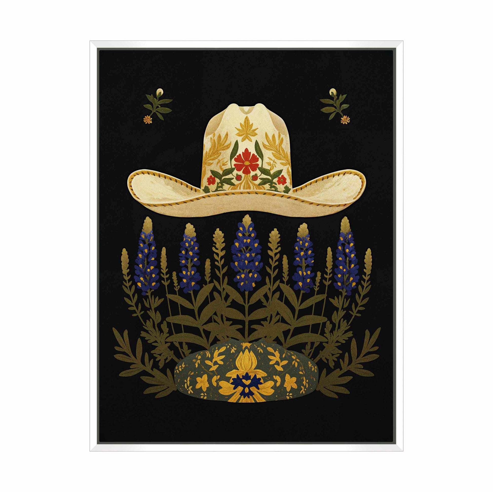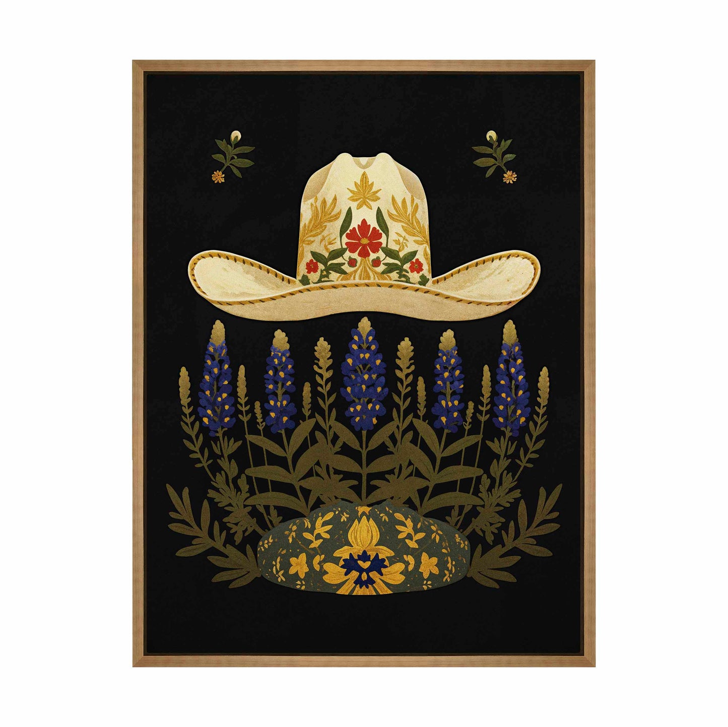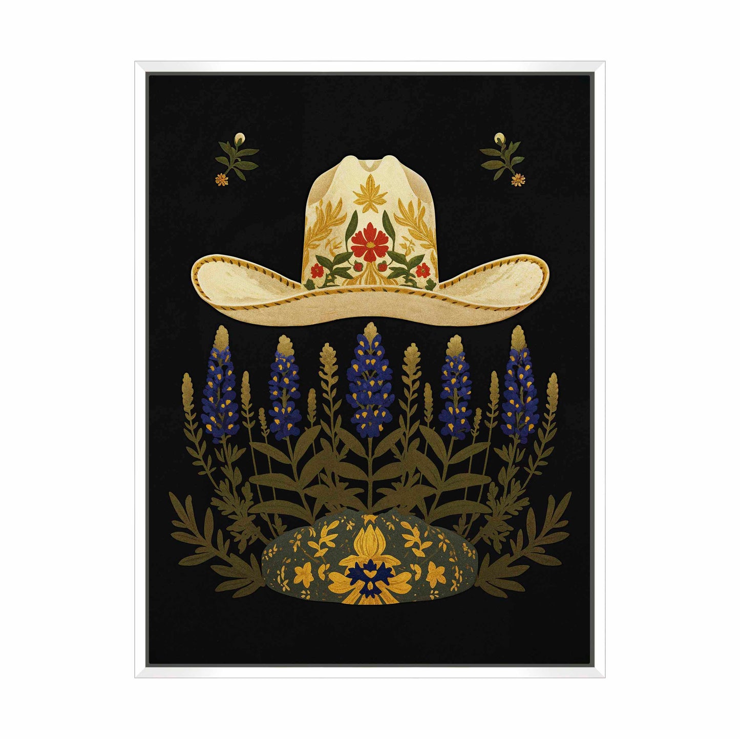 Beneath the hat, a cluster of bluebonnets—Texas's state flower—stands tall, adding a sense of depth and natural beauty to the composition. The bluebonnets are meticulously detailed, with deep blue and gold accents that contrast vividly against the dark backdrop. Additionally, at the base of the bluebonnets, a decorated stone or badge features a similar floral motif, tying the elements of the painting together with a cohesive visual theme.