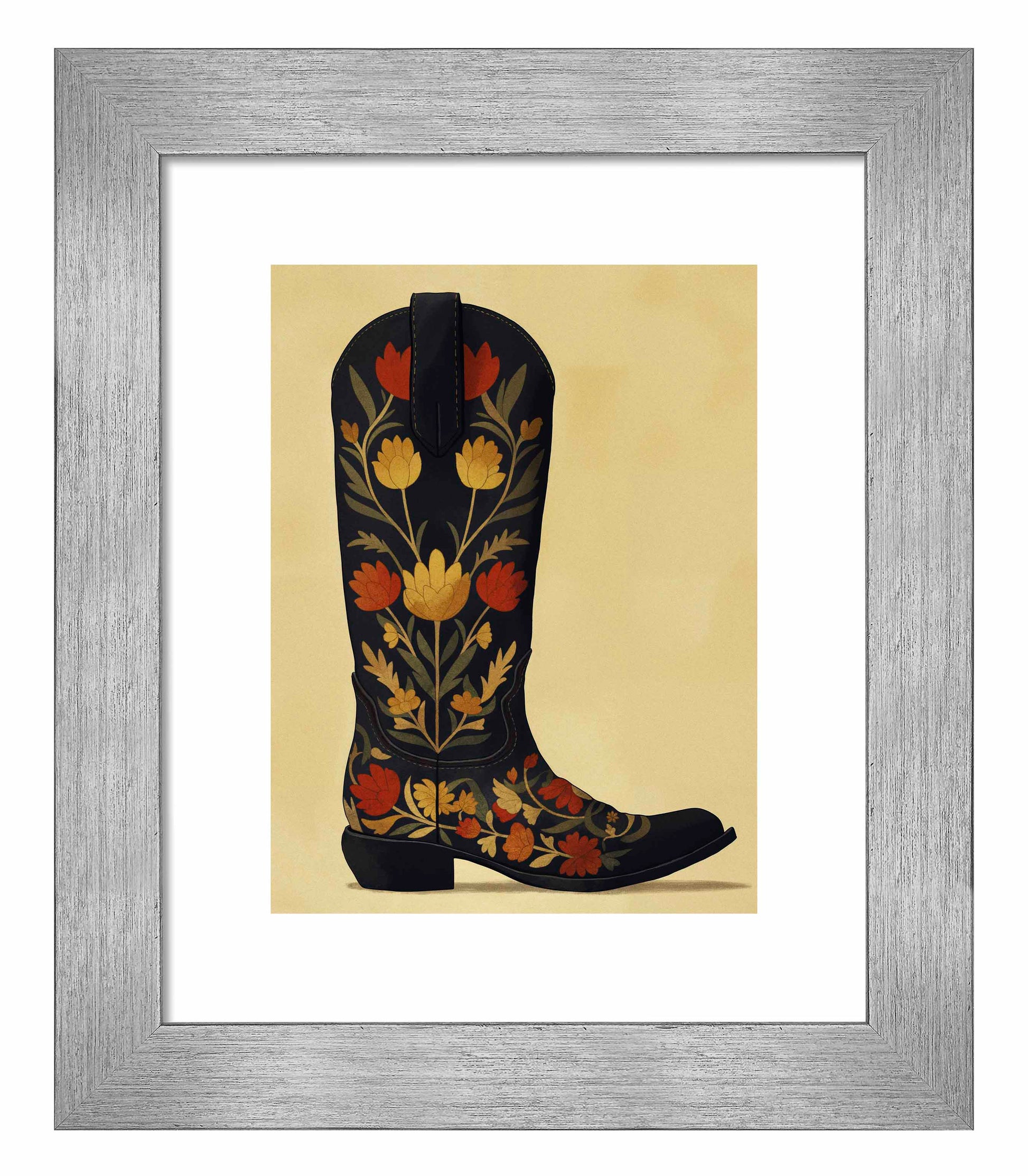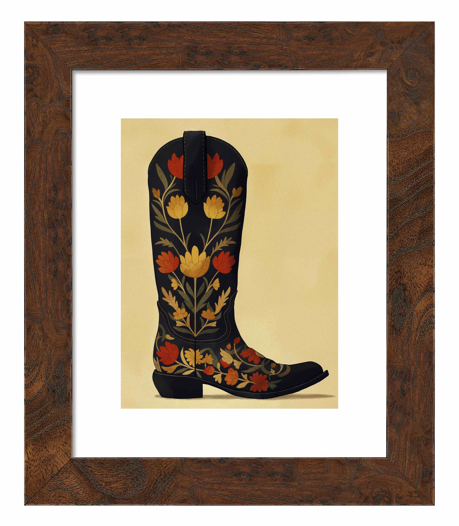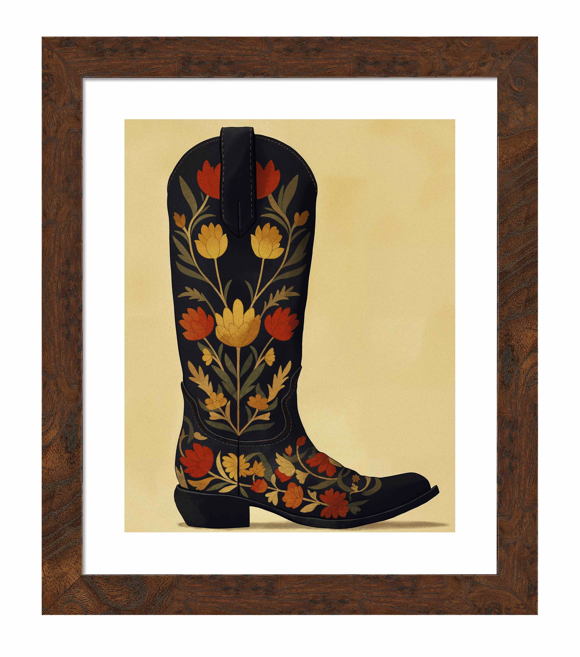 "Pecos River Rovers" features a beautifully detailed cowboy boot, set against a soft, warm beige background. The boot itself is a deep black, providing a striking contrast to the vibrant floral patterns that decorate its surface. Adorning the boot are motifs of bold yellow and red flowers intertwined with olive-green leaves, arranged in a symmetrical pattern that runs from the top to the toe. The floral designs, with their rounded petals and flowing leaves, give the boot a dynamic yet balanced appearance, evoking a sense of natural elegance and Western charm.