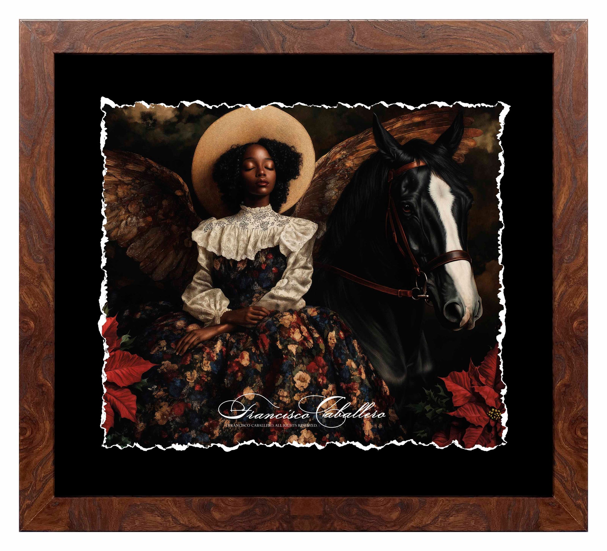 This serene painting captures an angelic figure with golden wings and a tranquil expression, seated gracefully beside a black horse. Wearing a floral gown and a wide-brimmed hat, she is framed by vibrant poinsettias and set against a moody, dramatic backdrop, evoking a sense of peace and timeless beauty.
