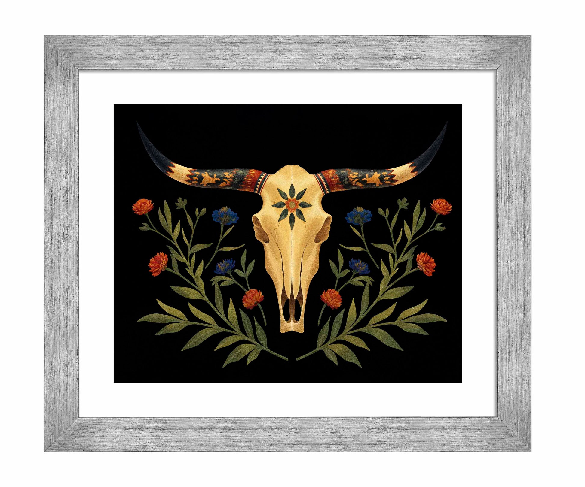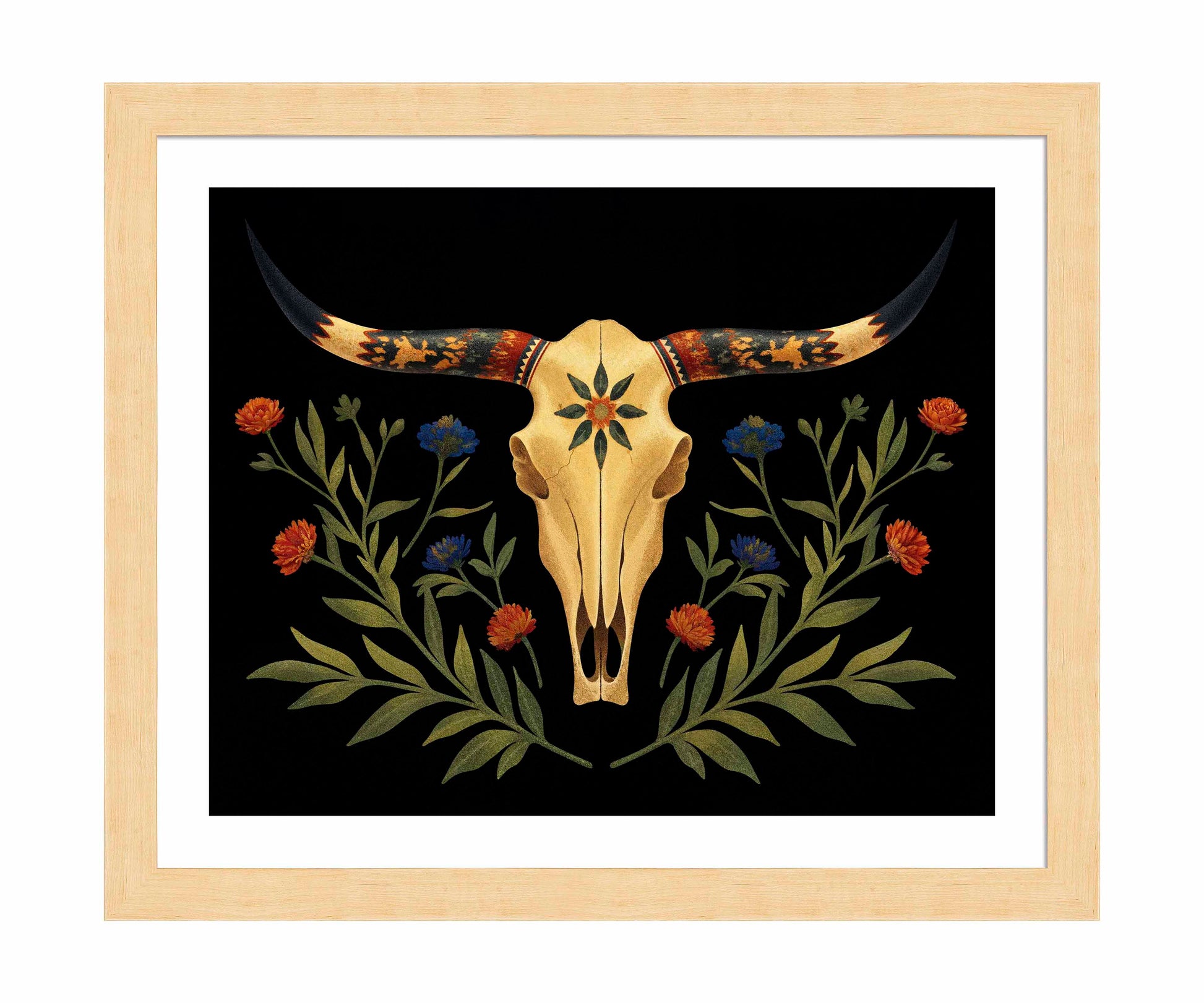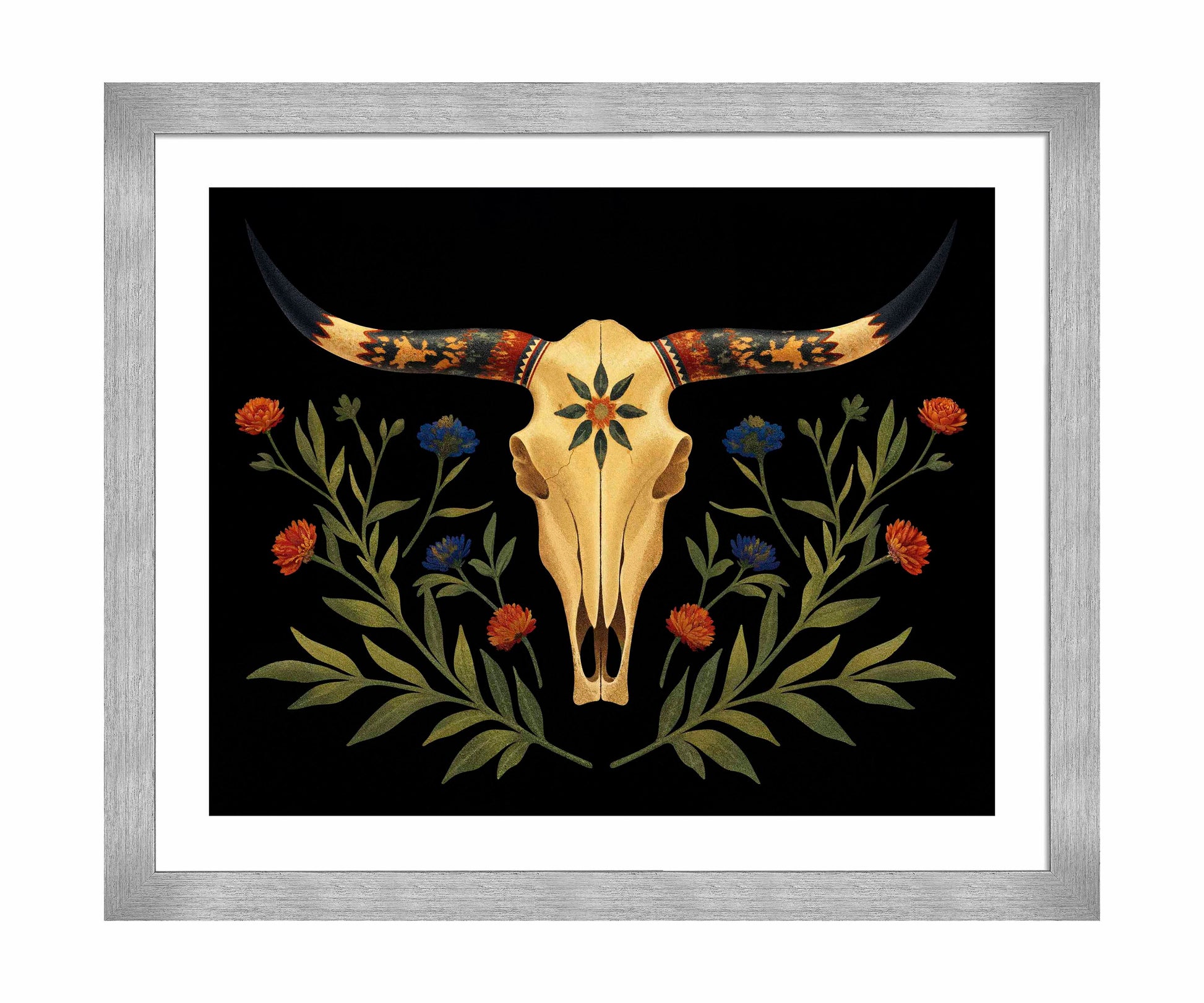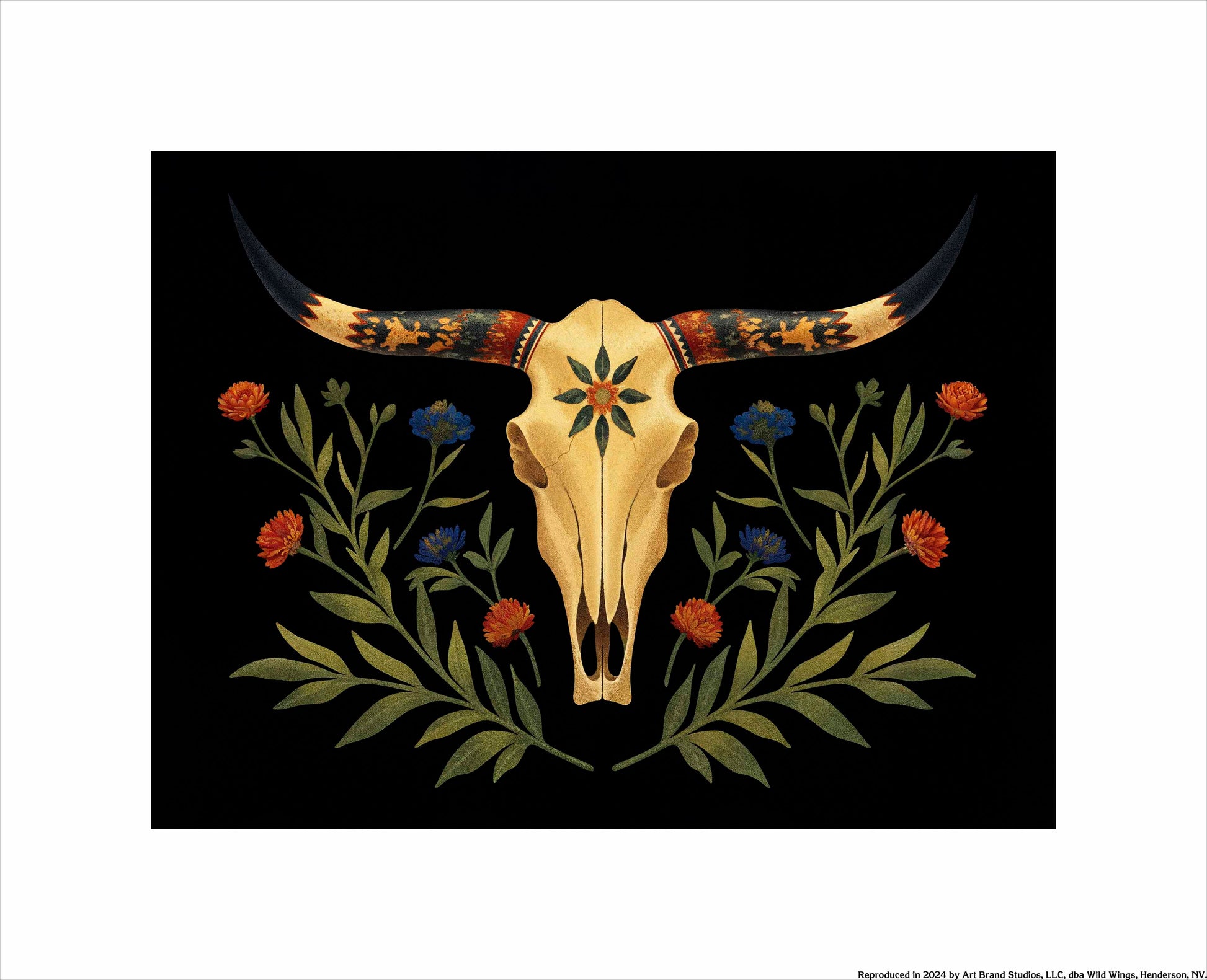 The horns, stretching outward, bear subtle yet vivid patterns that evoke the colors of the prairie at sunset—warm earth tones merging into the fiery hues of twilight. Surrounding the skull are meticulously painted flowers, perhaps marigolds and cornflowers, symbolizing life, death, and the cyclical nature of existence. The greenery adds a sense of vitality, suggesting that even in death, life persists and flourishes.