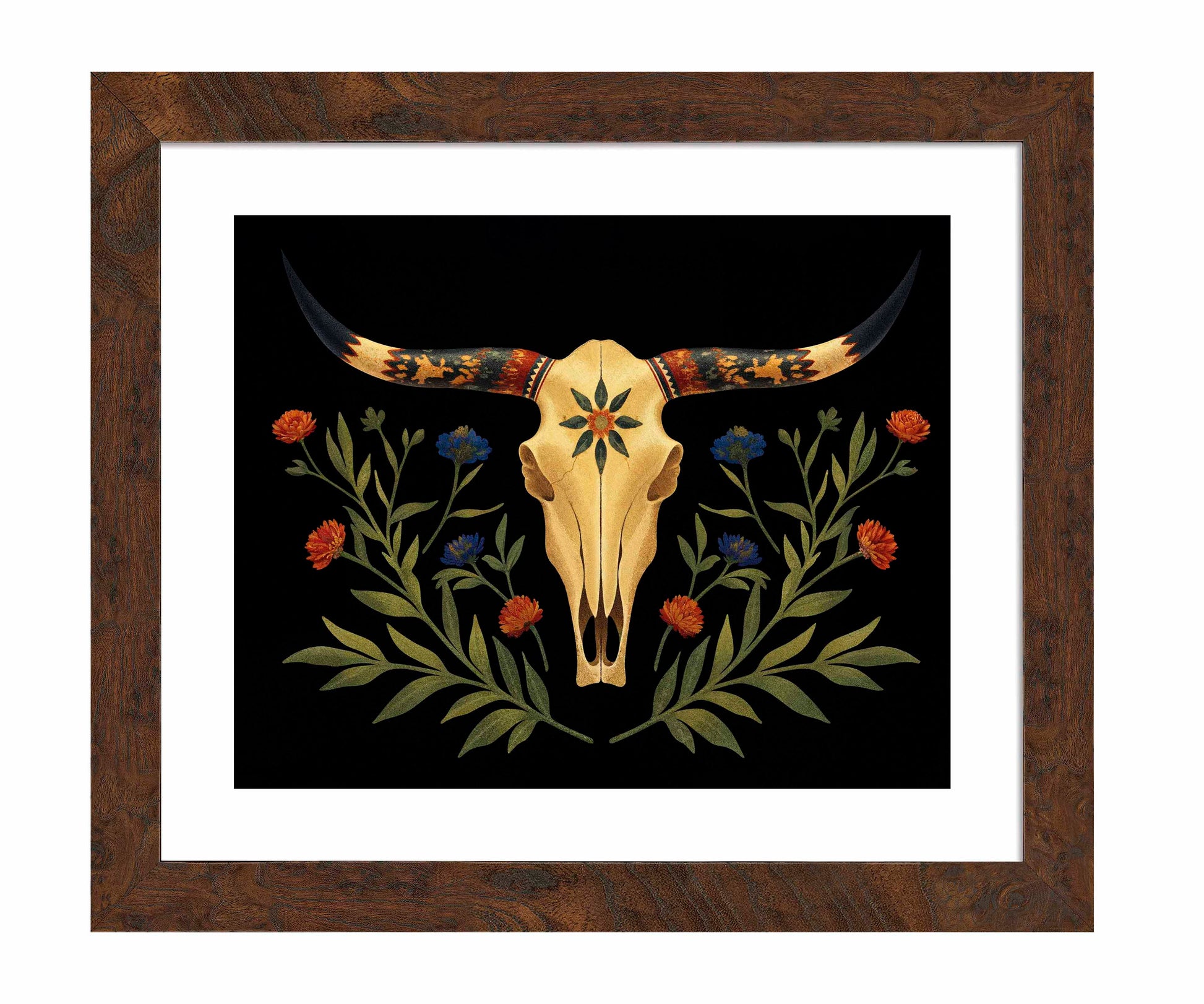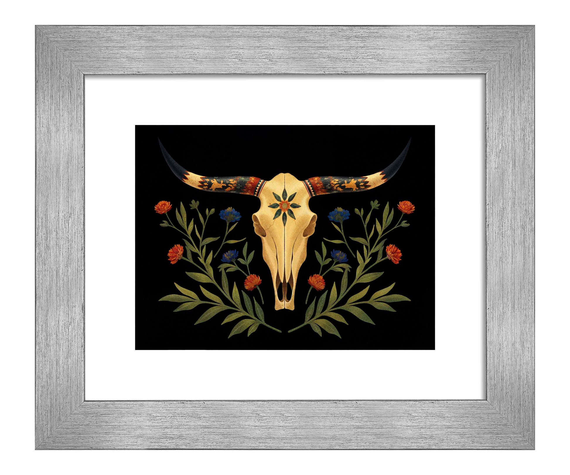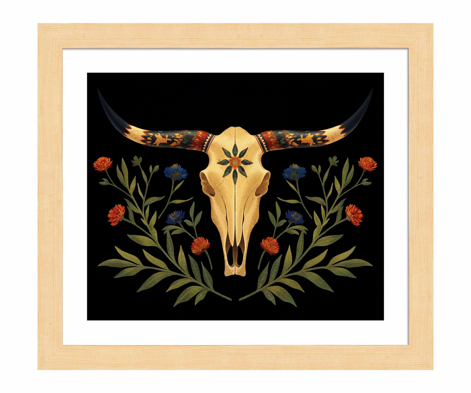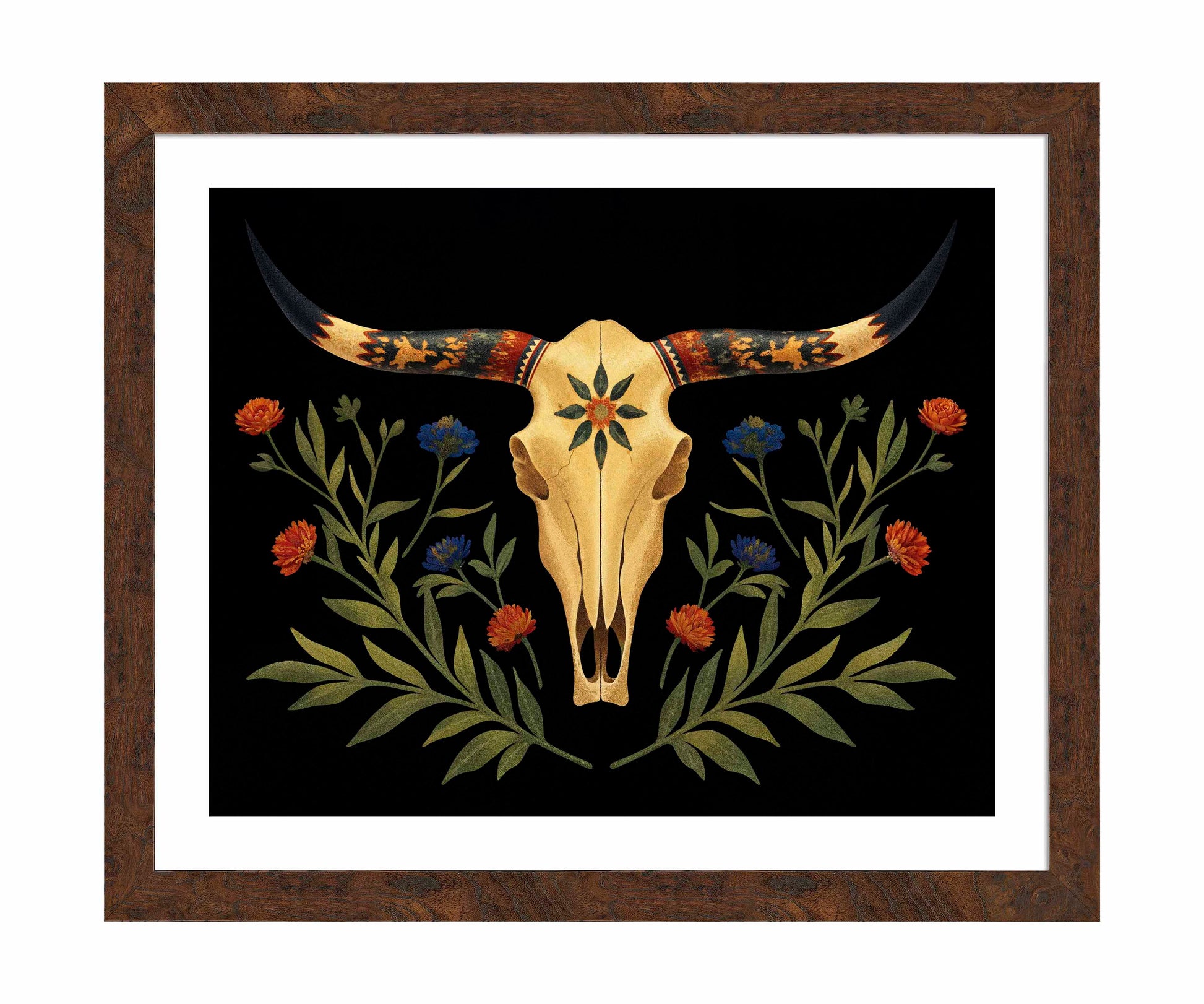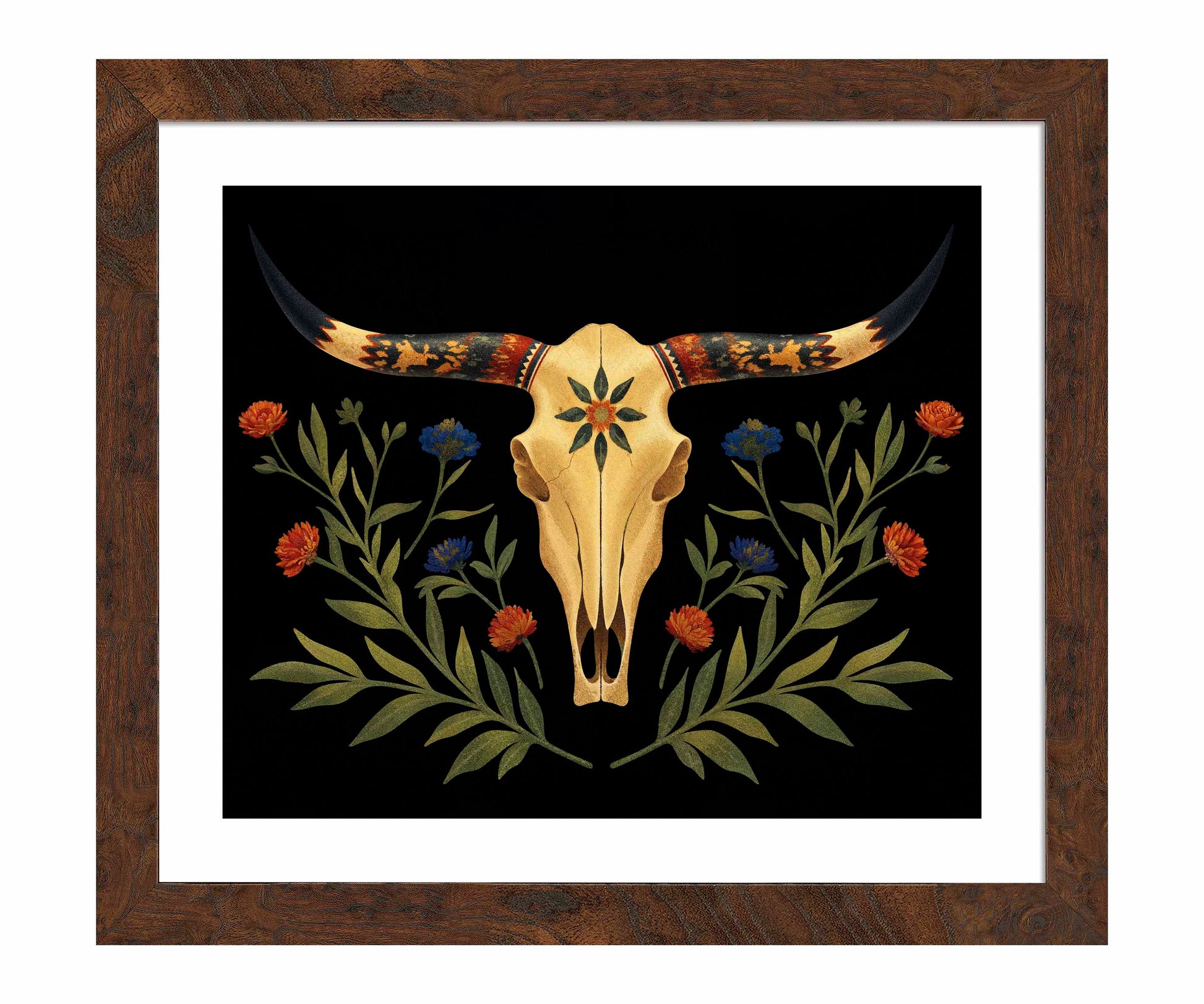 The horns, stretching outward, bear subtle yet vivid patterns that evoke the colors of the prairie at sunset—warm earth tones merging into the fiery hues of twilight. Surrounding the skull are meticulously painted flowers, perhaps marigolds and cornflowers, symbolizing life, death, and the cyclical nature of existence. The greenery adds a sense of vitality, suggesting that even in death, life persists and flourishes.