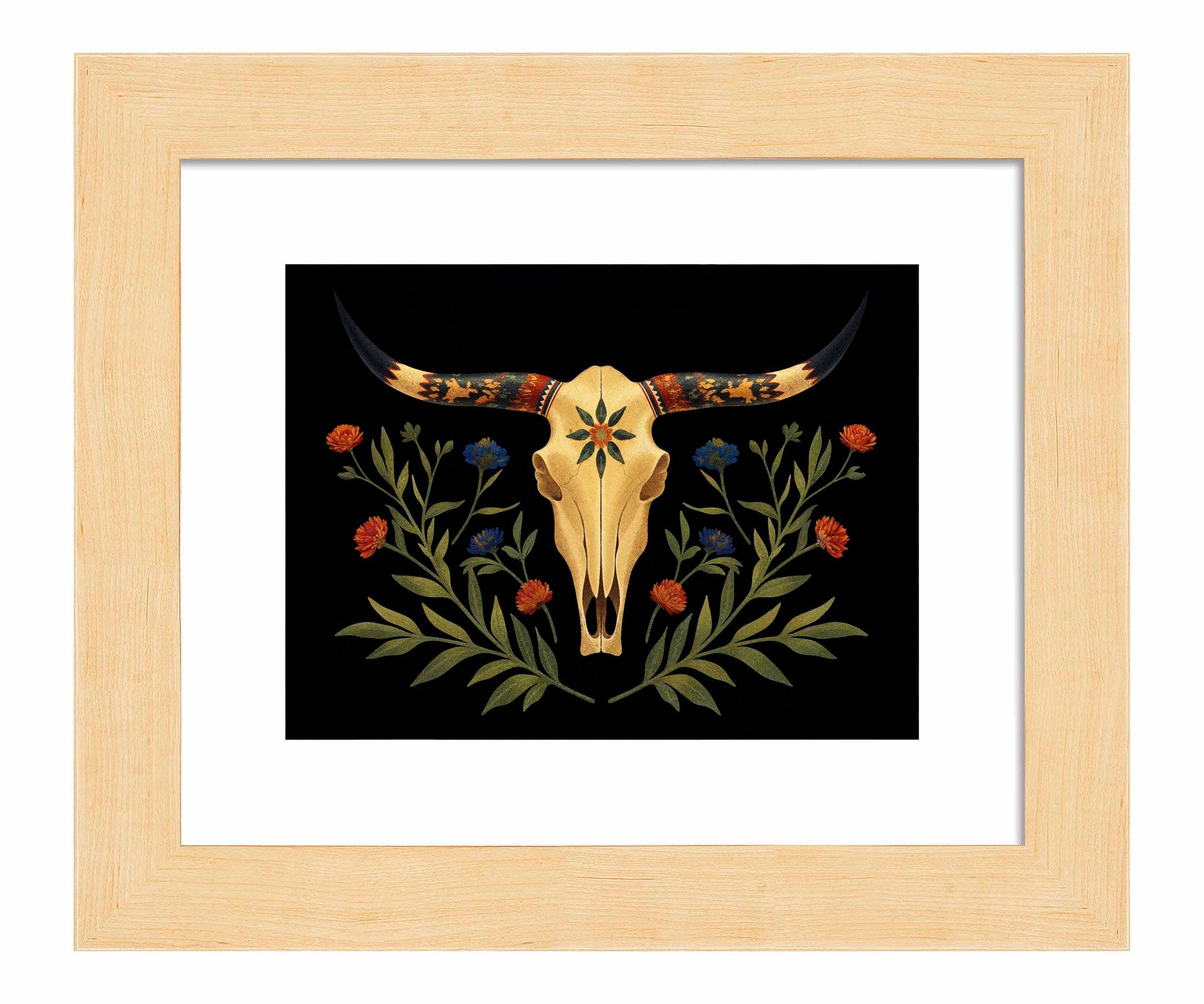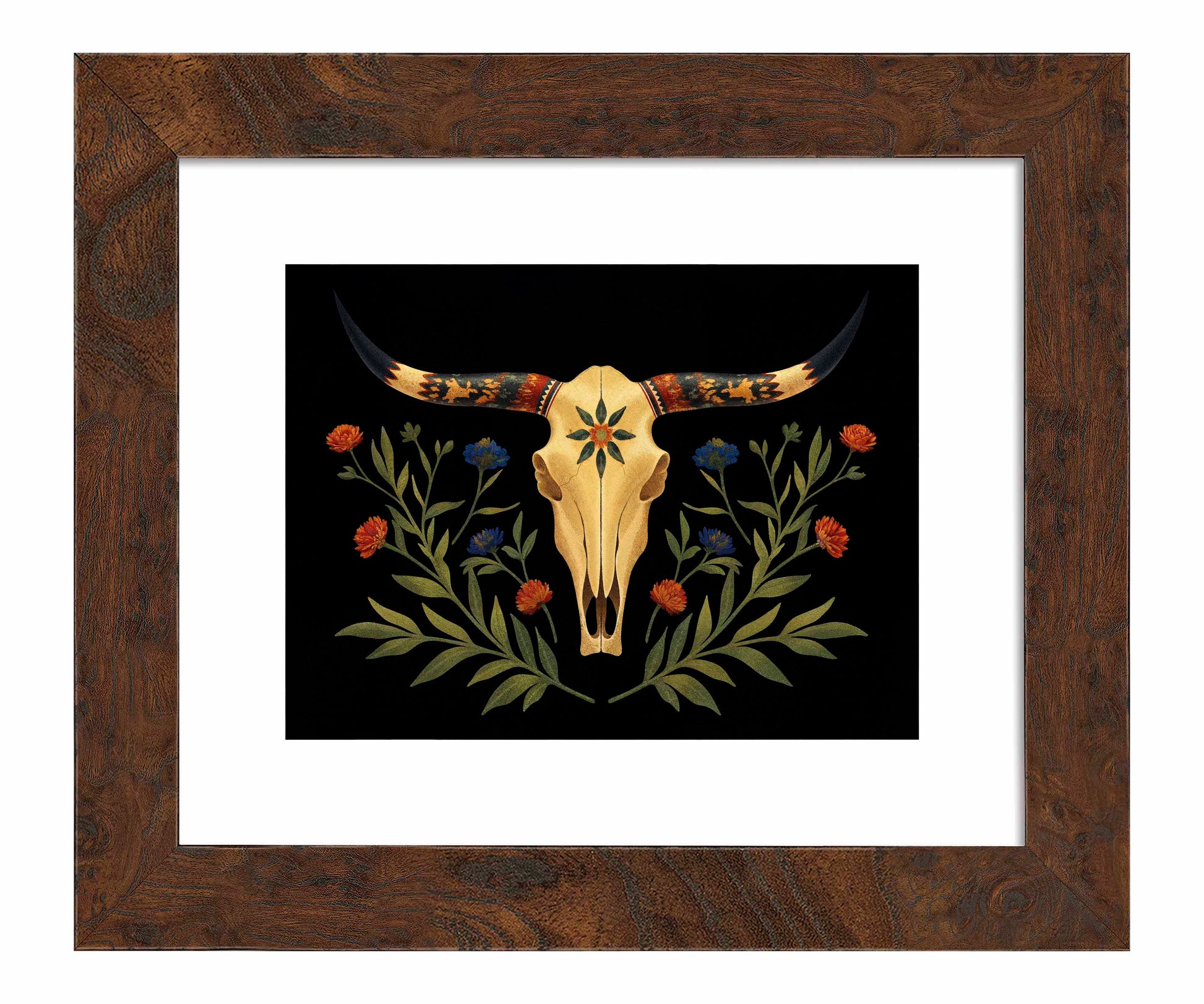 "Prairie Guardian" is an evocative piece that draws inspiration from the spirit and vastness of the American plains. Central to the composition is the skull of a longhorn, a symbol of resilience, strength, and connection to the land. The skull is adorned with an intricate pattern, suggesting a blend of cultural symbolism and a reverence for the natural world.
