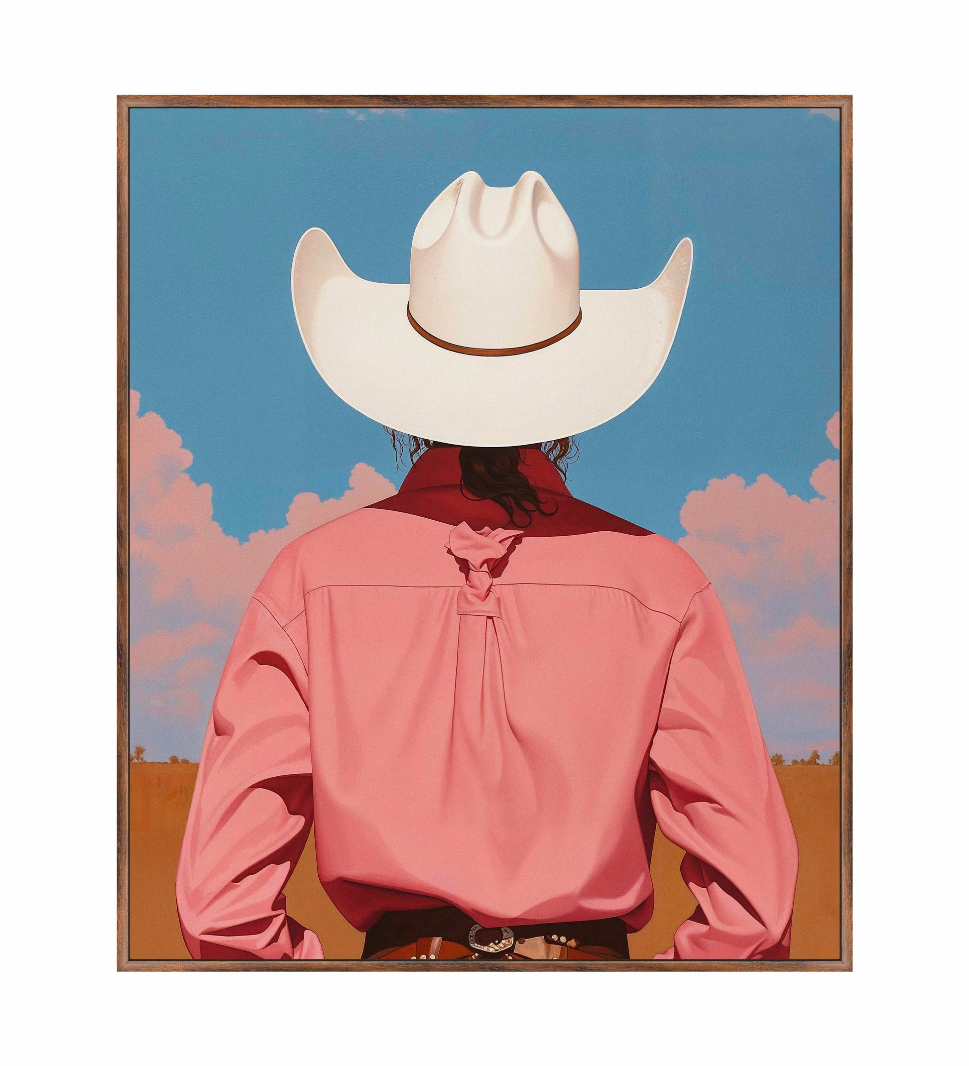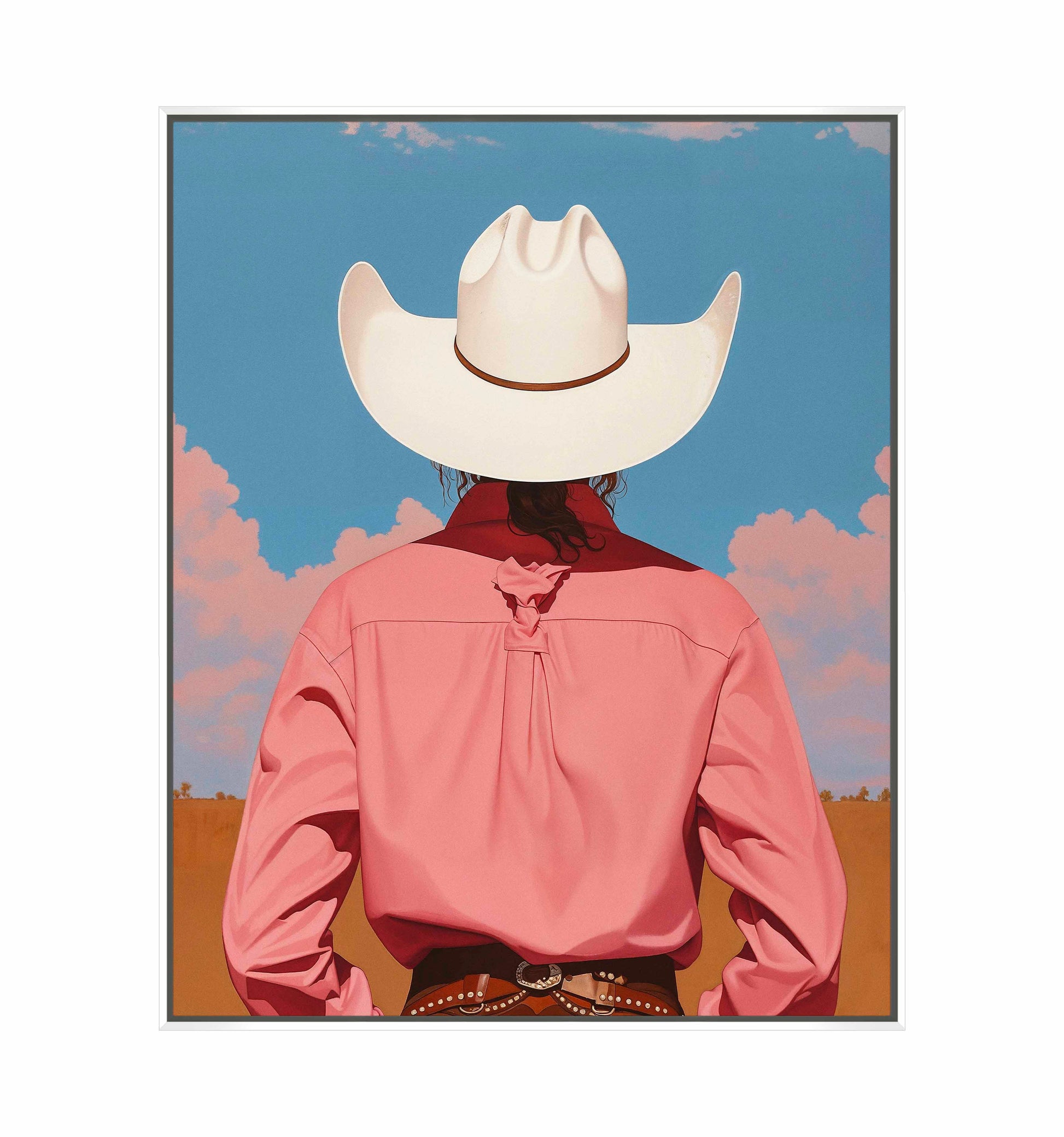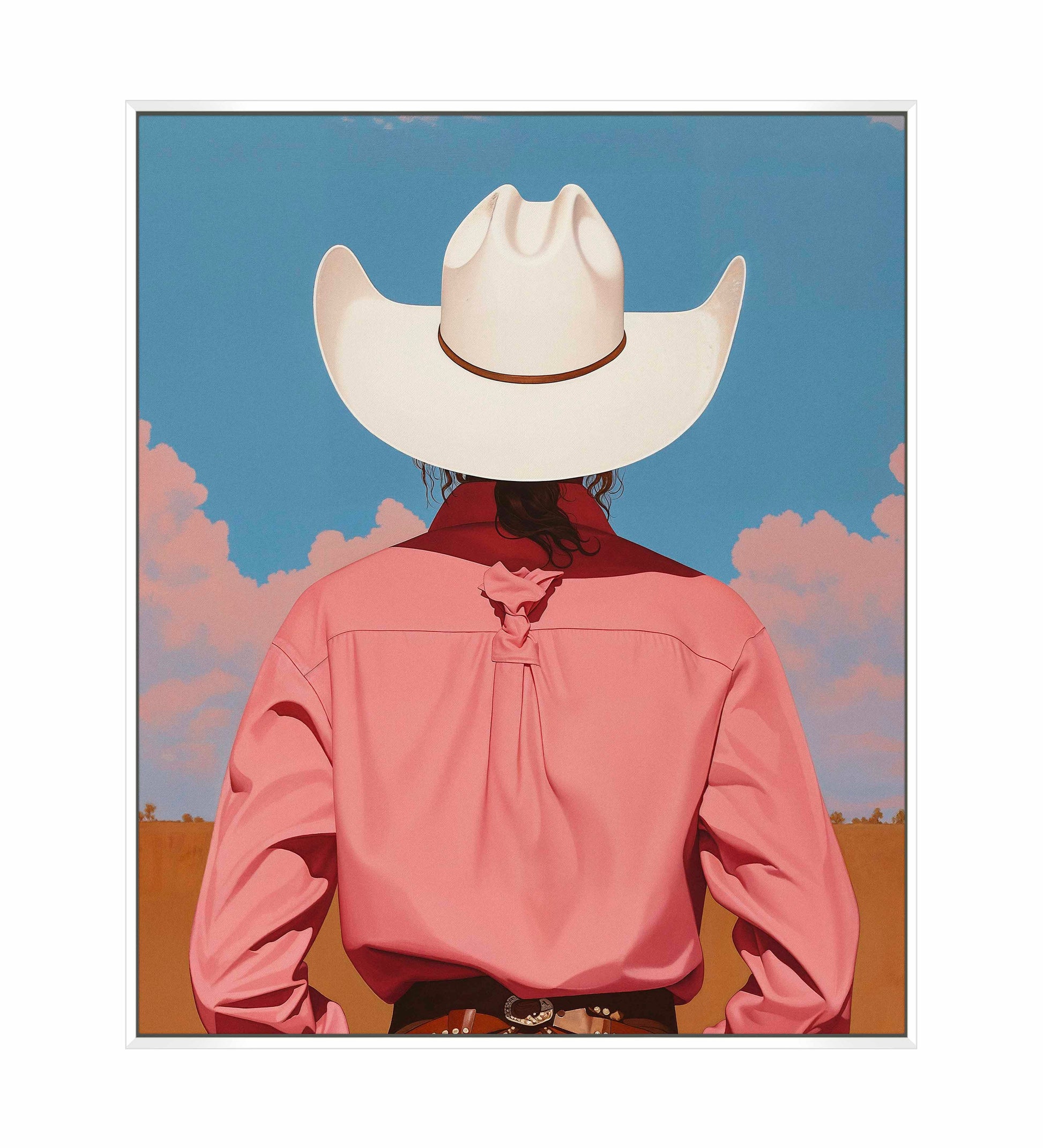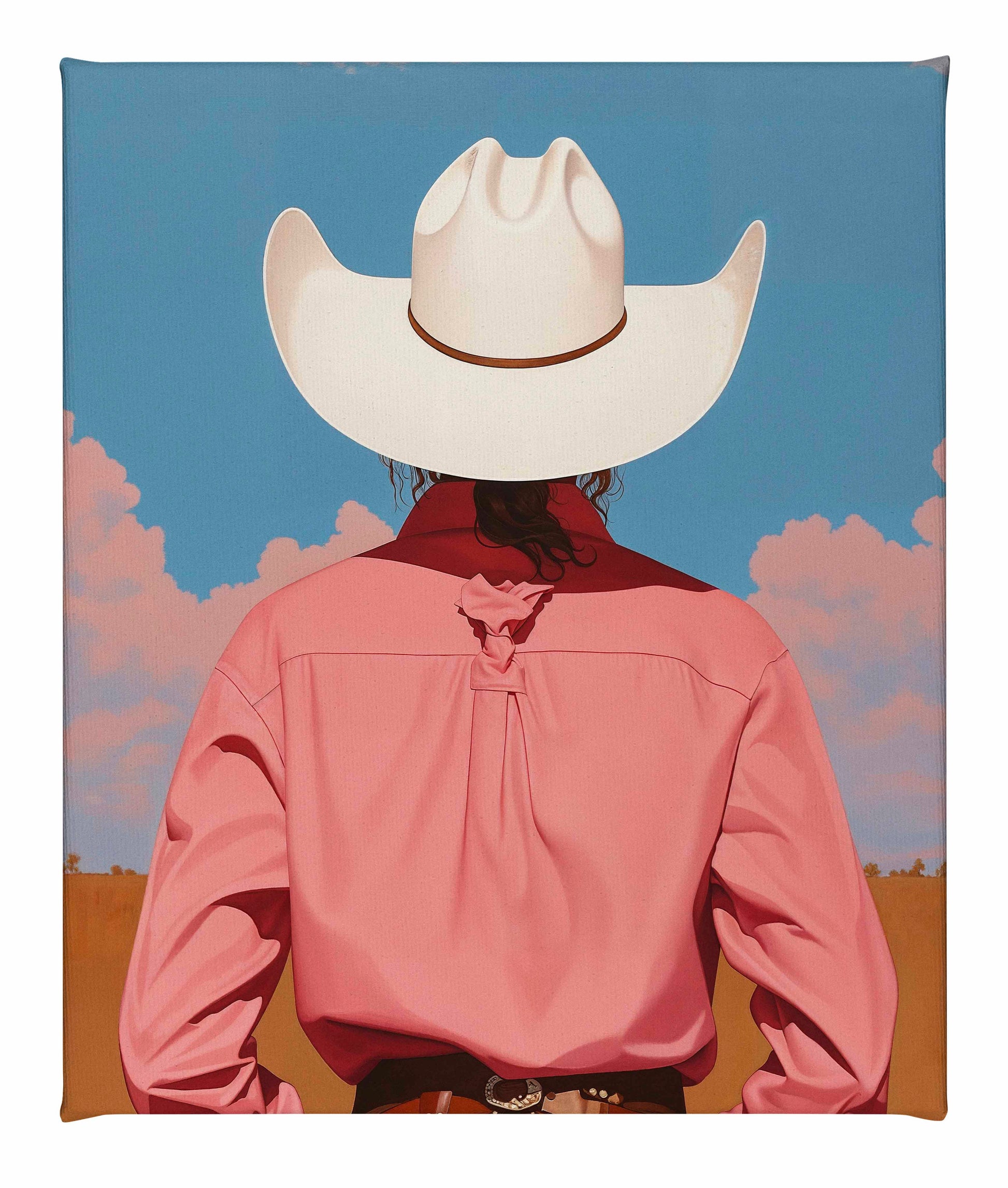 Prairie Rose presents a striking composition centered on the back of a lone cowboy, whose bold pink shirt and white cowboy hat immediately draw the viewer’s attention. The figure stands against a vast, open sky, filled with soft, pastel clouds, suggesting the boundless expanse of the prairie. The choice of a pink shirt, rather than a traditional muted color, evokes a sense of individuality and modern flair while retaining the ruggedness of western wear. The white hat contrasts sharply with the blue sky, emphasizing the figure's presence within the serene yet expansive landscape. The overall mood of the painting conveys a sense of quiet contemplation and strength, with the cowboy’s posture—hands on hips—suggesting resilience and confidence. Through this visual narrative, the artist blends elements of classic Western iconography with a contemporary, vibrant color palette, creating a portrait that celebrates both tradition and individuality in the American West.