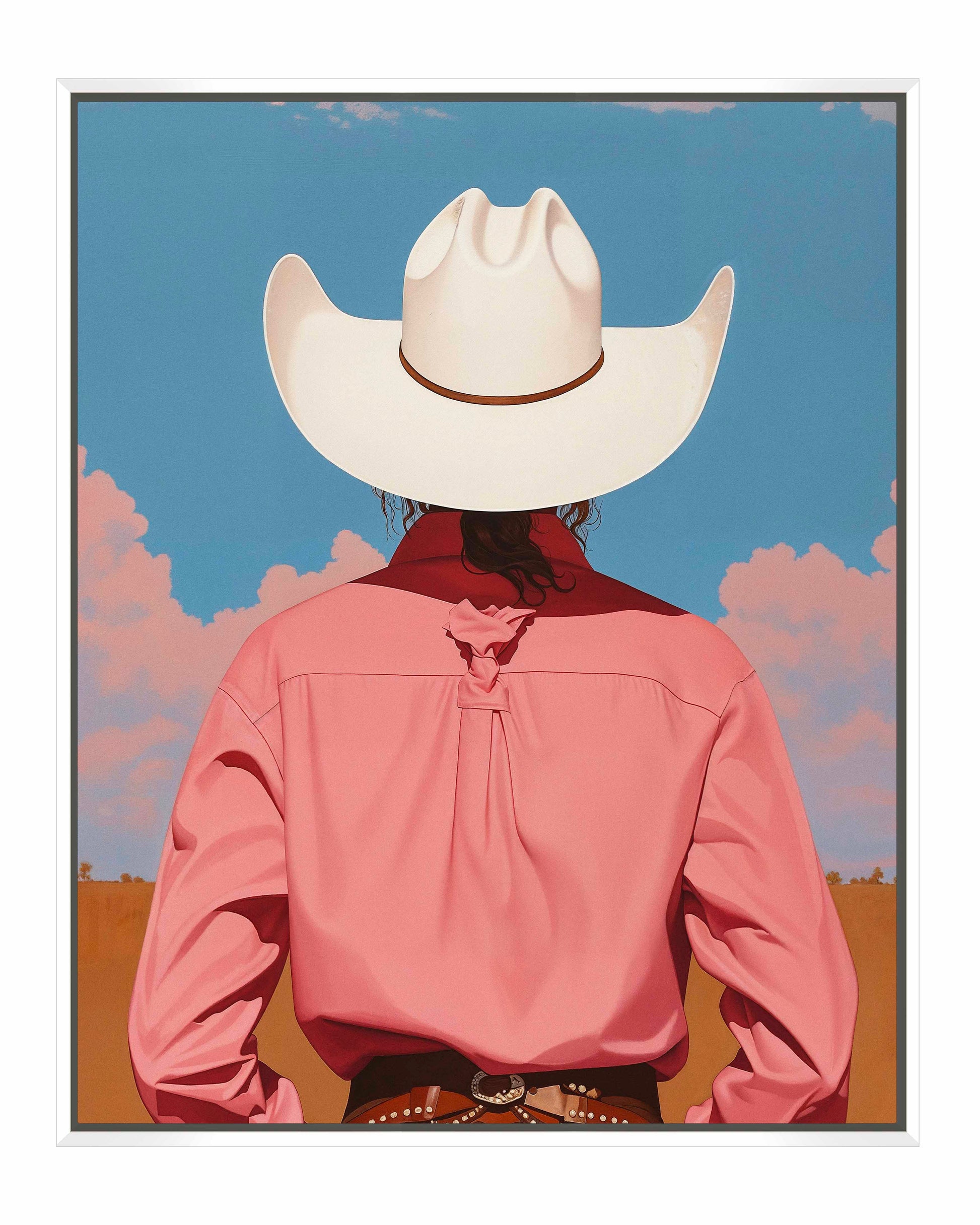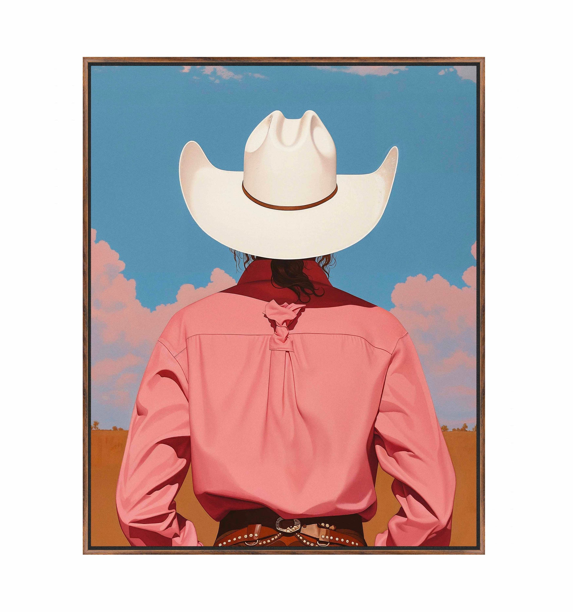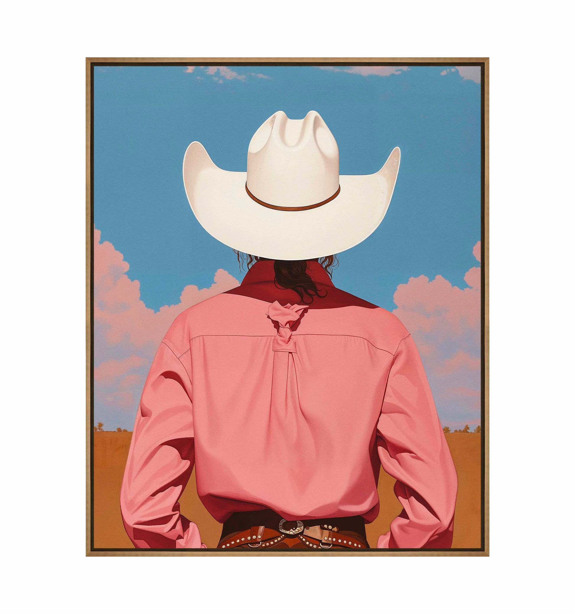 Prairie Rose presents a striking composition centered on the back of a lone cowboy, whose bold pink shirt and white cowboy hat immediately draw the viewer’s attention. The figure stands against a vast, open sky, filled with soft, pastel clouds, suggesting the boundless expanse of the prairie. The choice of a pink shirt, rather than a traditional muted color, evokes a sense of individuality and modern flair while retaining the ruggedness of western wear. The white hat contrasts sharply with the blue sky, emphasizing the figure's presence within the serene yet expansive landscape. The overall mood of the painting conveys a sense of quiet contemplation and strength, with the cowboy’s posture—hands on hips—suggesting resilience and confidence. Through this visual narrative, the artist blends elements of classic Western iconography with a contemporary, vibrant color palette, creating a portrait that celebrates both tradition and individuality in the American West.