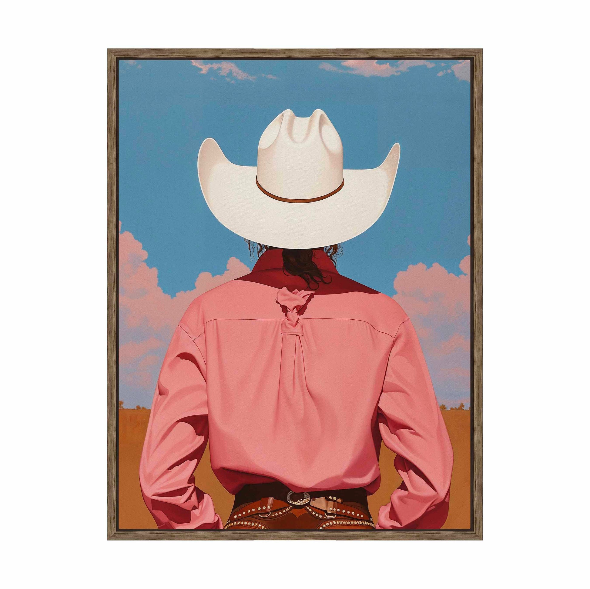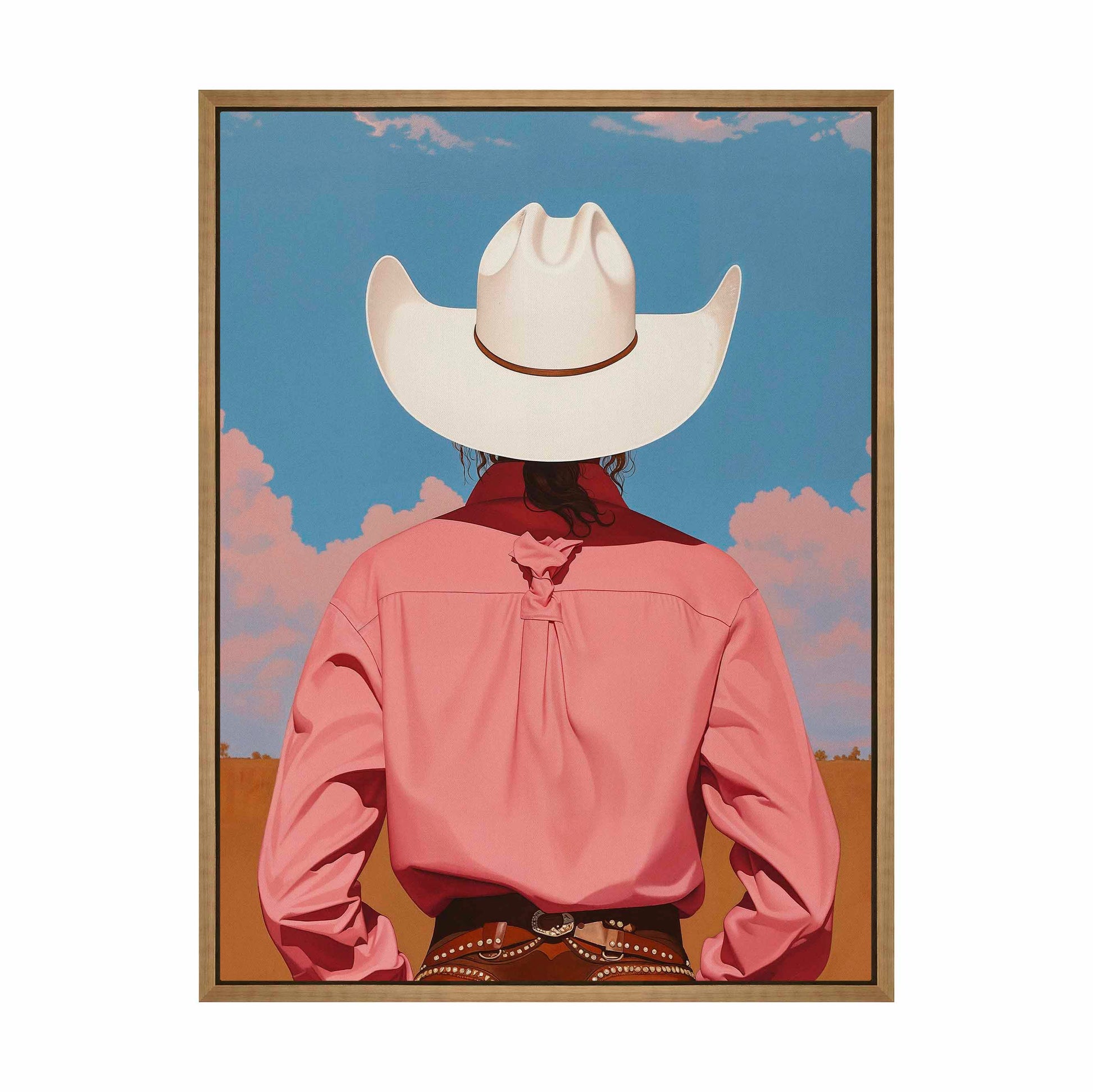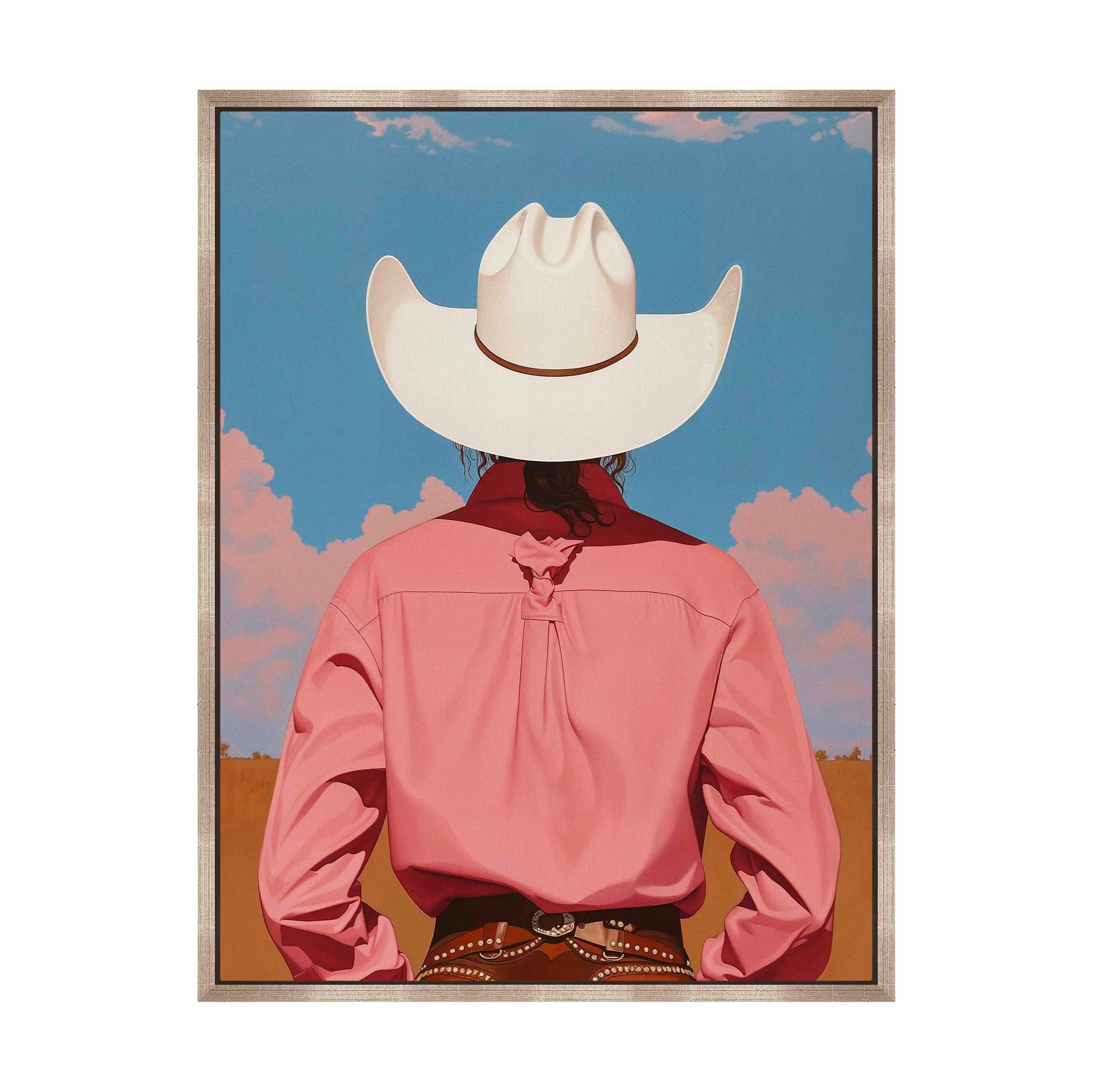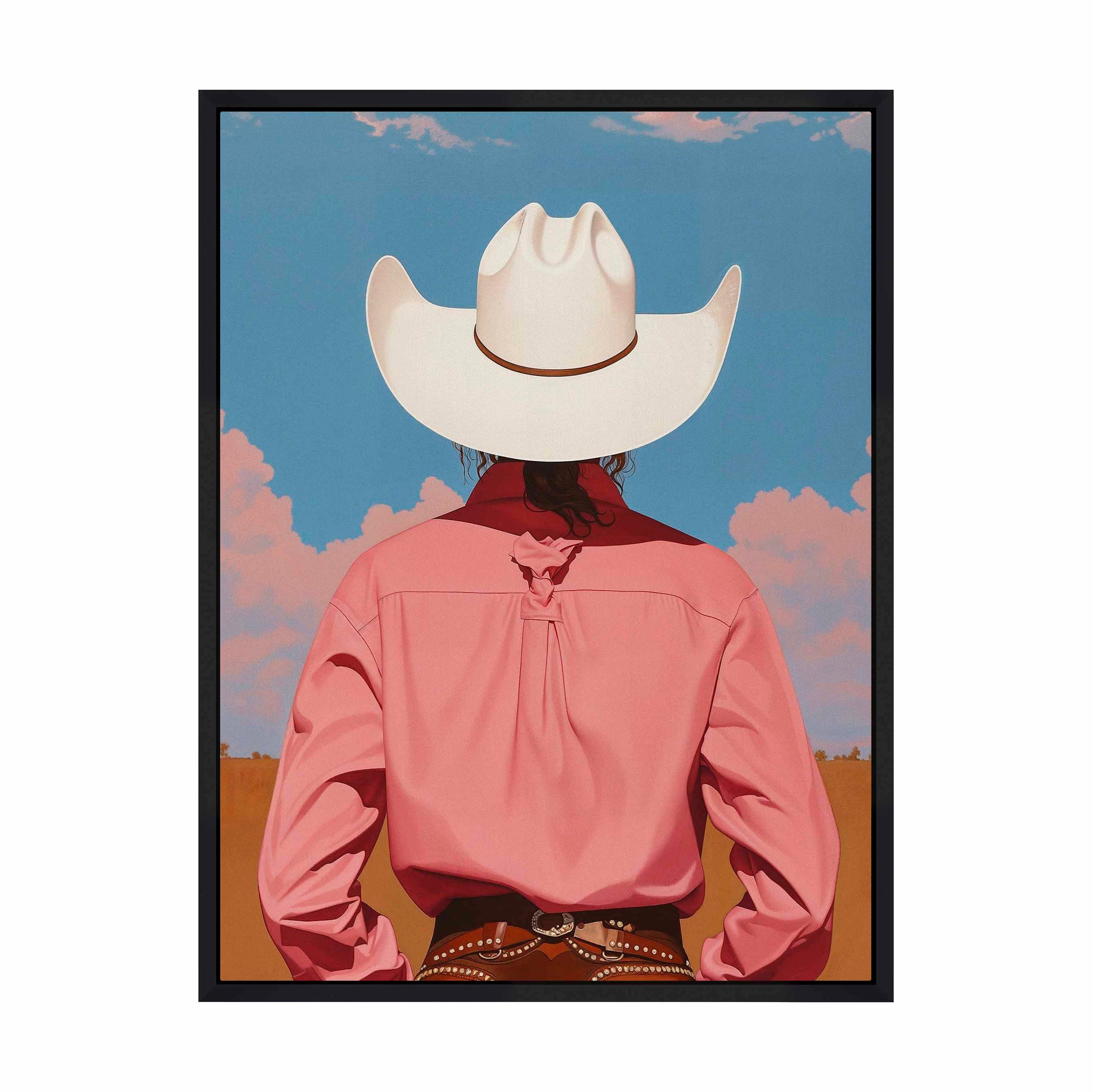 Prairie Rose presents a striking composition centered on the back of a lone cowboy, whose bold pink shirt and white cowboy hat immediately draw the viewer’s attention. The figure stands against a vast, open sky, filled with soft, pastel clouds, suggesting the boundless expanse of the prairie. The choice of a pink shirt, rather than a traditional muted color, evokes a sense of individuality and modern flair while retaining the ruggedness of western wear. The white hat contrasts sharply with the blue sky, emphasizing the figure's presence within the serene yet expansive landscape. The overall mood of the painting conveys a sense of quiet contemplation and strength, with the cowboy’s posture—hands on hips—suggesting resilience and confidence. Through this visual narrative, the artist blends elements of classic Western iconography with a contemporary, vibrant color palette, creating a portrait that celebrates both tradition and individuality in the American West.