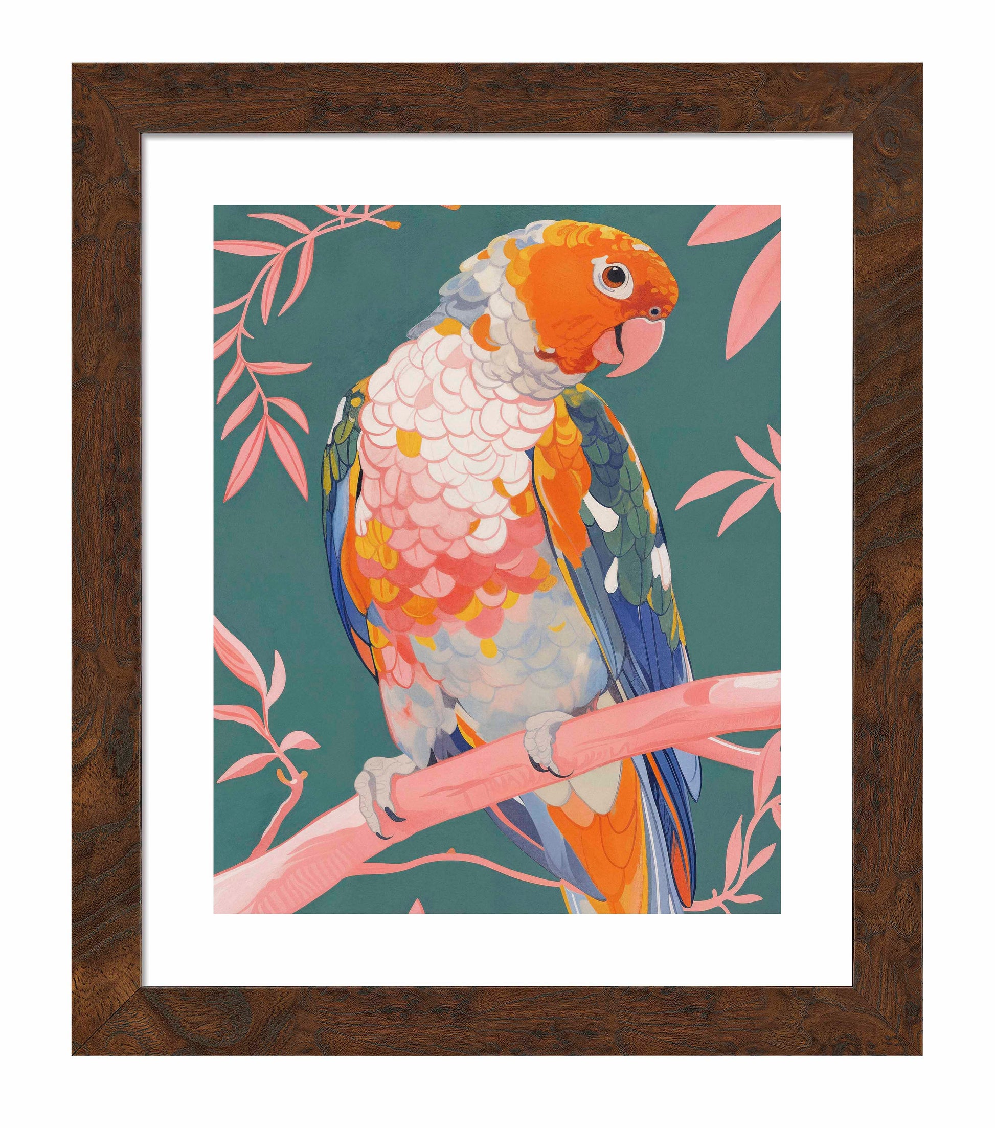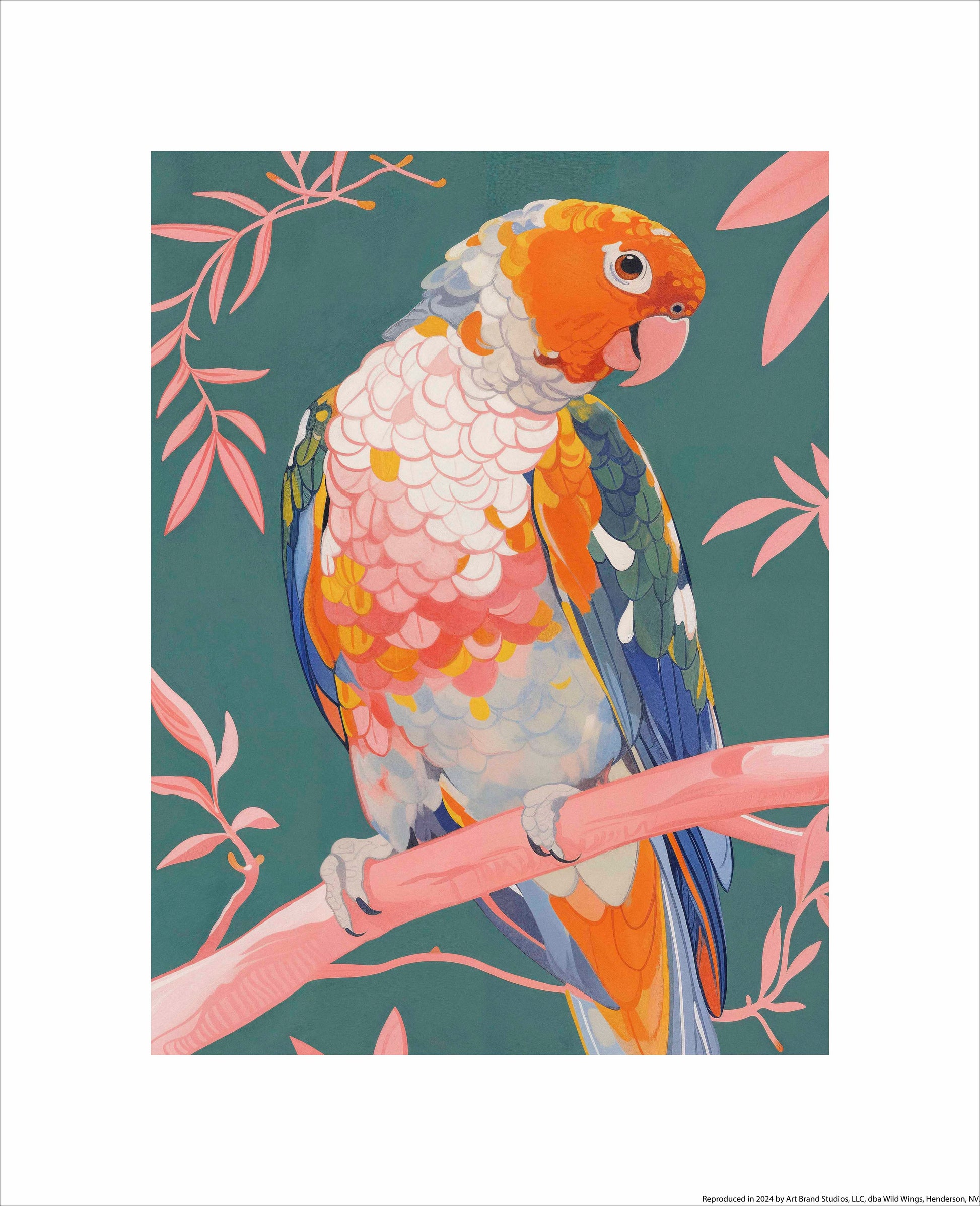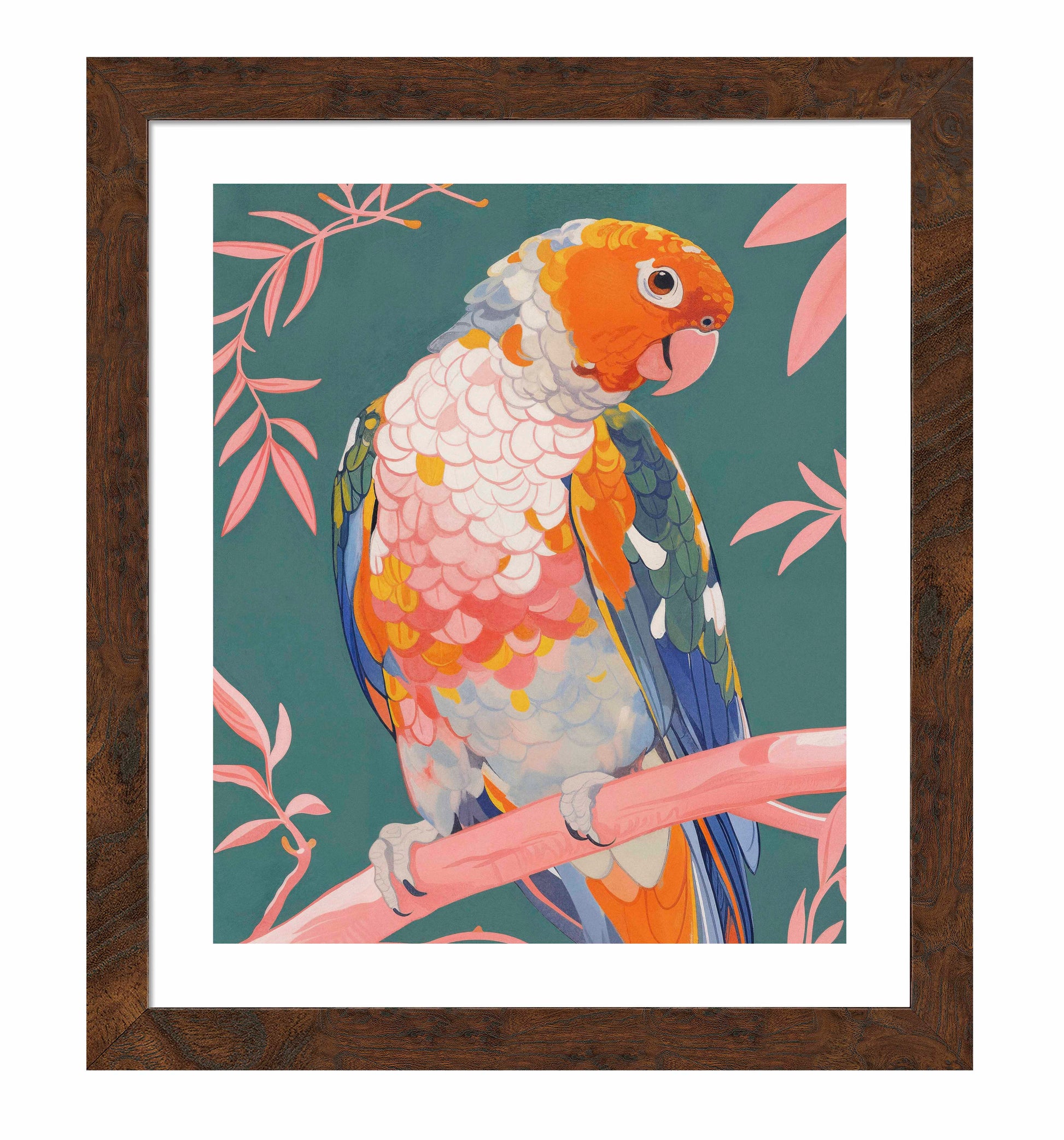 Prismatic Perch - Sun Conure in Dreamy Grove is a dazzling celebration of color and natural beauty, featuring a vibrant Sun Conure perched amidst a whimsical array of leaves and branches. The Sun Conure's plumage, a radiant mix of oranges, yellows, greens, and blues, creates a stunning visual contrast against the serene teal background and soft pink foliage.This fun painting invites viewers to immerse themselves in a world of vibrant color and joyful energy. Perfect for art lovers and bird enthusiasts, this painting adds a burst of tropical charm and a sense of wonder to any space.