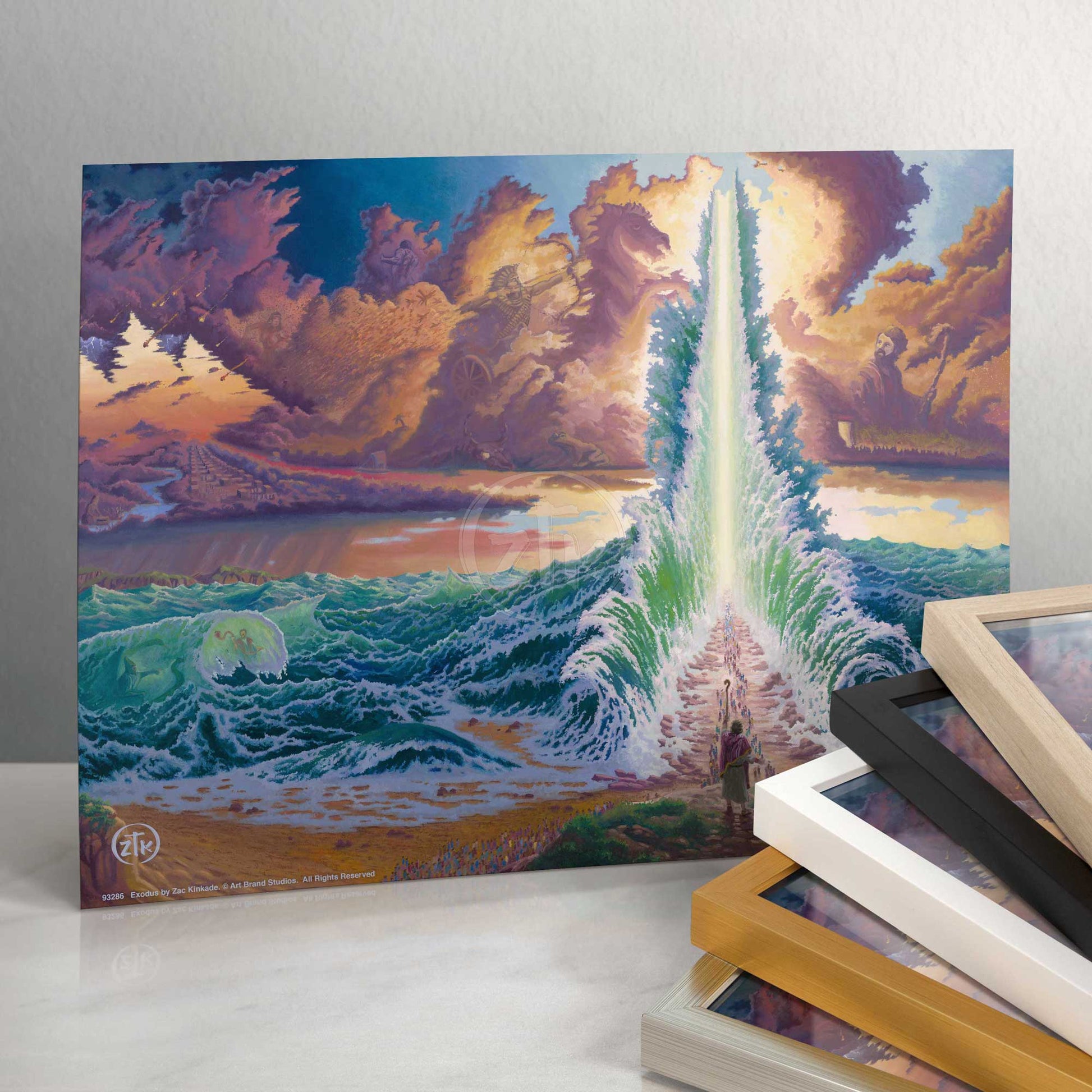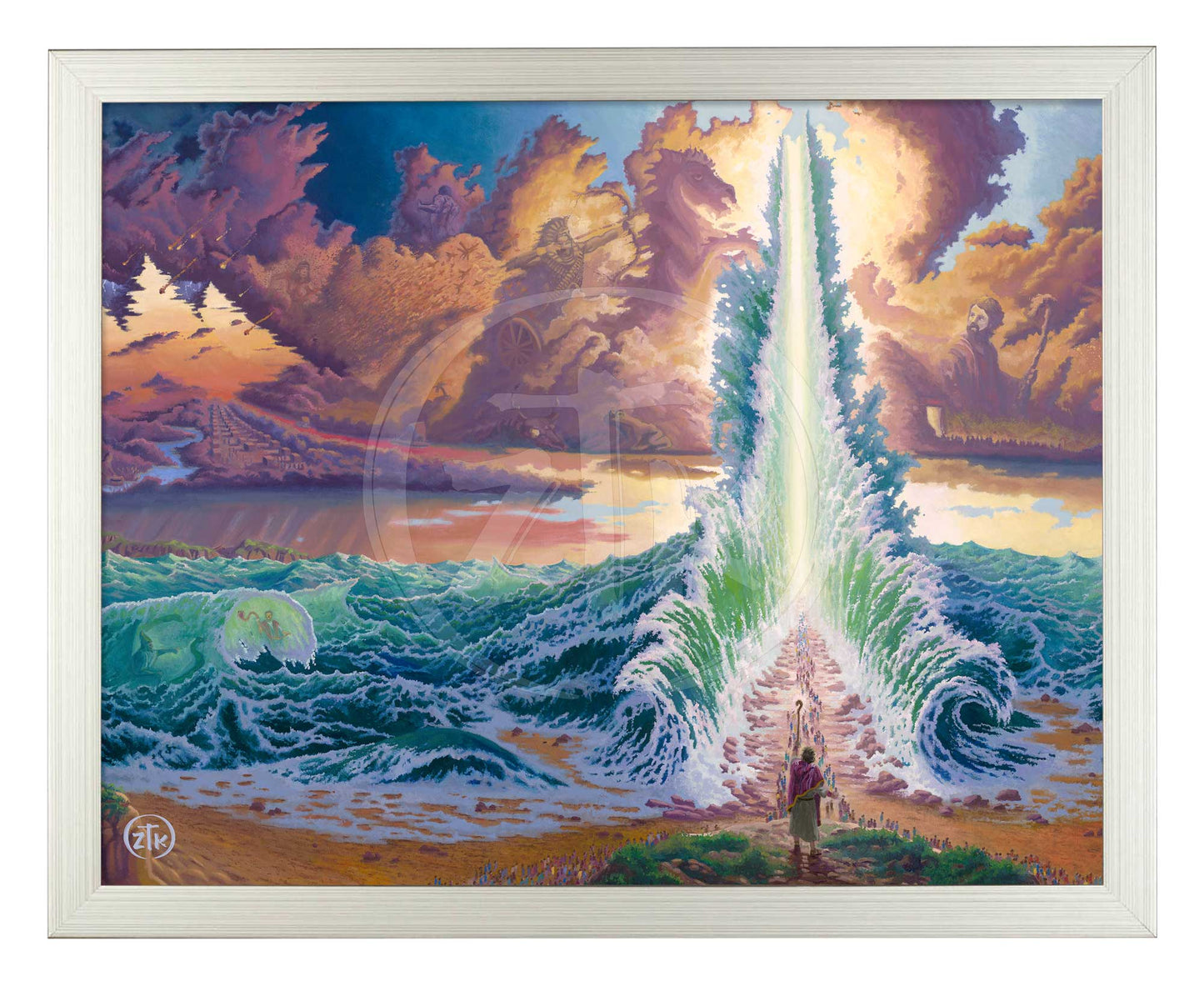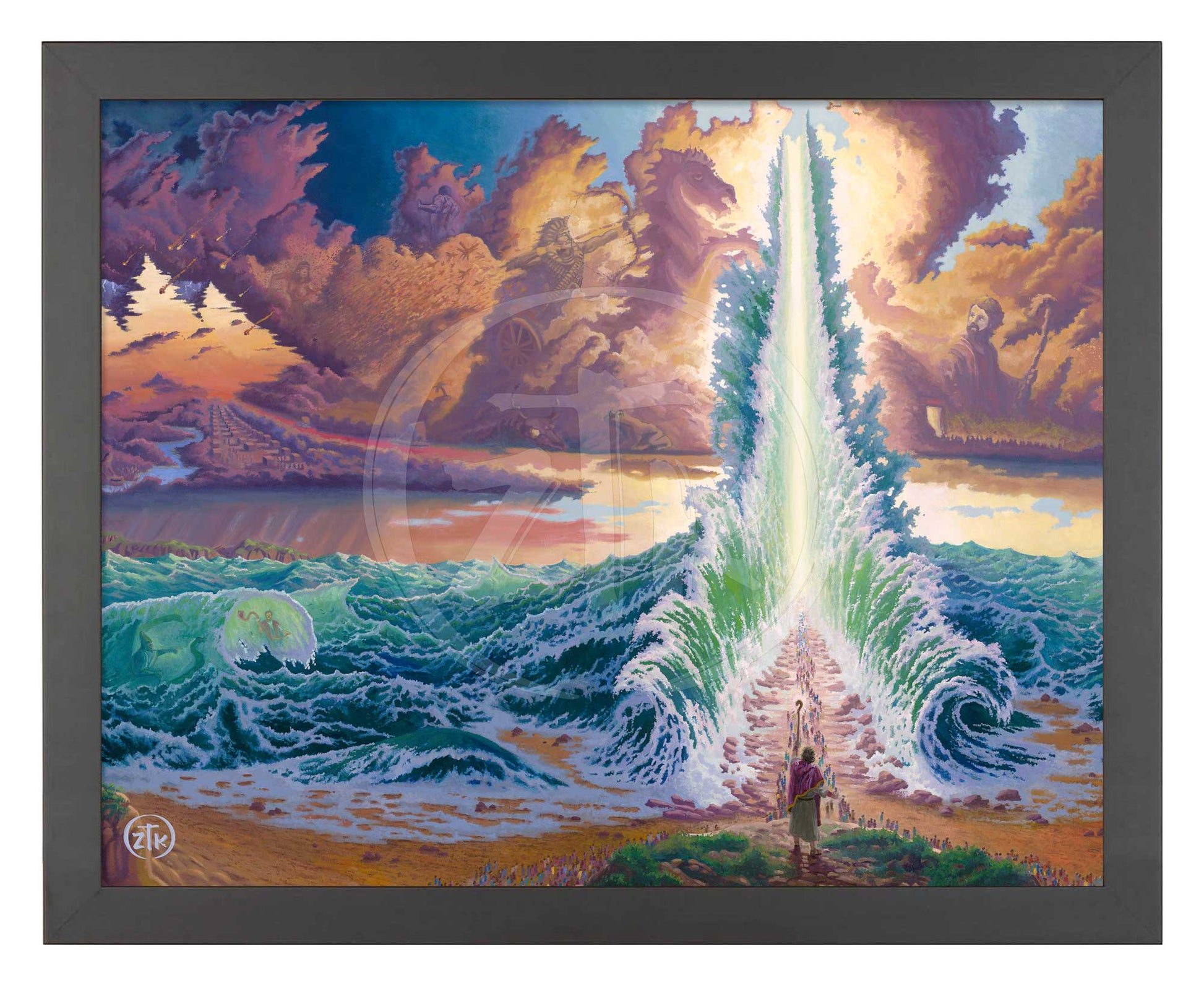 The story of Exodus is one of the most powerfully moving narratives in the Bible and, indeed, one of the most important readings in all of world culture. It touches on many of the most important themes of Judeo-Christian belief and gives them to the reader in a very dramatic and easily visualized manner. The importance of covenant, the promise of salvation, and the proof of an ever-present God are all revealed in this magnificent tale. It is my hope that through this painting these foundational ideas are made apparent and feed the spiritual growth of those who view it. It is also the case that I wanted to tell the story of Exodus in full. From the finding of a baby in a basket in the reeds along the shore of the Nile to the moment God provided his Commandments on Mount Sinai, the entire tale is told. Look to the turbulent waves and the rolling clouds and see the many scenes unfold. “Exodus” is the third painting in my Stories of the Bible I series. Look closely and you will find that I pay homage to my first two titles, “Noah” and “Jonah”. The final painting in the group of four, “The Garden of Eden”, is yet to come. I hope you all enjoy my efforts on and my vision for this image and, as always, I want to thank you all for sharing my adventure in art.