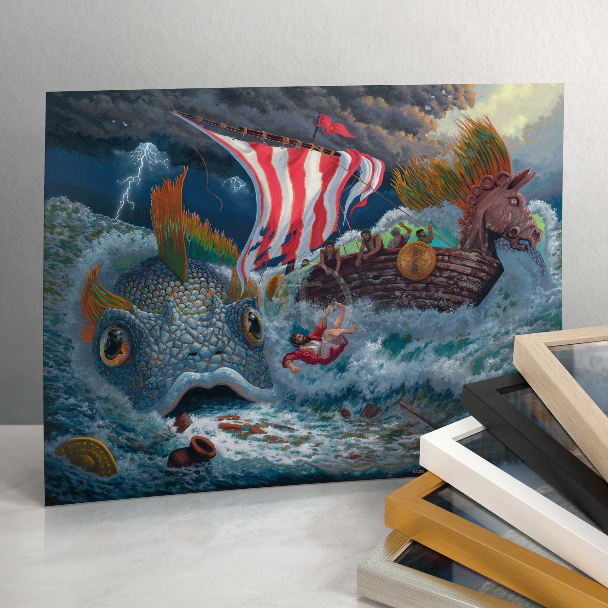 The Book of Jonah is a biblical volume that is full of narrative wonder and to my mind’s eye, one which creates the potential for dramatic and moving visual interpretations. It is a text that relays themes that are essential to the Christian faith and the Bible. It gives evidence of the power of an almighty God who can summon a fierce storm at will and raise a miraculous “great fish” form the ocean depths. Yet it is also a tale of God’s mercy and ability to deliver those in peril from the harms and threats that may befall them. I took inspiration for my “Jonah” from many sources. From the master painters of the Renaissance to the illustrators of modern day children’s books, there have been many important and delightful artistic renderings of this text and I enjoyed studying them all. In my painting, the leviathan that God summoned attacks a ship while his storm rages around it. Jonah is cast overboard to meet his fate while those aboard honor God and pray for his mercy. While many have interpreted the story as making reference to a whale, I adopted a more literal approach and created the “great fish” that the Bible verses specifically reference. I hope you all enjoy this second addition to my “Bible stories” collection and I want to thank you all for sharing my adventure in art.