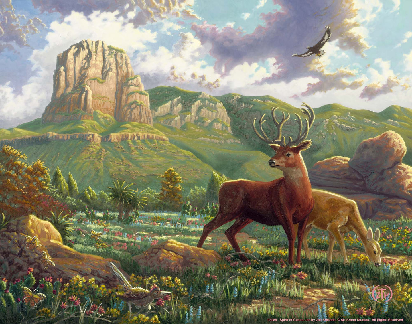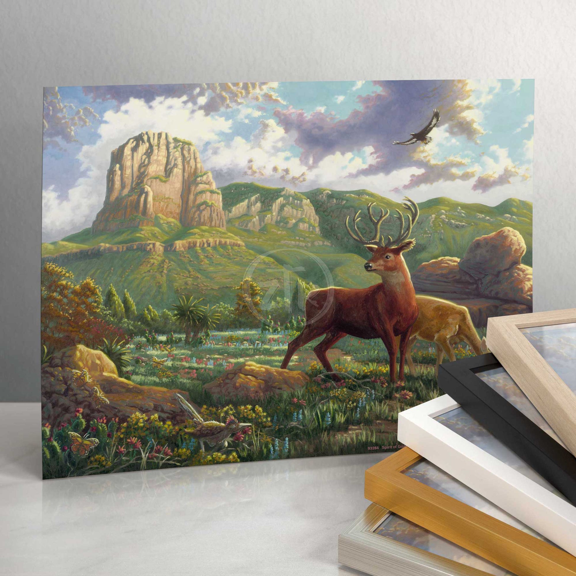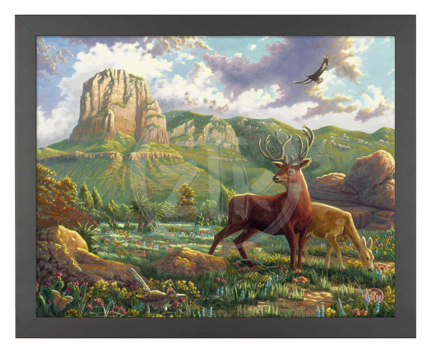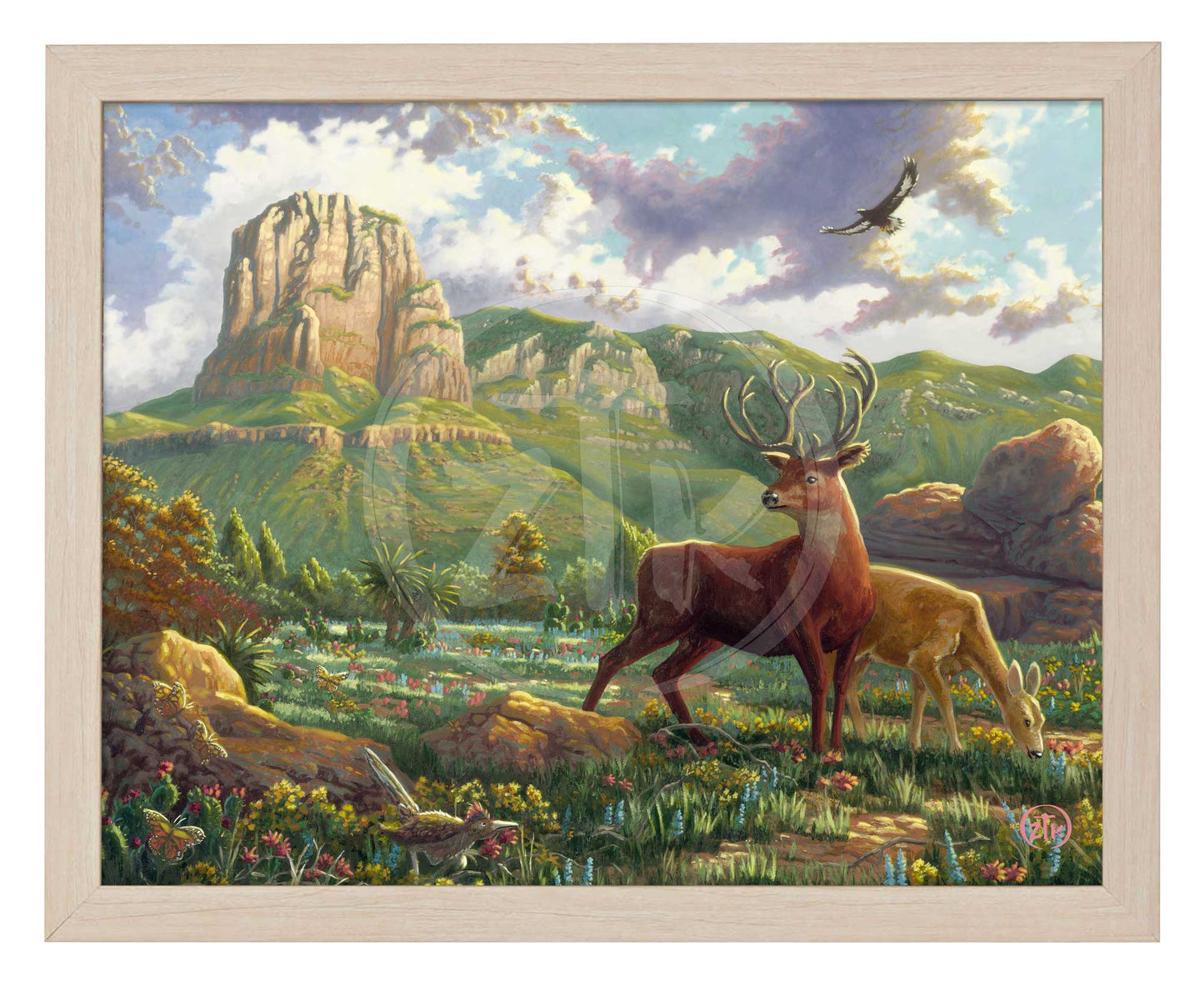 The majesty and beauty of our country’s national parks has long been part of my artistic imagination. Even as a child when I began visiting these untamed places their emotional impact on me was real and profound. Those early transformative experiences were only furthered when I grew to fully appreciate the works of other artists and their interpretations of these natural treasures. Fredrick Church, Albert Bierstadt and, of course, my uncle Thomas Kinkade all came to influence my own efforts in oil seeking to capture what I was seeing and feeling inside. In the first of my America’s Wildlands series, I explore a little-known region in my home state of Texas that is protected within Guadalupe Mountains. Set at sunrise as the park’s inhabitants just begin to stir, the background is dominated by “El Capitan” the best-known peak of the Guadalupe range. Mule deer and road runners forage for food as a golden eagle flies above and scans the ground below. Splashes of color dot the landscape in the petals of bluebonnets and Indian paintbrush as well as on the wings of monarch butterflies. It is spring in Guadalupe and a moment of verdant green hangs on before the coming summer heat has chance to grey the rocky terrain. My plan is to visit many of our nation’s parks over the coming years and chronicle the sights, the flora and the fauna of each for those of you who would enjoy my captured moments. And, as always, I want to thank you all for sharing my adventure in art.
