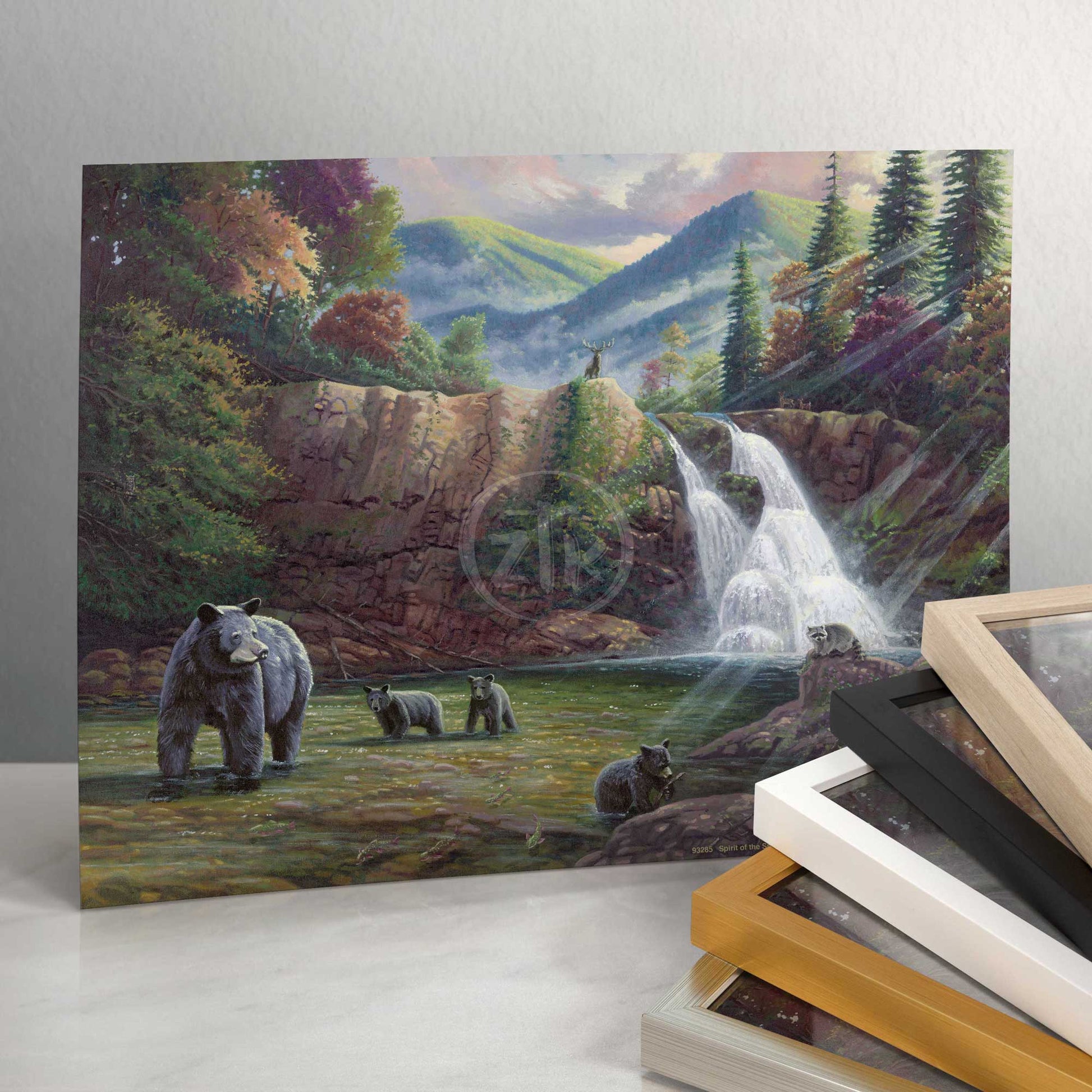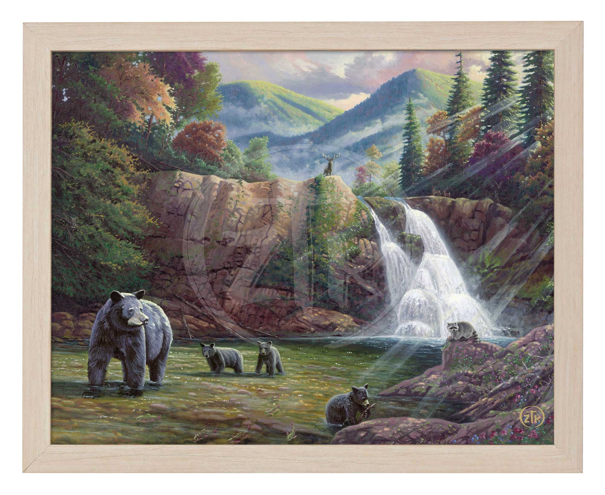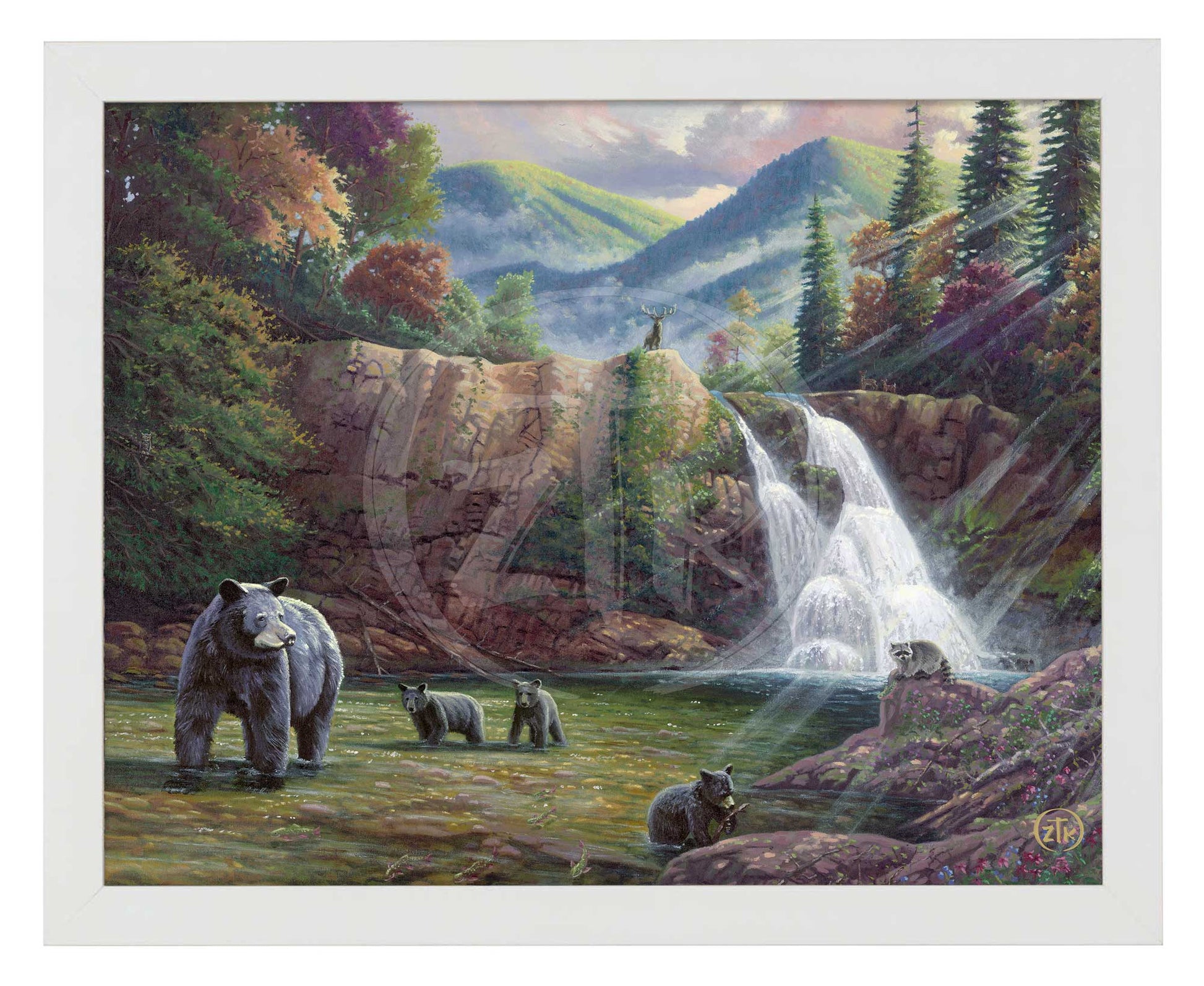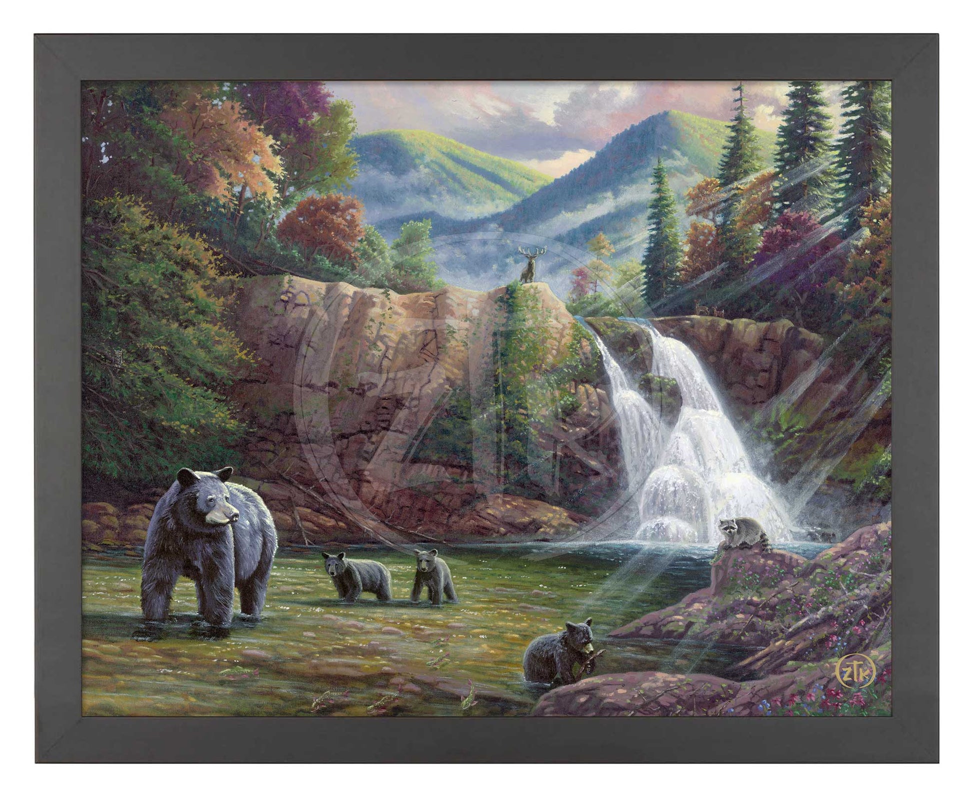 In Spirit of the Smokies, I once again take time to explore America's Wildlands and pay homage this nation's majestic parks. It is my second effort in this series. Situated along the border of Tennessee and North Carolina, the Appalachian and Blue Ridge Mountains serve as backdrop to my selected mountain scene. As Abrams Falls splashes behind, a mother black bear and her three cubs forage the flowing stream for food and fun. A mountain raccoon takes a moment to watch the furry family while it holds on to its dinner in the form of a brook trout. Standing above it all, a North American elk looks down on its fellow woodland denizens as it is silhouetted against the shifting mists and striking foliage of this ancient forest habitat. I have visited the Smoky Mountains on many occasions and I am always struck in wonder at the beauty of the area. As you hike these hills, you will see subtleties of light and color that can truly inspire artistic vision. It is also a place rich in a unique culture and an unabashed appreciation of the simple life so far removed from the chaos of the city. I hope you all can find some time to join me as I take my own moment to reflect and recenter myself in the Smokies and this sun drenched hallow. And, as always, I want to thank you all for sharing my adventure in art.