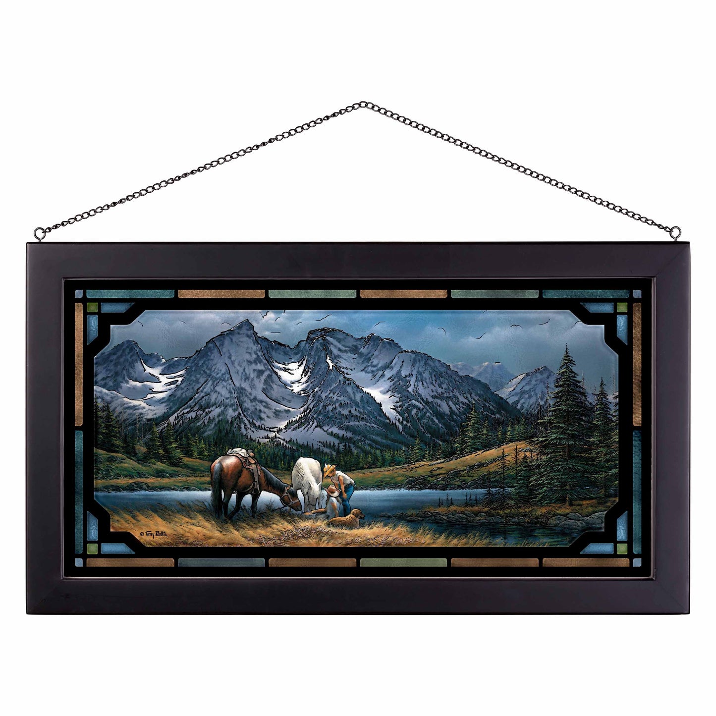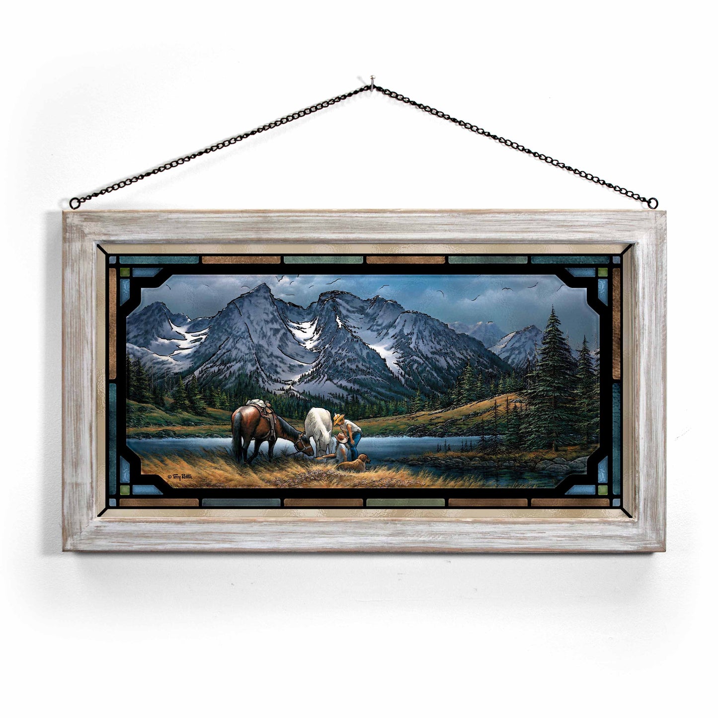 Let the light shine! Stained glass art hangings show their true colors when back-lit with natural sunlight. Popular designs are printed with fade resistant inks on 11" x 21" glass, framed with 1" black-finished moulding. Framed size 13" x 23". Ready to hang with provided chain. Designed, printed, and assembled in North America.