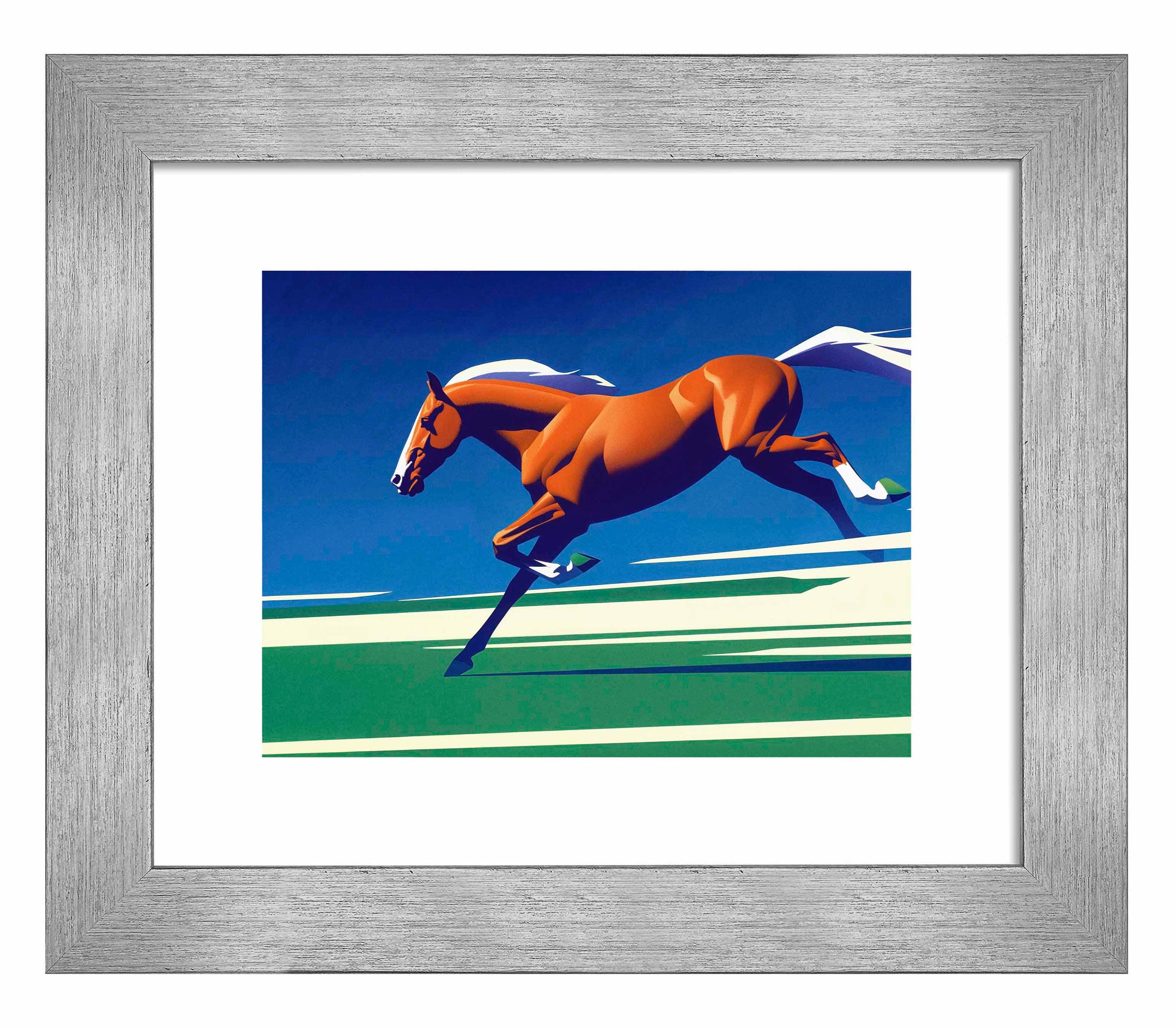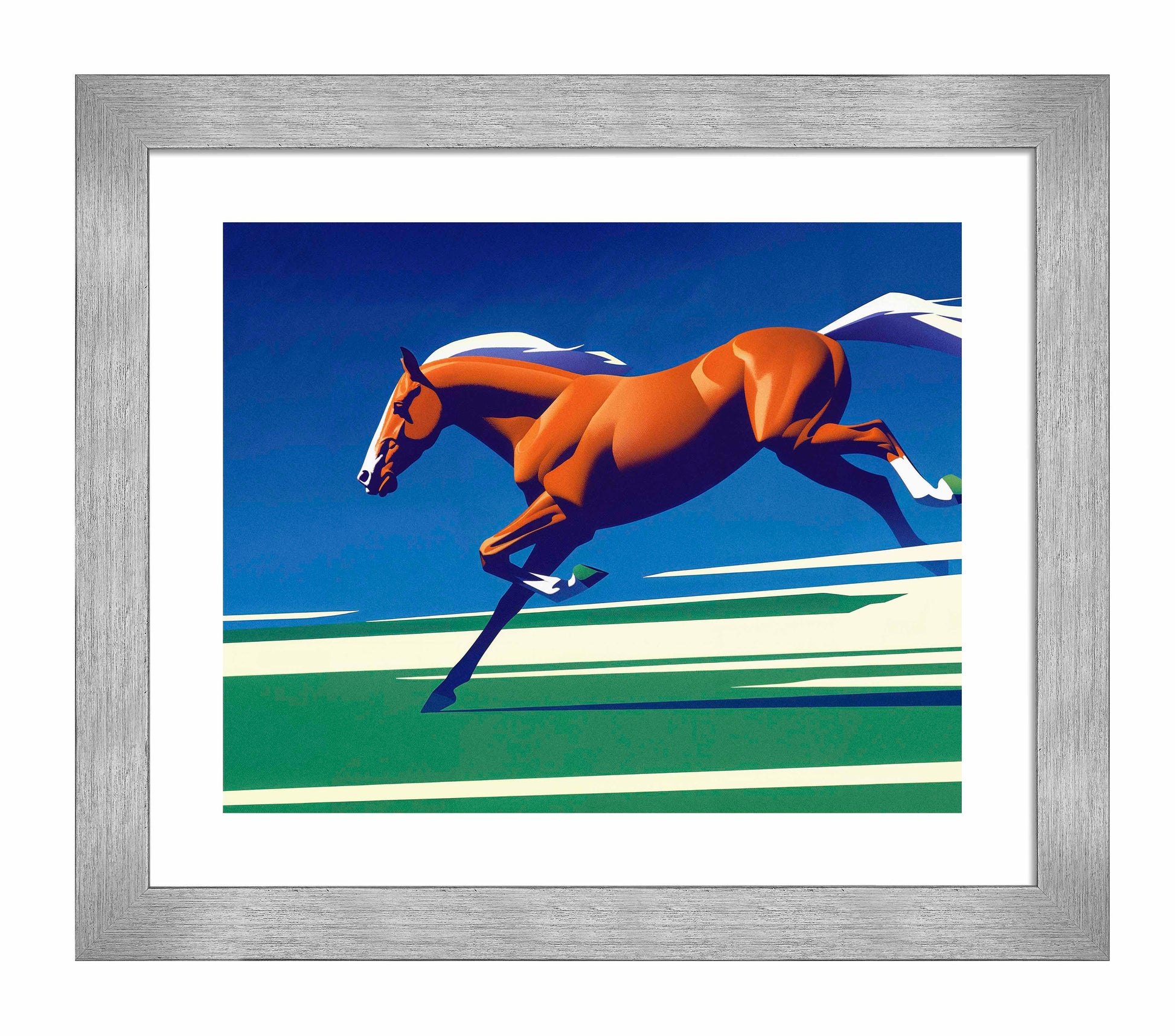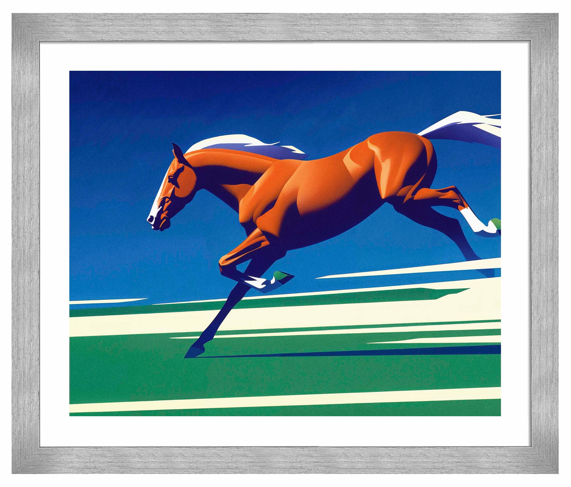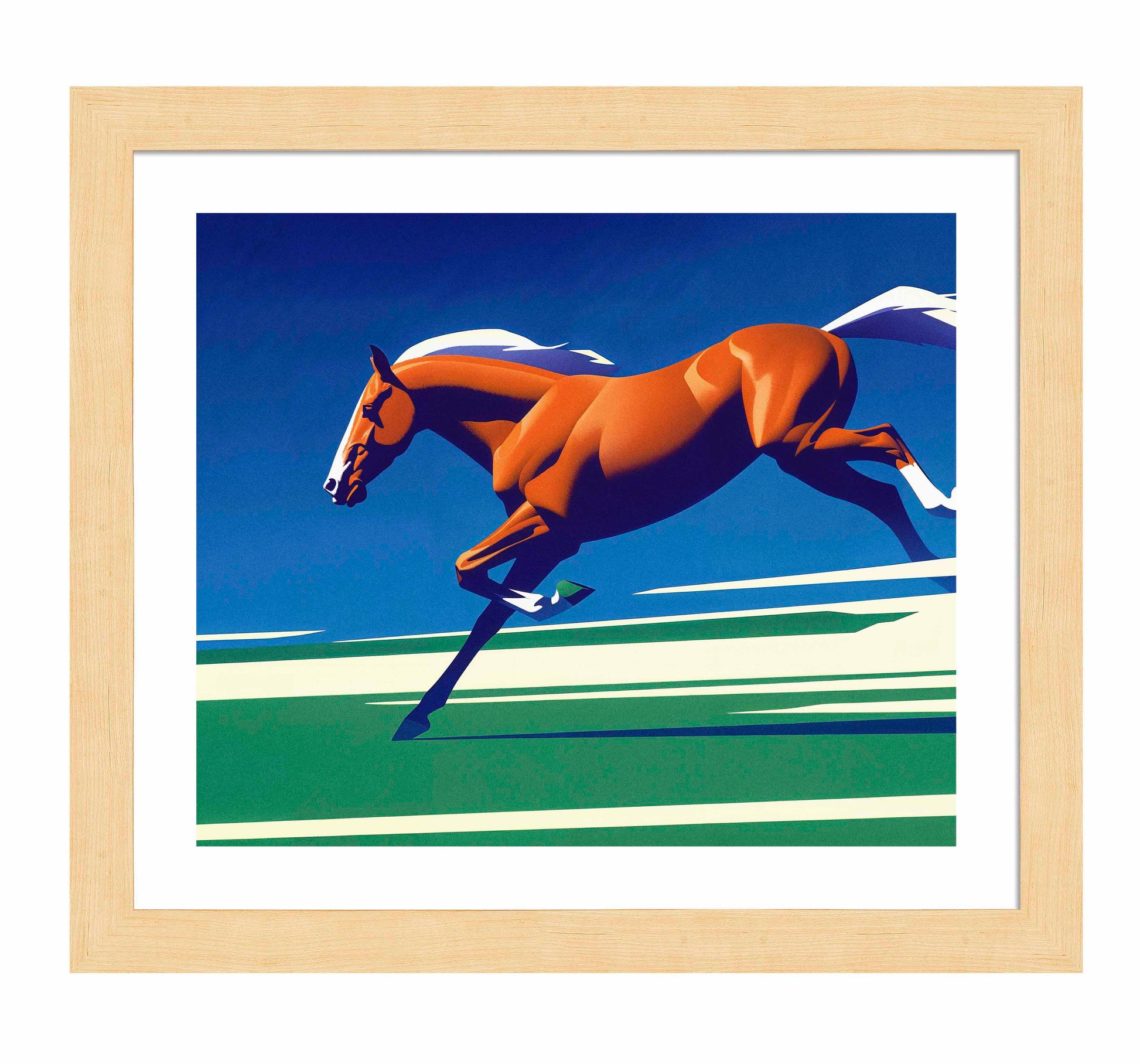 Race to the Finish is a dynamic and striking depiction of speed, power, and the grace of a horse in full stride. The central figure, a vibrant chestnut horse, is captured mid-gallop, its muscular form radiating energy and determination as it charges across the canvas. The use of clean, bold lines and simplified shapes gives the artwork a sense of motion, as though the horse is breaking through the stillness of the scene with its sheer force and momentum.