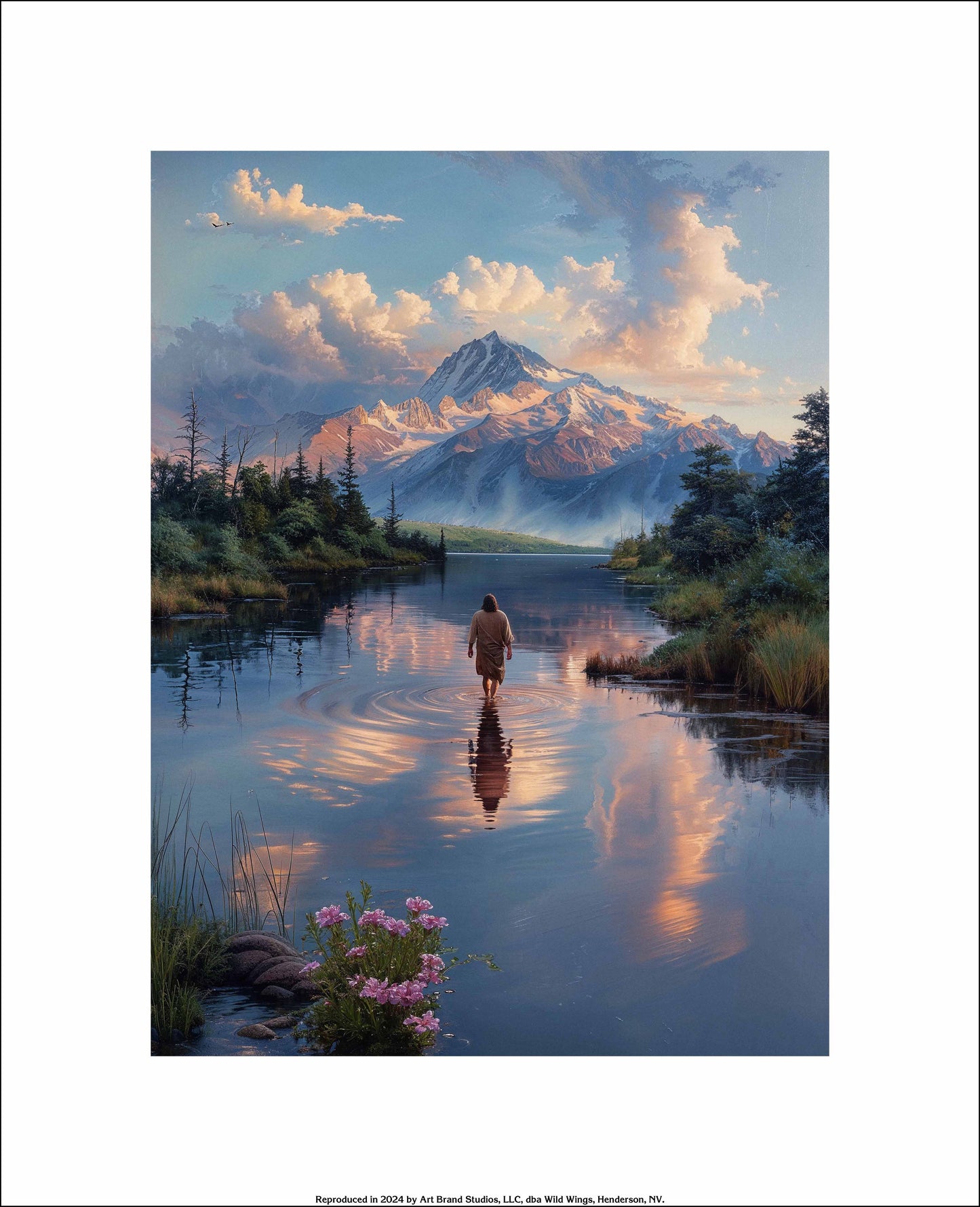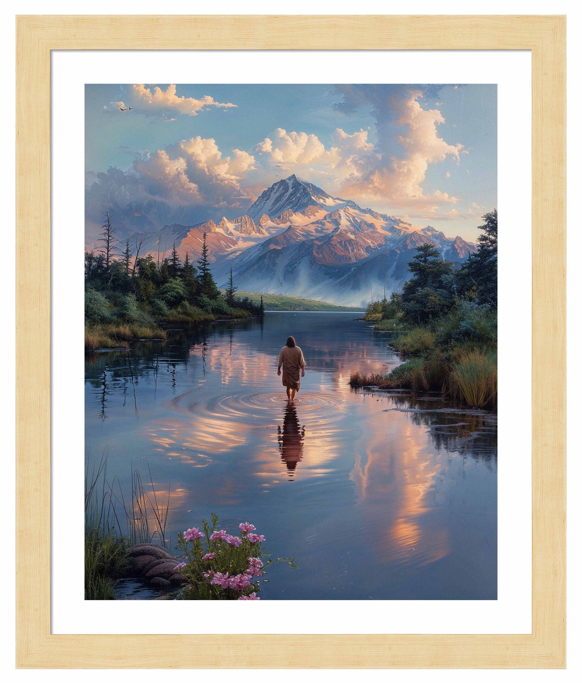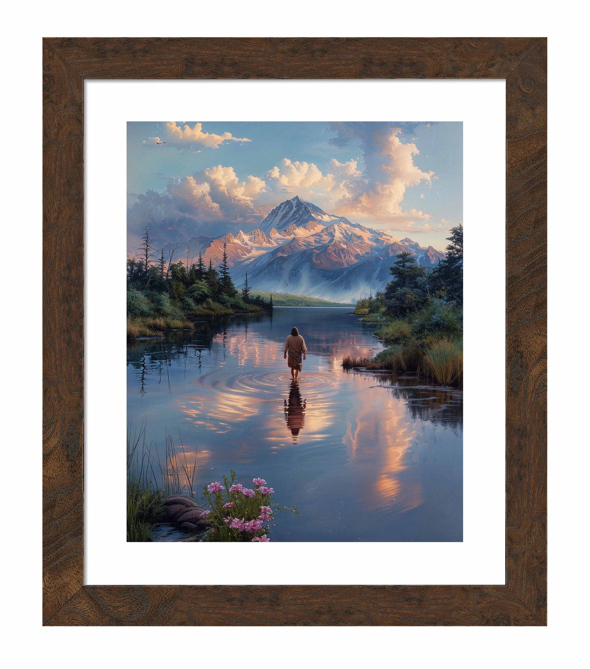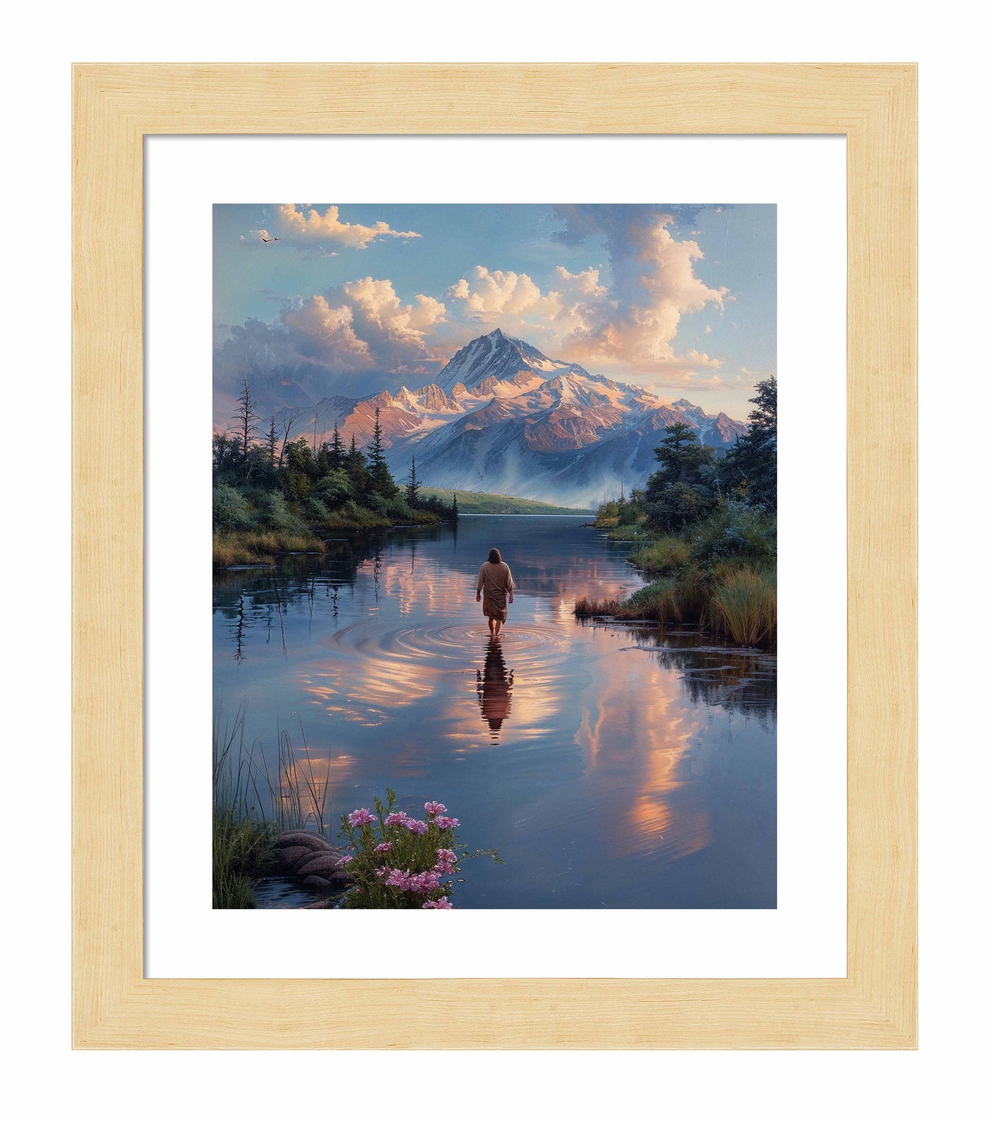 Reflection of Glory is a serene and awe-inspiring landscape painting that depicts a figure walking through calm waters, surrounded by a majestic mountain range. The mountains, bathed in the golden light of sunrise or sunset, are reflected in the still waters, creating a mirror-like effect that adds depth and tranquility to the scene. The clouds above the mountains are lit with soft pinks and blues, harmonizing with the reflections in the water.