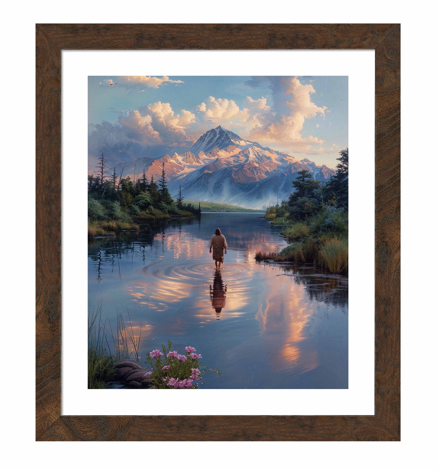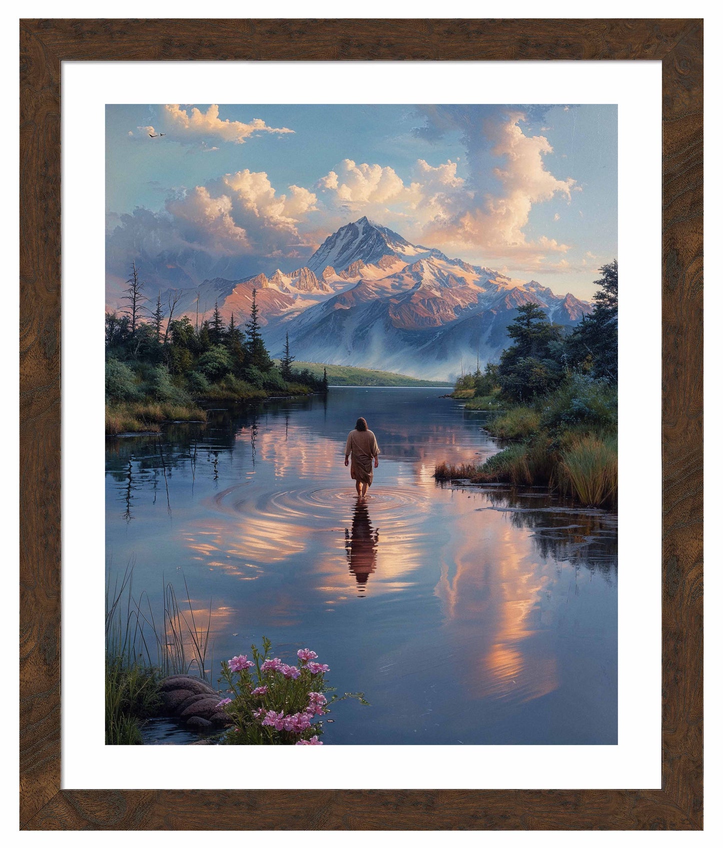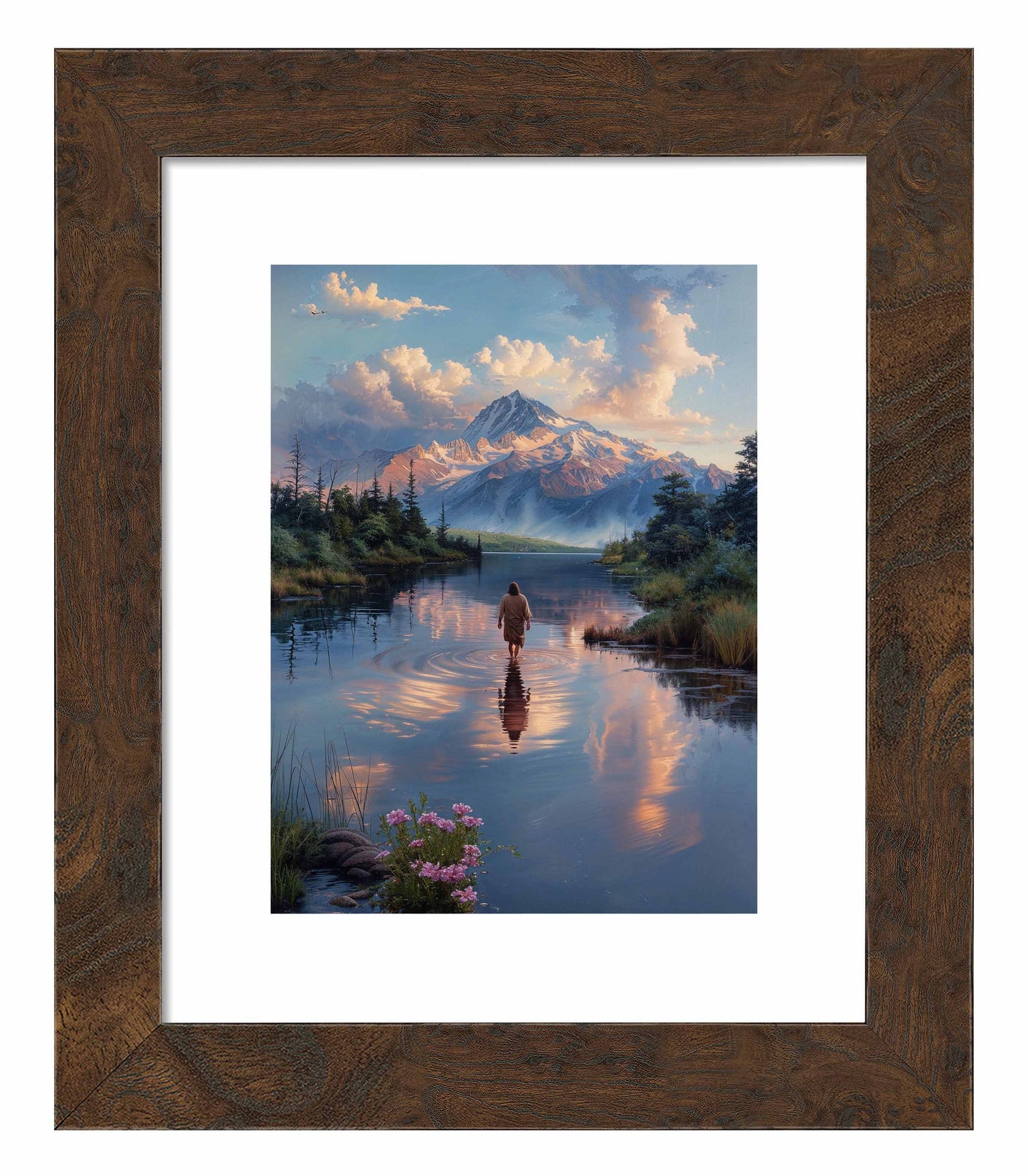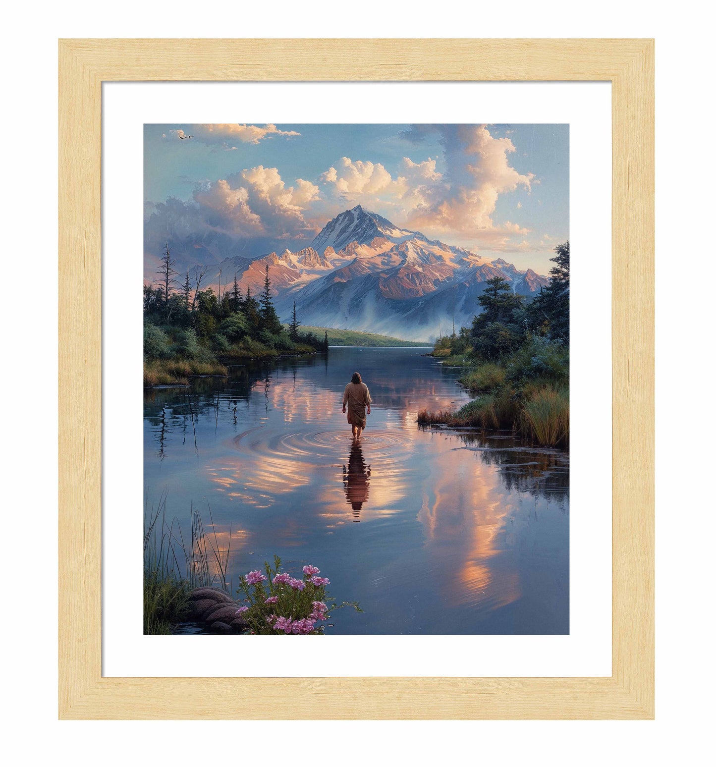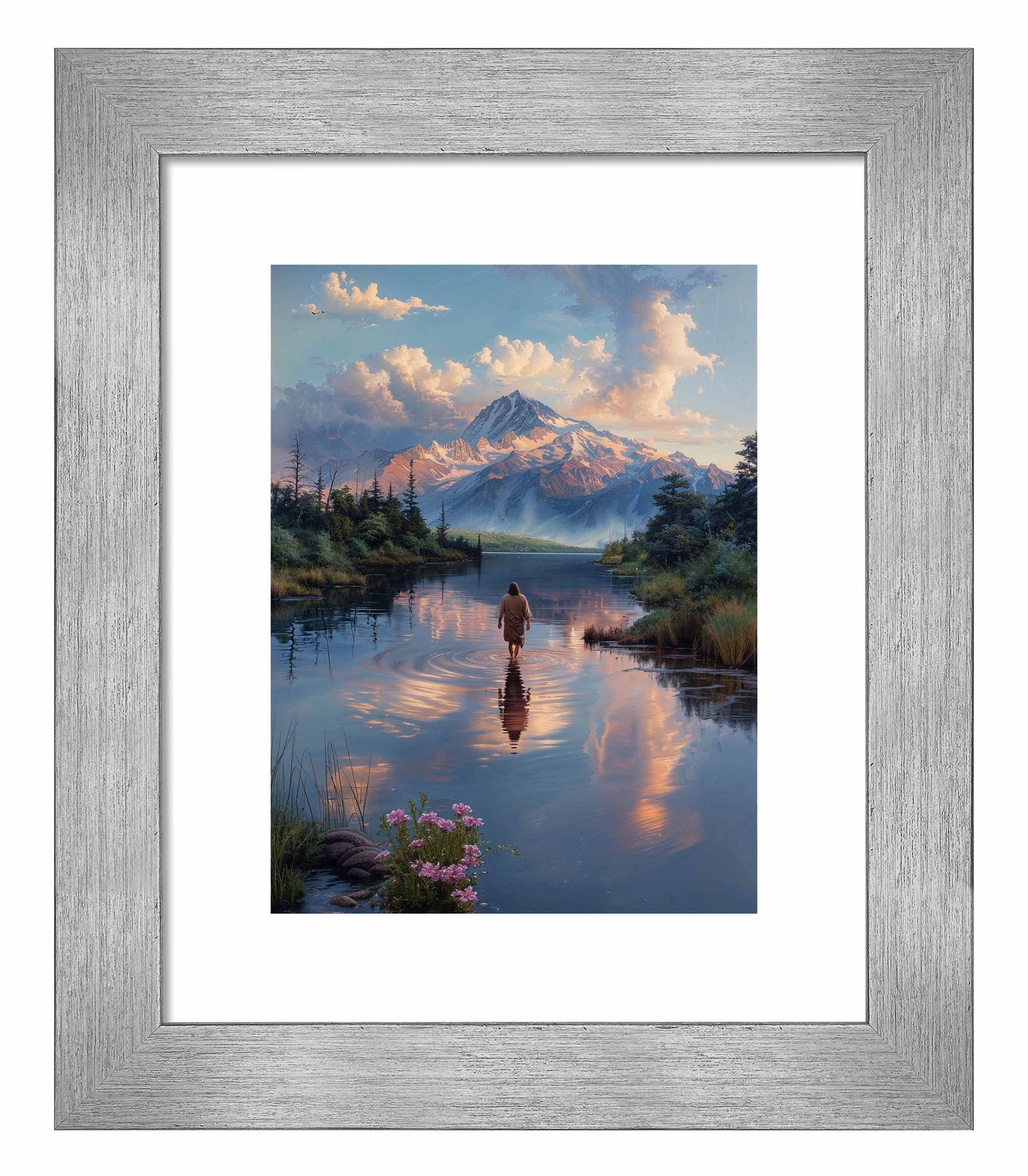 Reflection of Glory is a serene and awe-inspiring landscape painting that depicts a figure walking through calm waters, surrounded by a majestic mountain range. The mountains, bathed in the golden light of sunrise or sunset, are reflected in the still waters, creating a mirror-like effect that adds depth and tranquility to the scene. The clouds above the mountains are lit with soft pinks and blues, harmonizing with the reflections in the water.