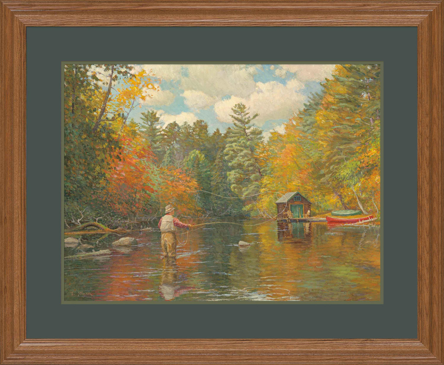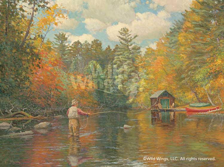 Limited edition of 1,500 signed and numbered art prints made from the original oil painting. Image size, 18" x 24". Framed size 26" x 32" with 2" fruitwood-finished moulding. Double matting with Spruce outer mat. Published exclusively by Wild Wings.