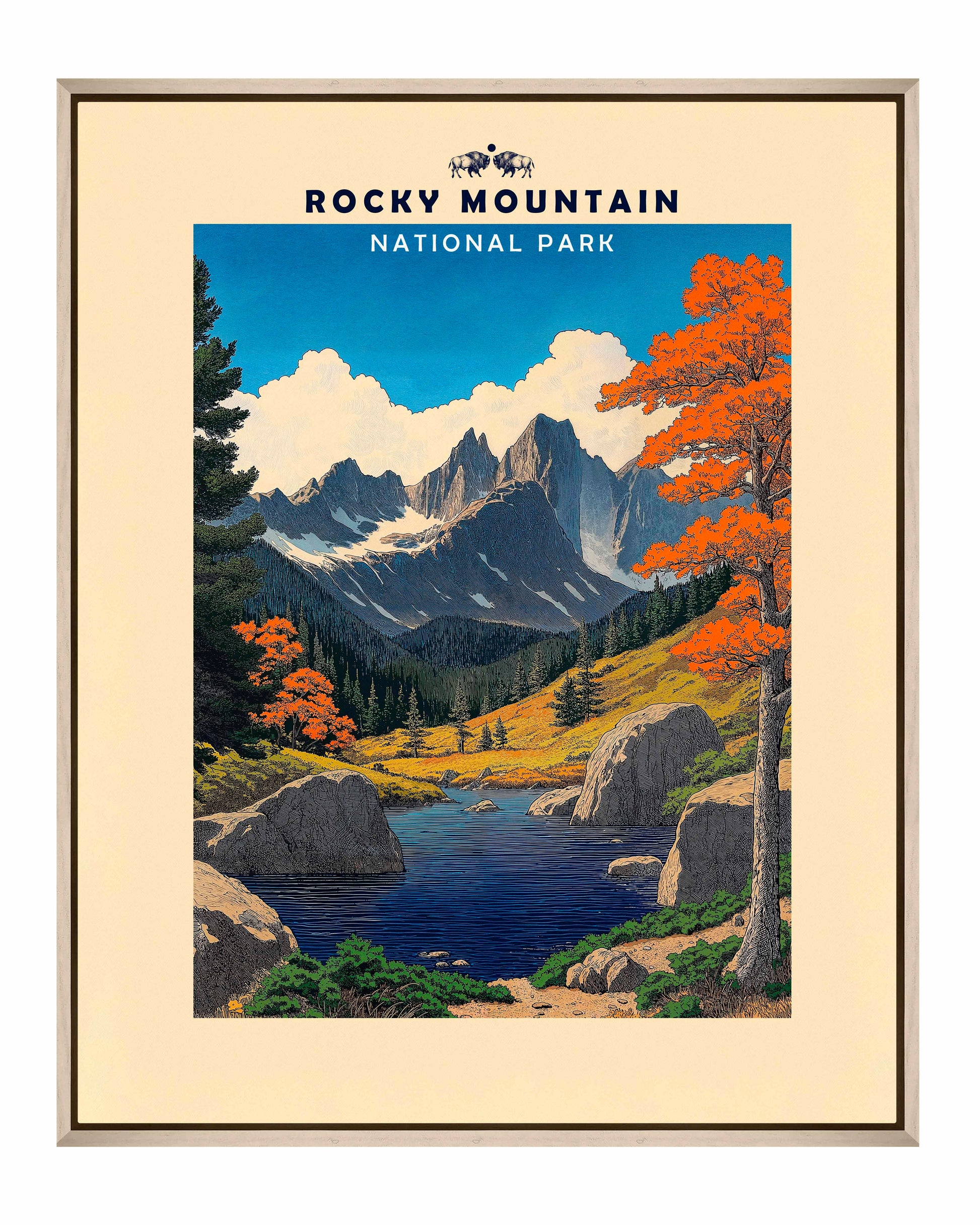 This vintage-style poster art of Rocky Mountain National Park beautifully captures the park's diverse landscape in a single, breathtaking scene. The composition is anchored by a serene mountain lake in the foreground, its deep blue waters reflecting the surrounding scenery. Rugged granite boulders frame the water, leading the eye to a winding stream and lush alpine meadow. The middle ground showcases the park's famous evergreen forests, interspersed with vibrant splashes of orange foliage, suggesting the changing seasons. Towering in the background are the park's iconic jagged peaks, their snow-capped summits piercing a bright blue sky dotted with puffy white clouds. The artwork's use of bold, contrasting colors - particularly the interplay of cool blues and warm oranges - is characteristic of mid-20th century travel poster aesthetics and effectively conveys the park's stunning natural beauty across different elevations and ecosystems. This striking design invites viewers to explore the majestic wilderness of Rocky Mountain National Park, from its tranquil lakes to its soaring peaks.