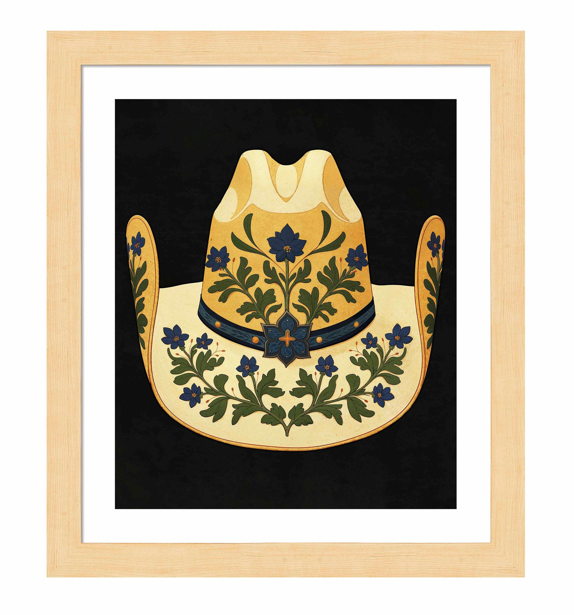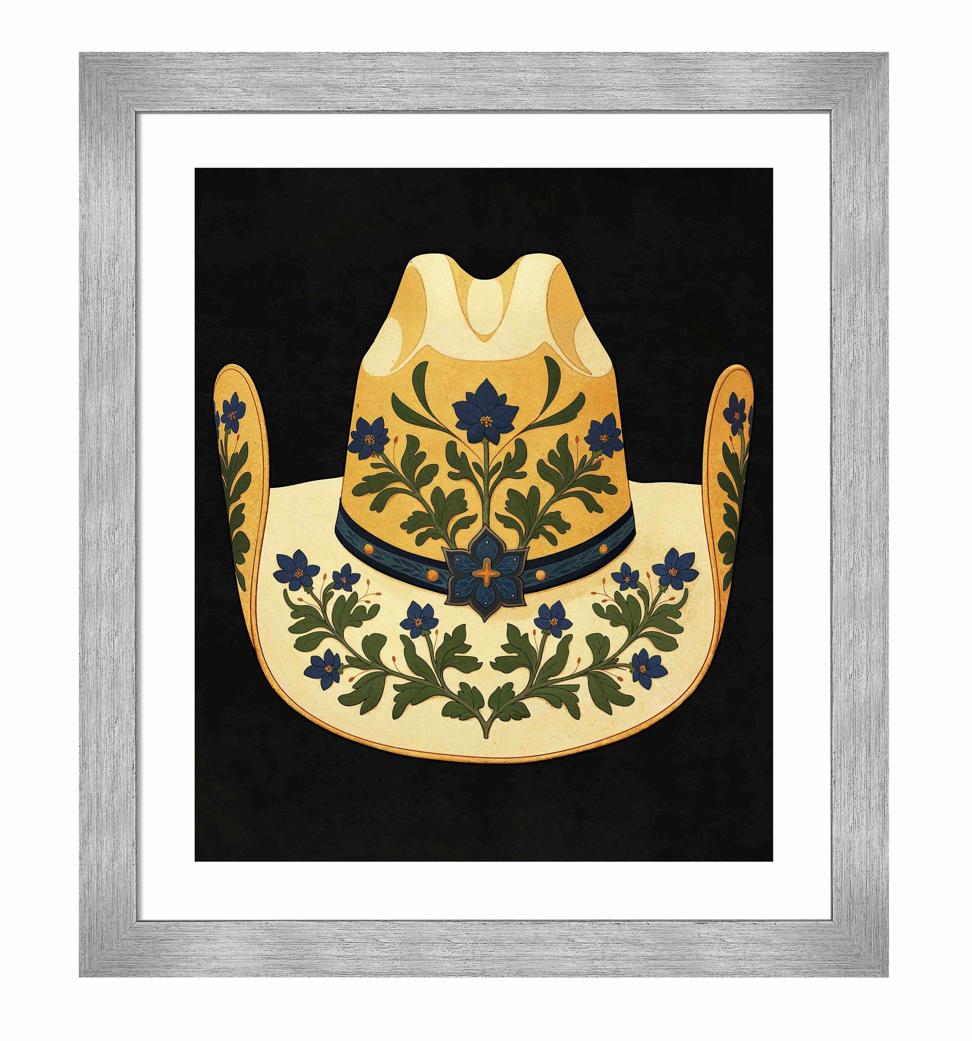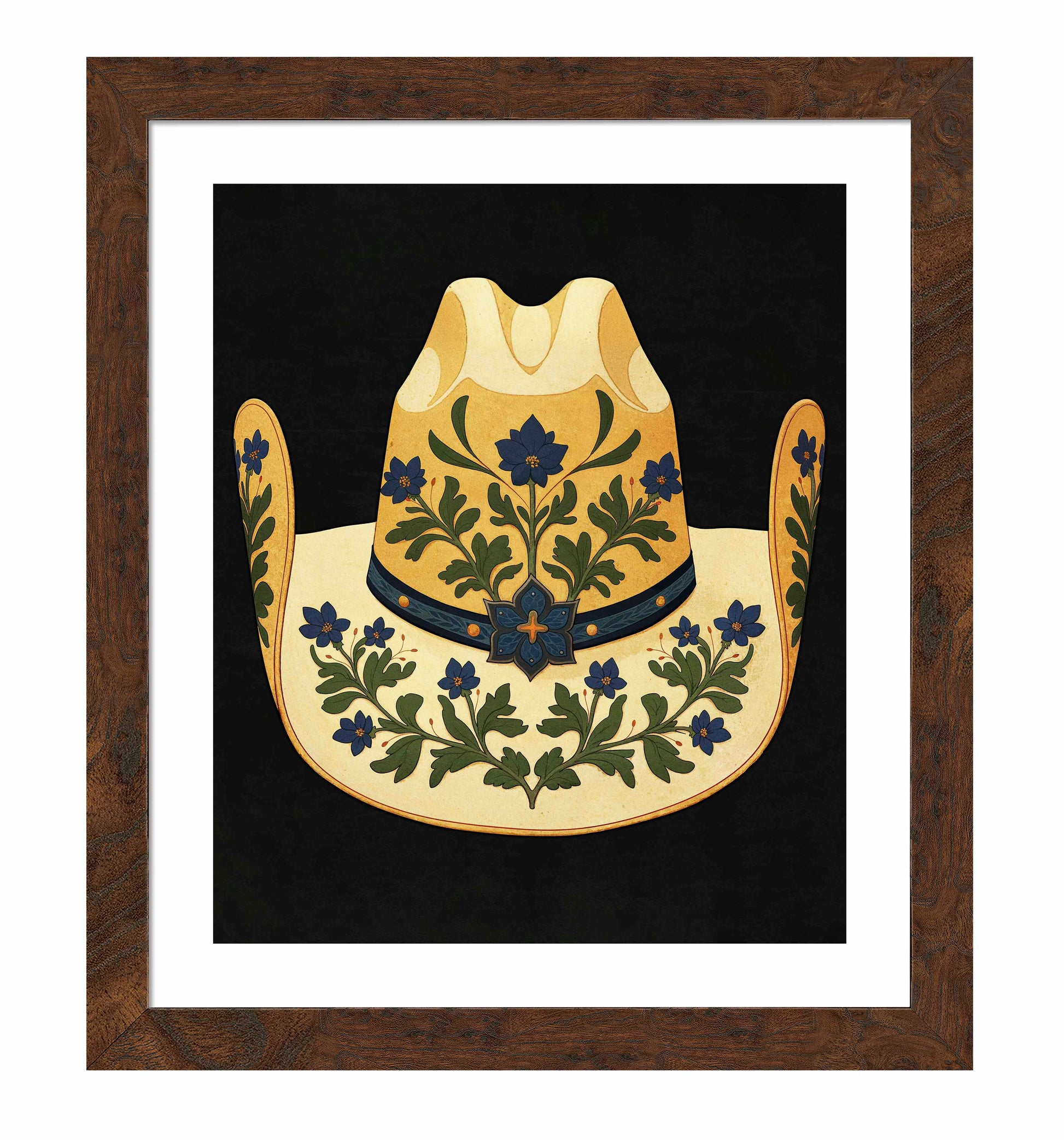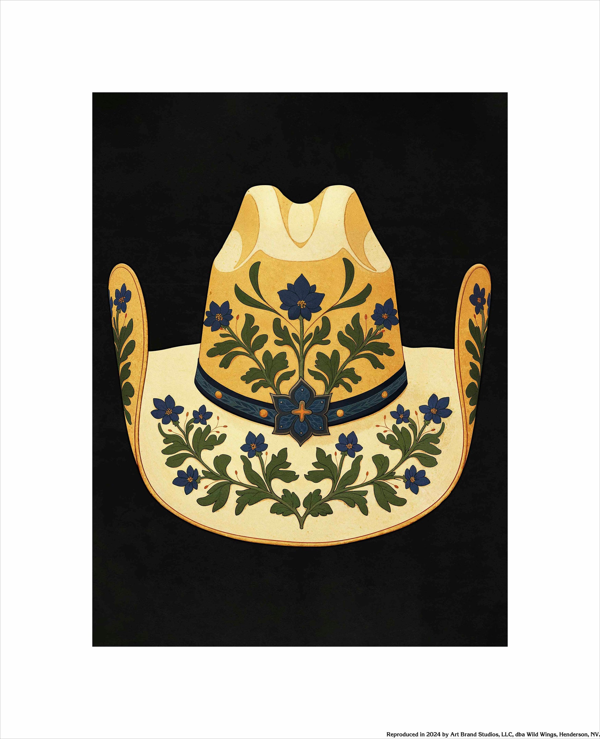 "Rodeo King’s Crown" is a captivating representation of the iconic cowboy hat, transformed into a symbol of pride and cultural heritage. The painting features a beautifully detailed, cream-colored cowboy hat adorned with intricate floral motifs. The design on the hat is richly embellished with deep blue flowers and lush green leaves, echoing traditional folk art and the natural beauty of the Texan landscape.