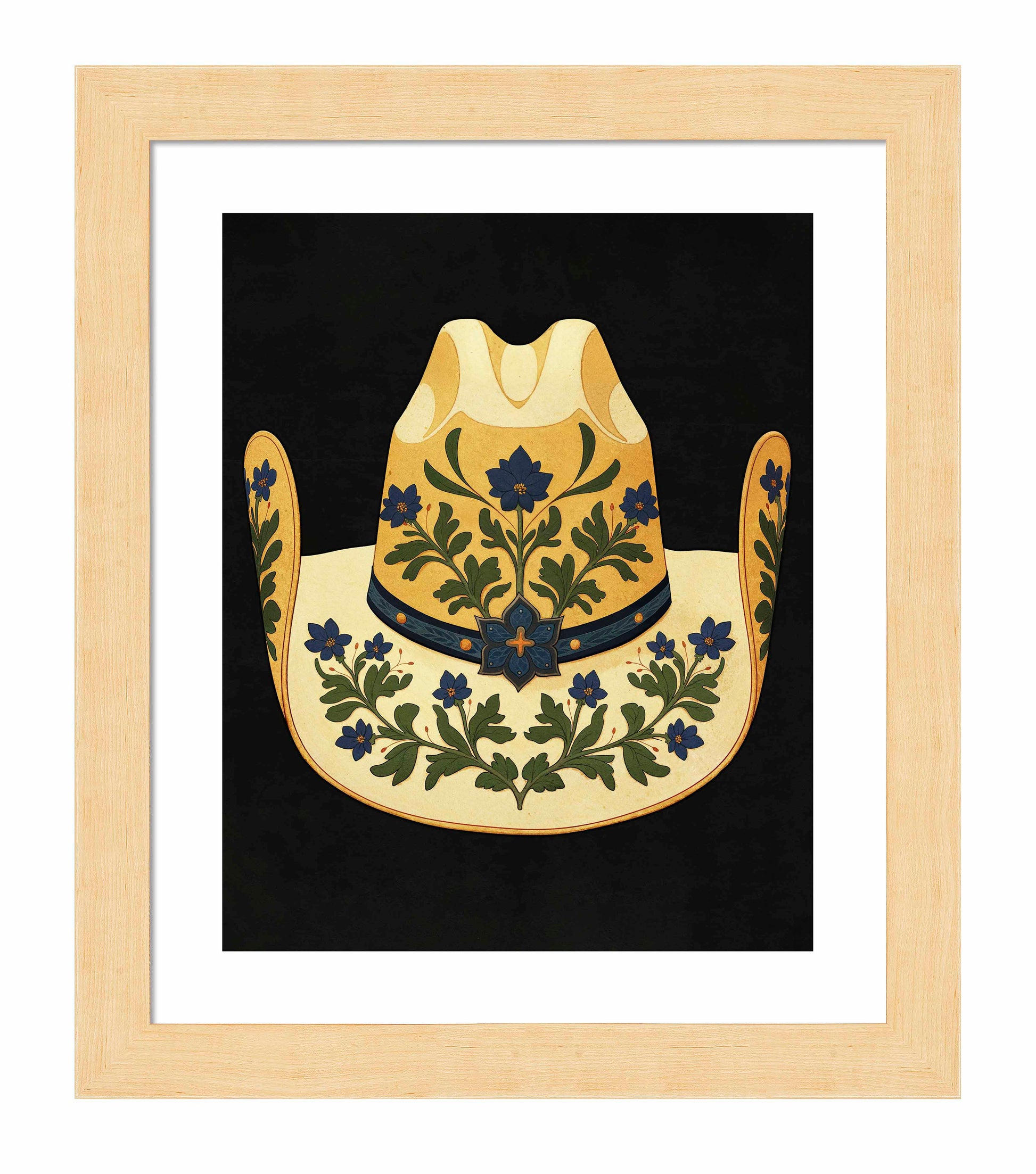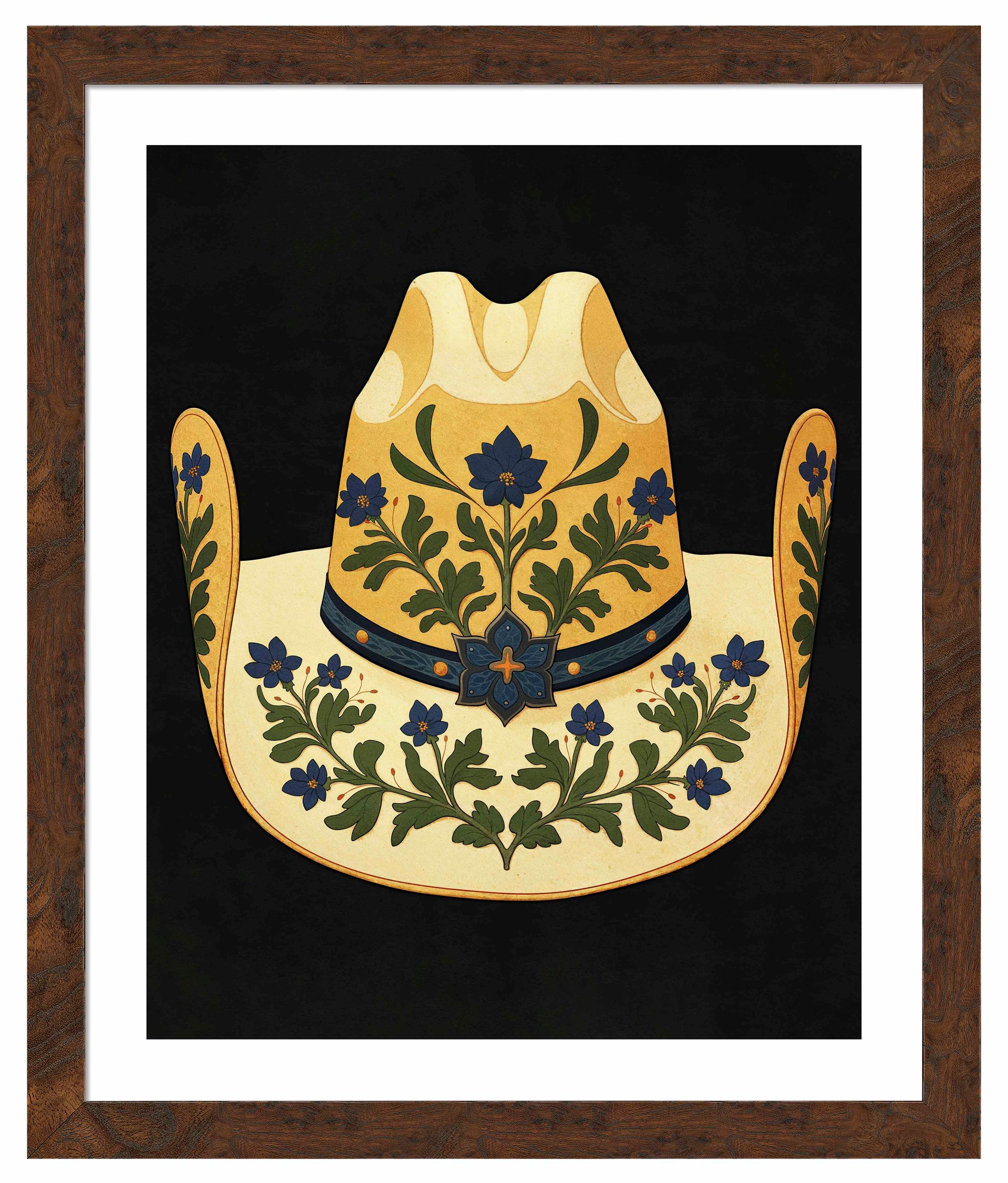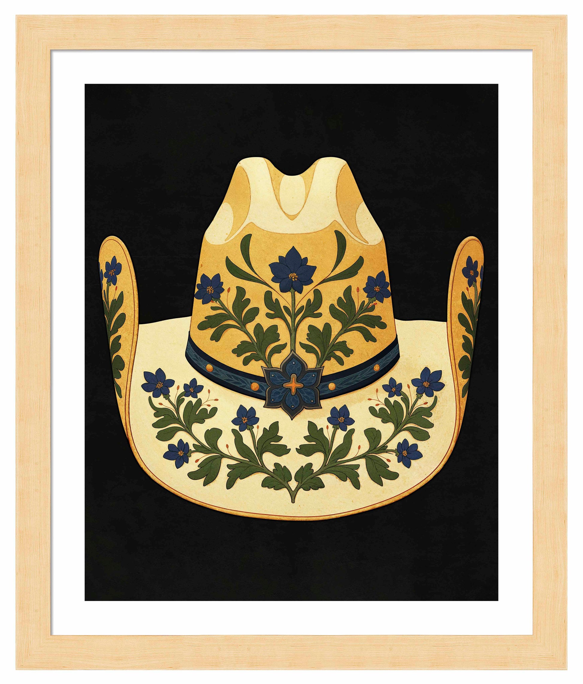 "Rodeo King’s Crown" is a captivating representation of the iconic cowboy hat, transformed into a symbol of pride and cultural heritage. The painting features a beautifully detailed, cream-colored cowboy hat adorned with intricate floral motifs. The design on the hat is richly embellished with deep blue flowers and lush green leaves, echoing traditional folk art and the natural beauty of the Texan landscape.