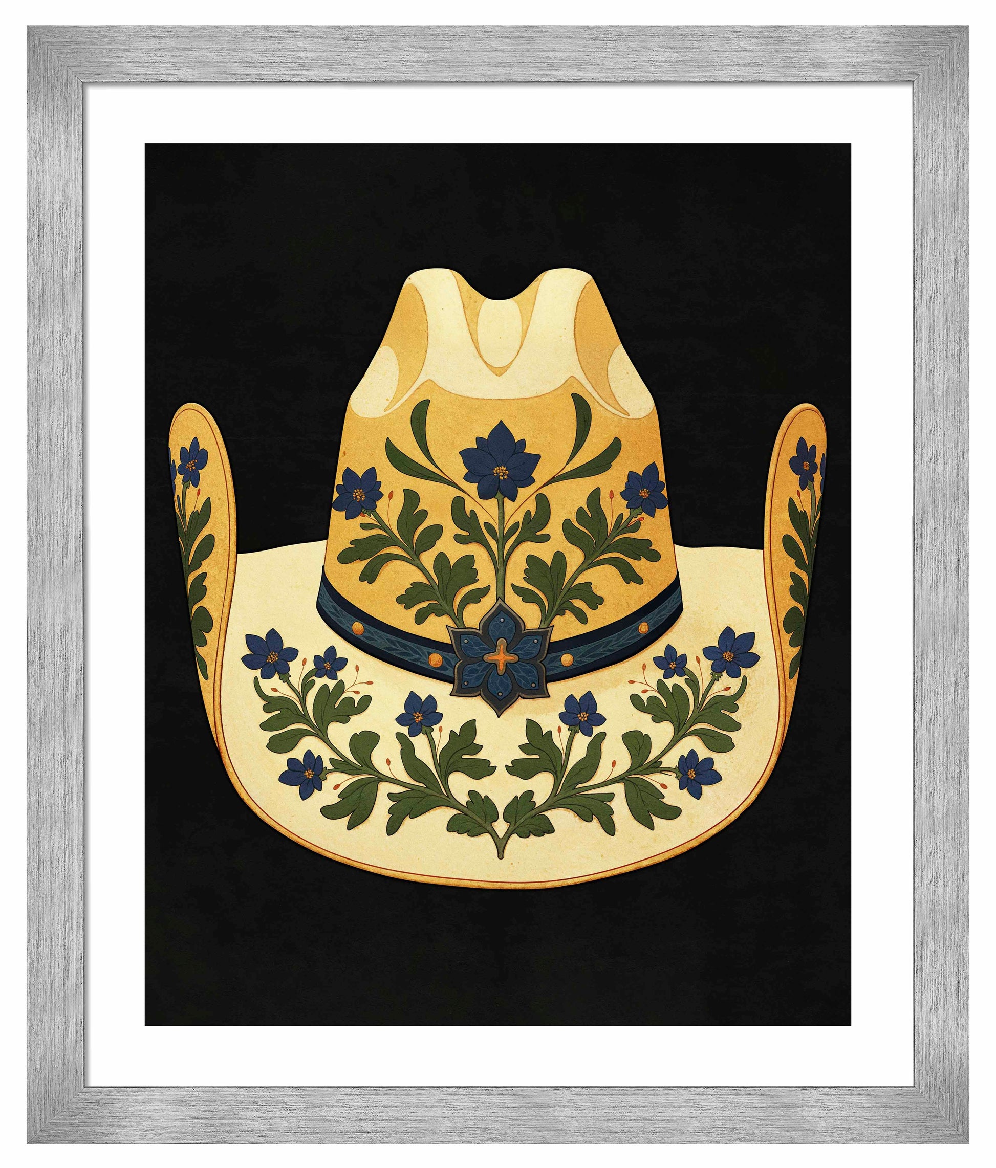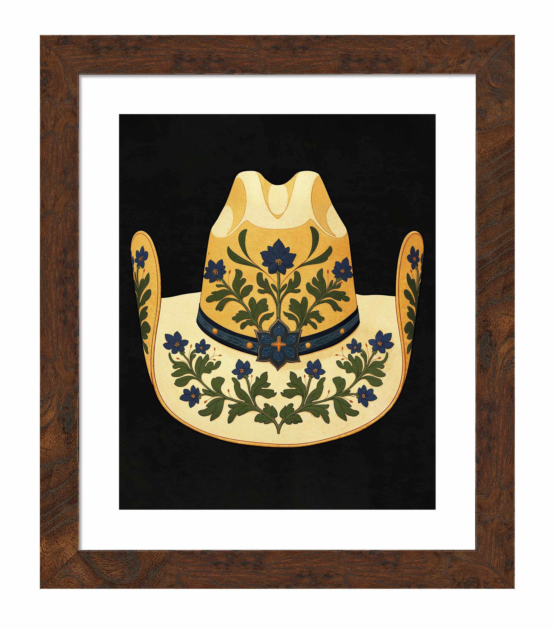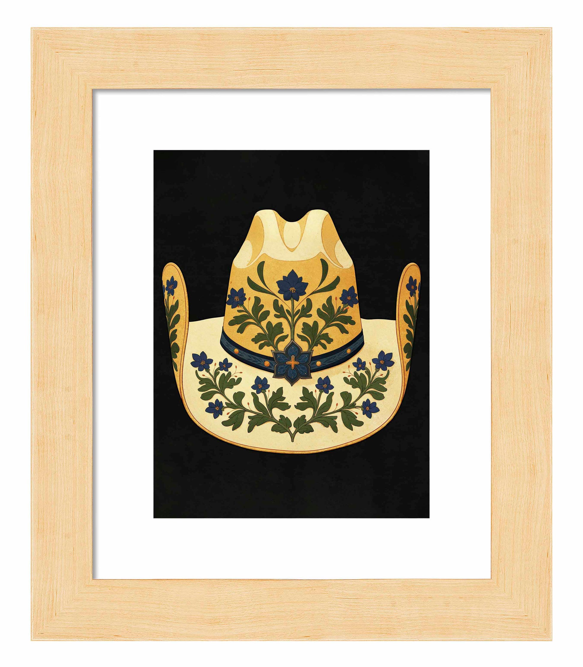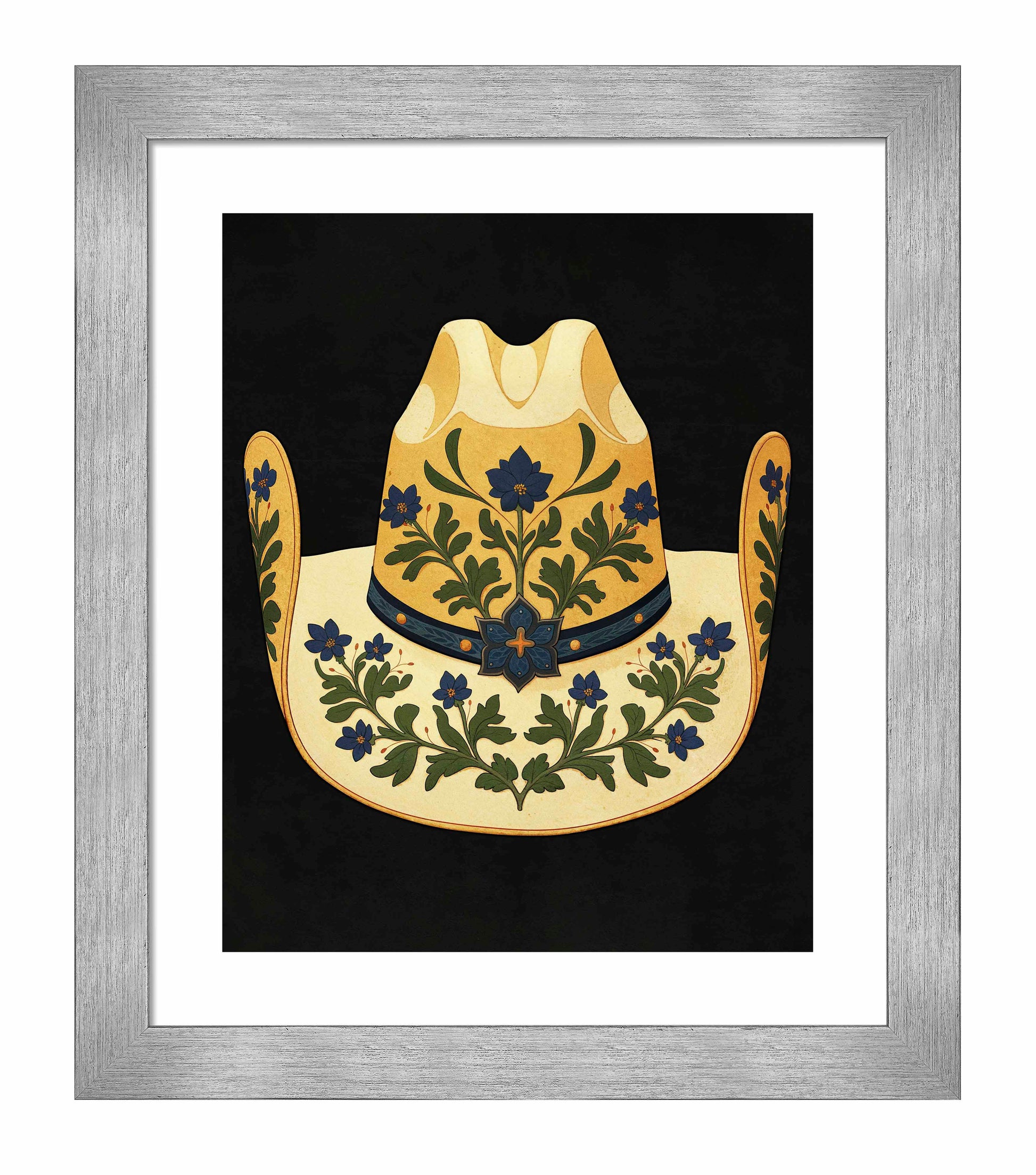 "Rodeo King’s Crown" is a captivating representation of the iconic cowboy hat, transformed into a symbol of pride and cultural heritage. The painting features a beautifully detailed, cream-colored cowboy hat adorned with intricate floral motifs. The design on the hat is richly embellished with deep blue flowers and lush green leaves, echoing traditional folk art and the natural beauty of the Texan landscape.
