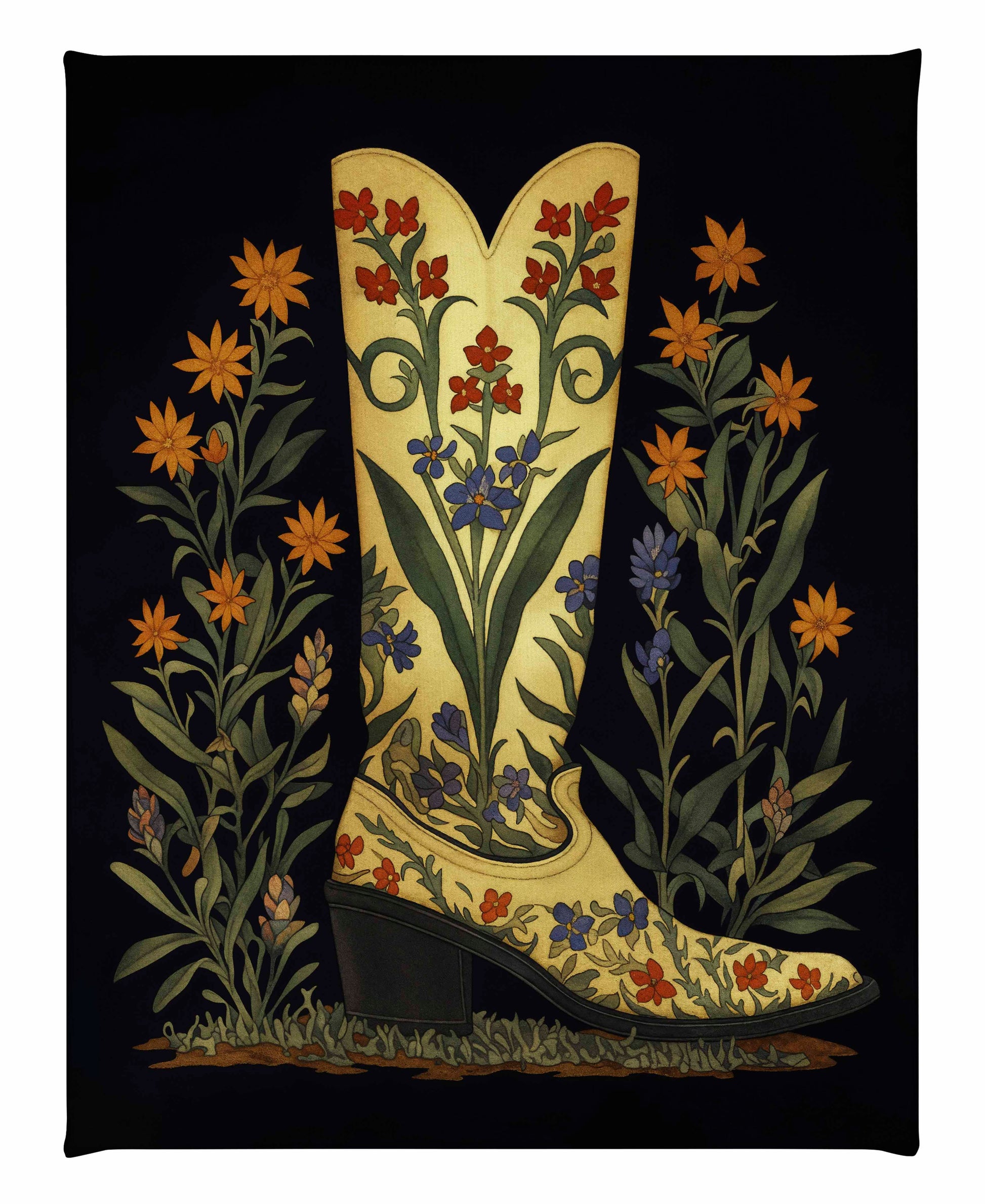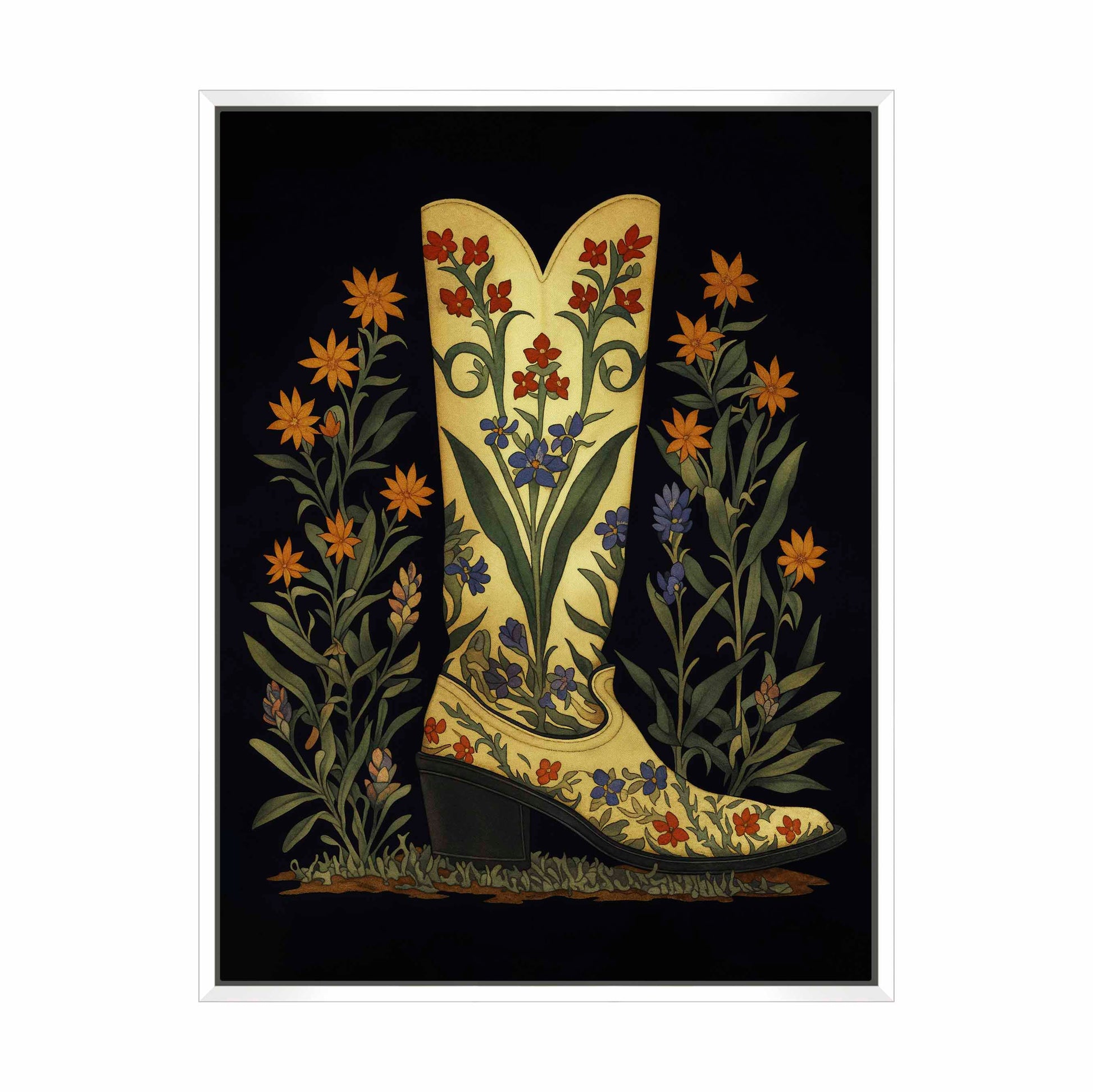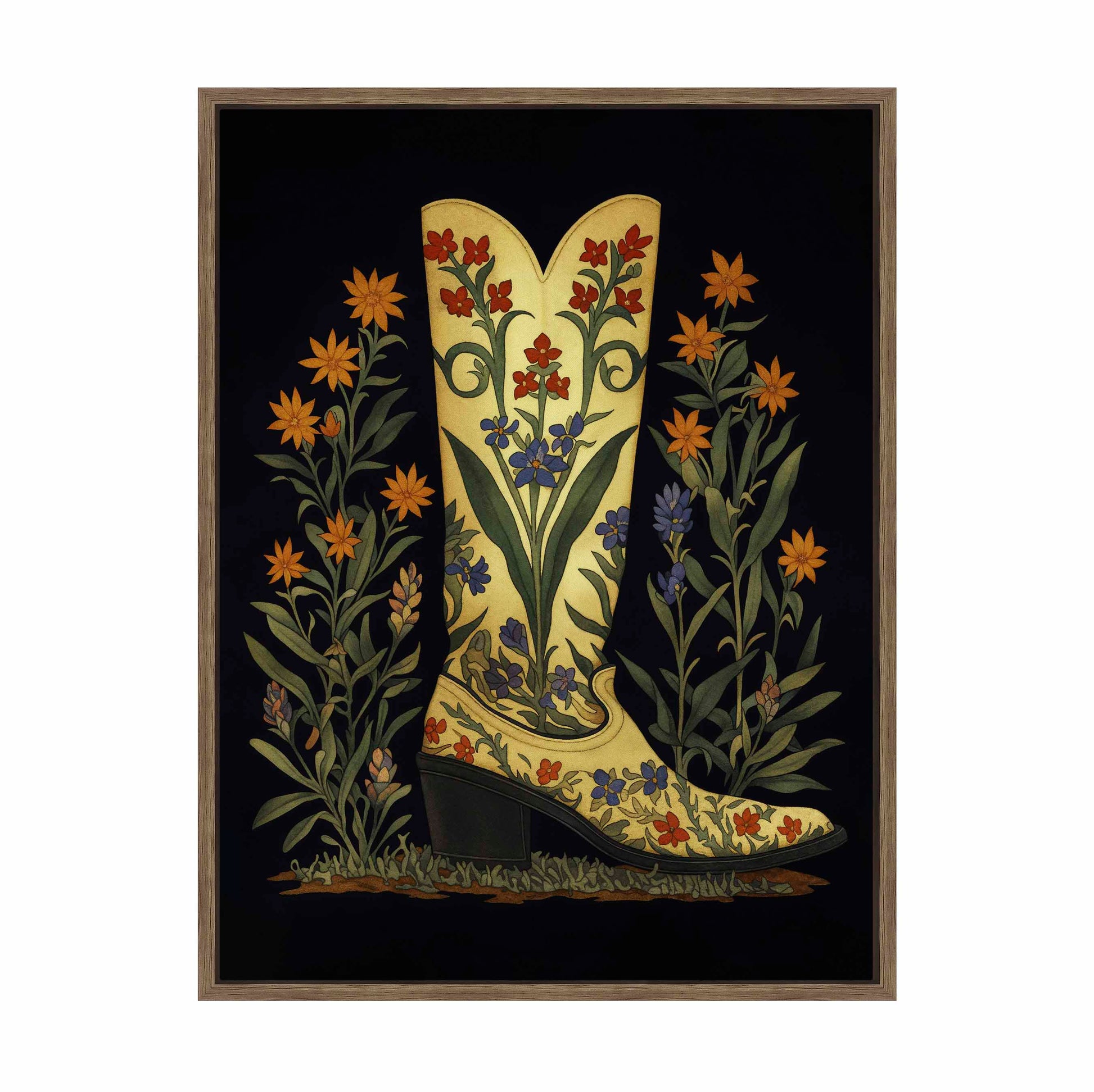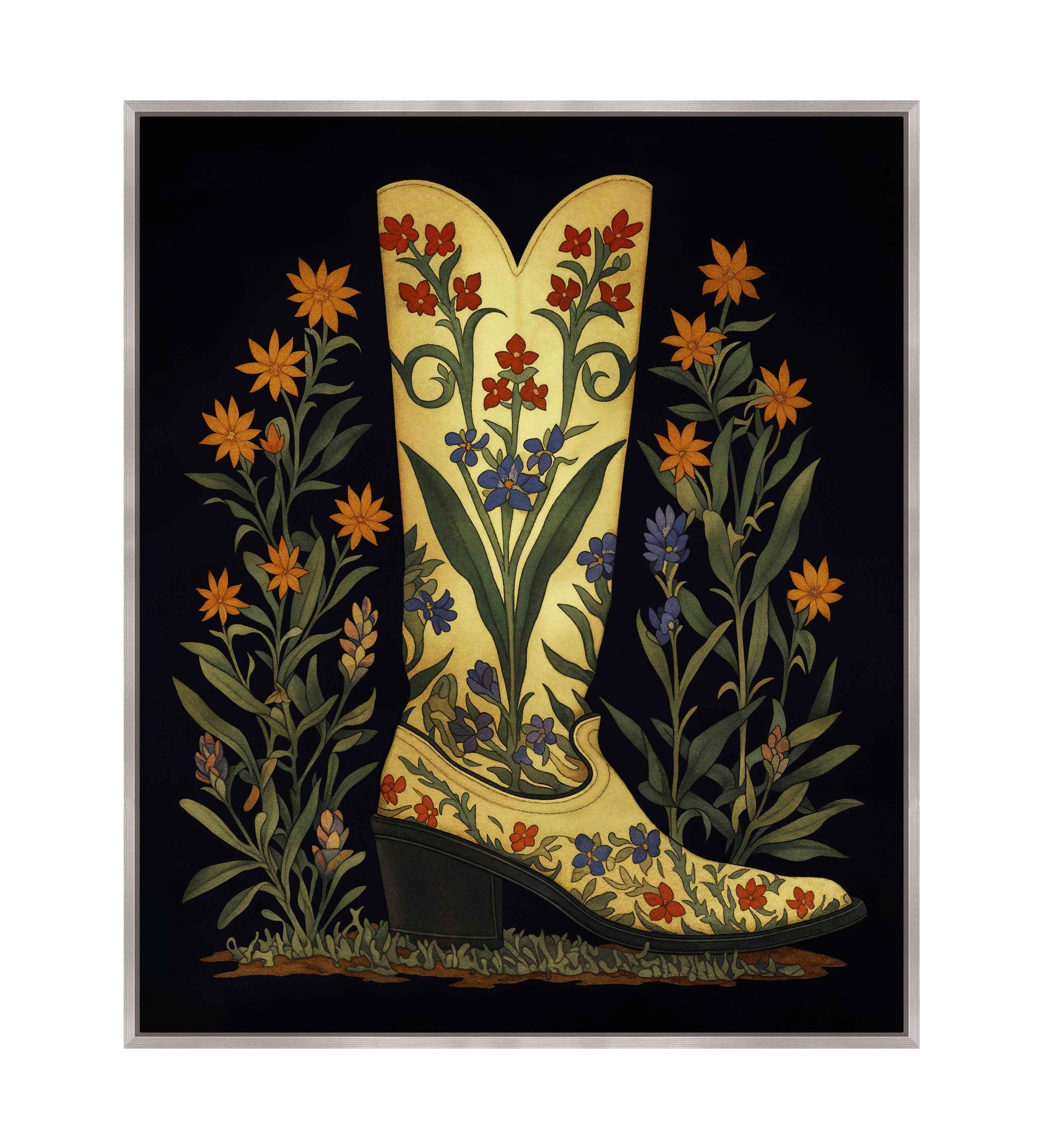 Surrounding the boot are tall stalks of wildflowers in orange, yellow, and purple tones. These flowers frame the boot and enhance the botanical theme, adding a sense of symmetry and balance to the composition. The dark background serves to make the boot and flowers pop, giving the painting a dynamic yet elegant feel.