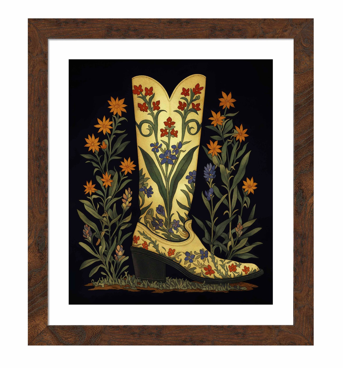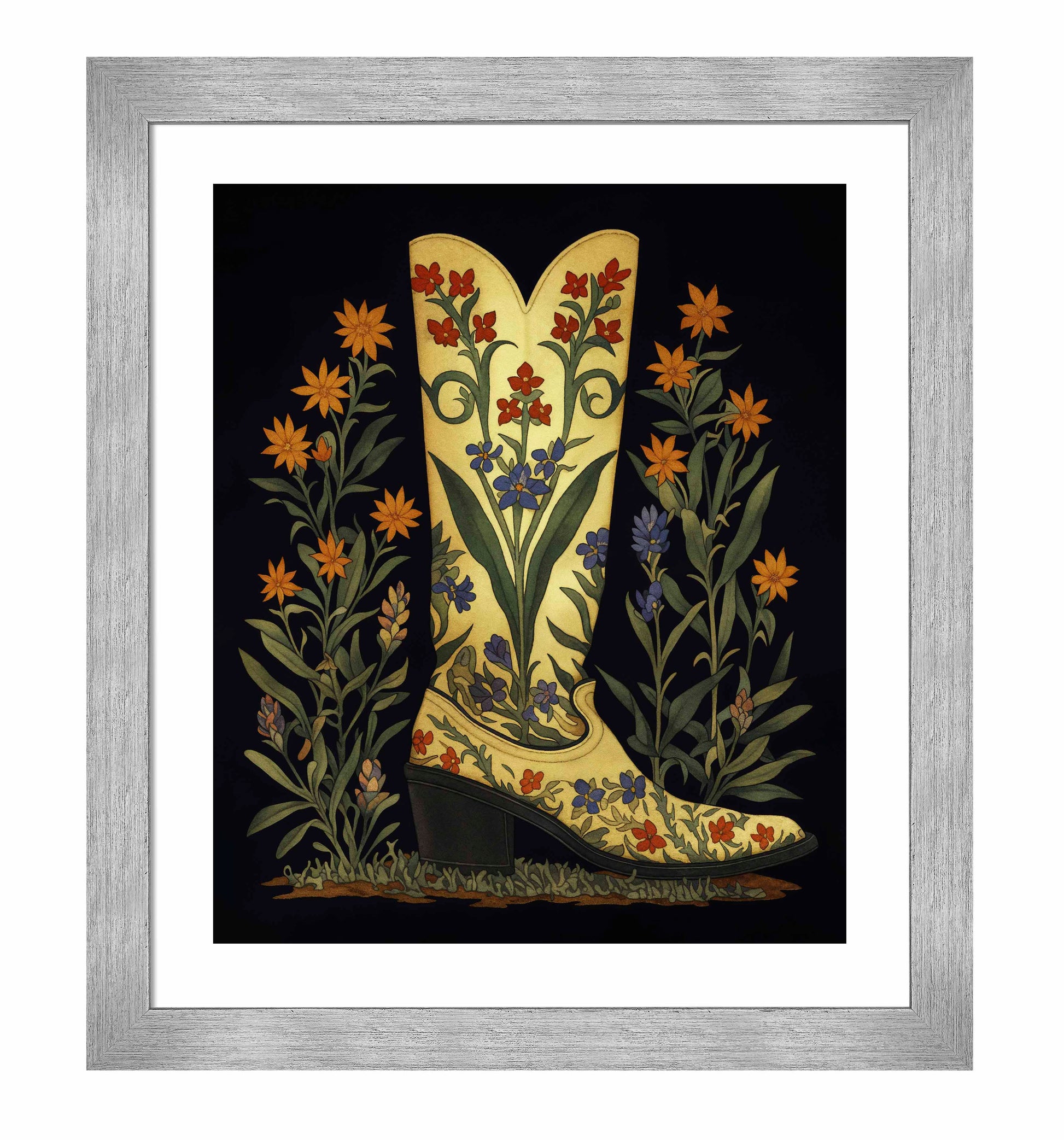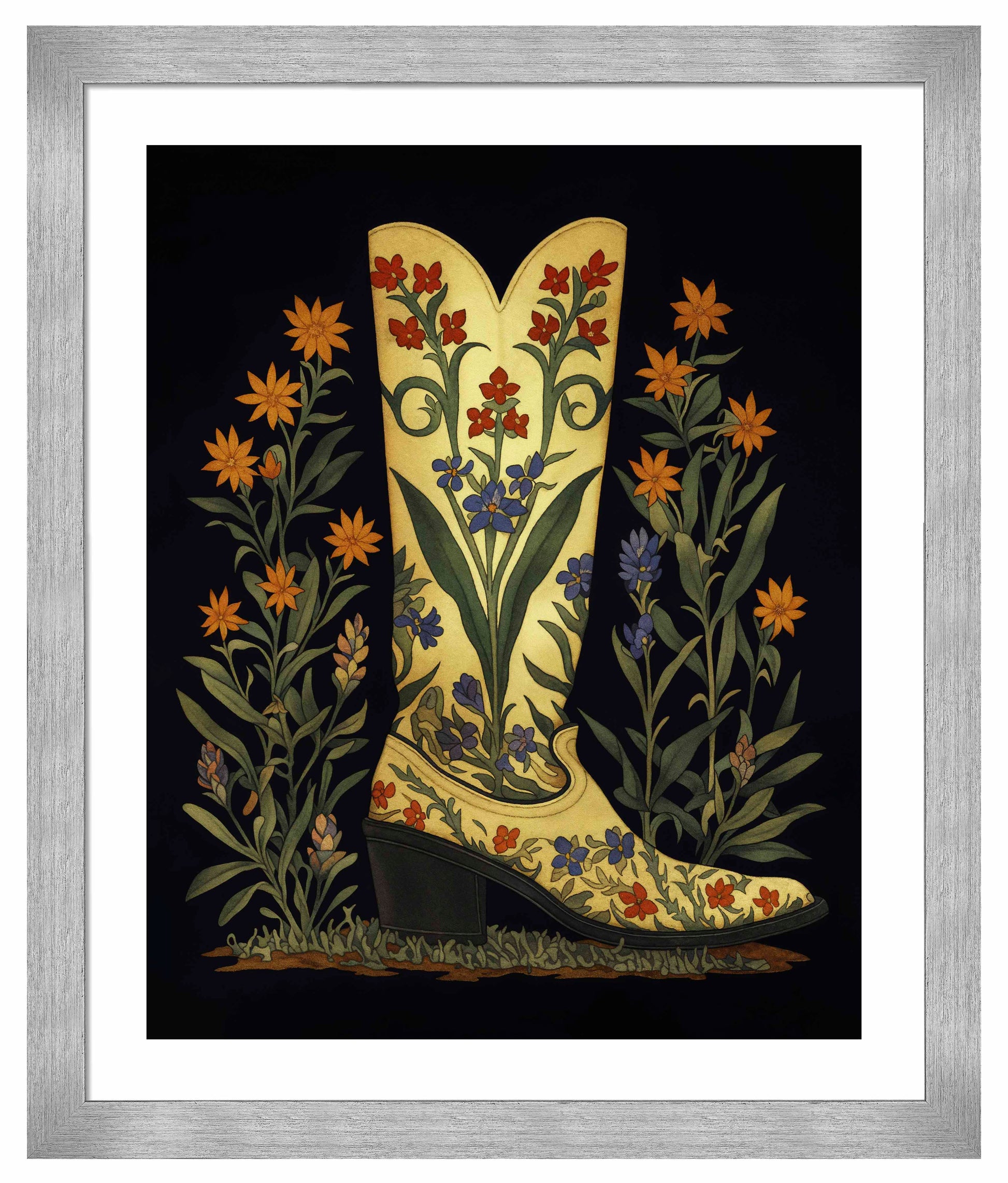 "Rodeo Ramblers" showcases a beautifully detailed cowboy boot set against a dark background, emphasizing its intricate floral design. The boot itself is depicted in a warm yellow hue, with vibrant red, blue, and green floral patterns decorating its surface, giving it a whimsical yet sophisticated appearance. The intricate details of the flowers, leaves, and vines that wrap around the boot bring a sense of life and movement to the static object, almost as if the boot itself is blossoming.