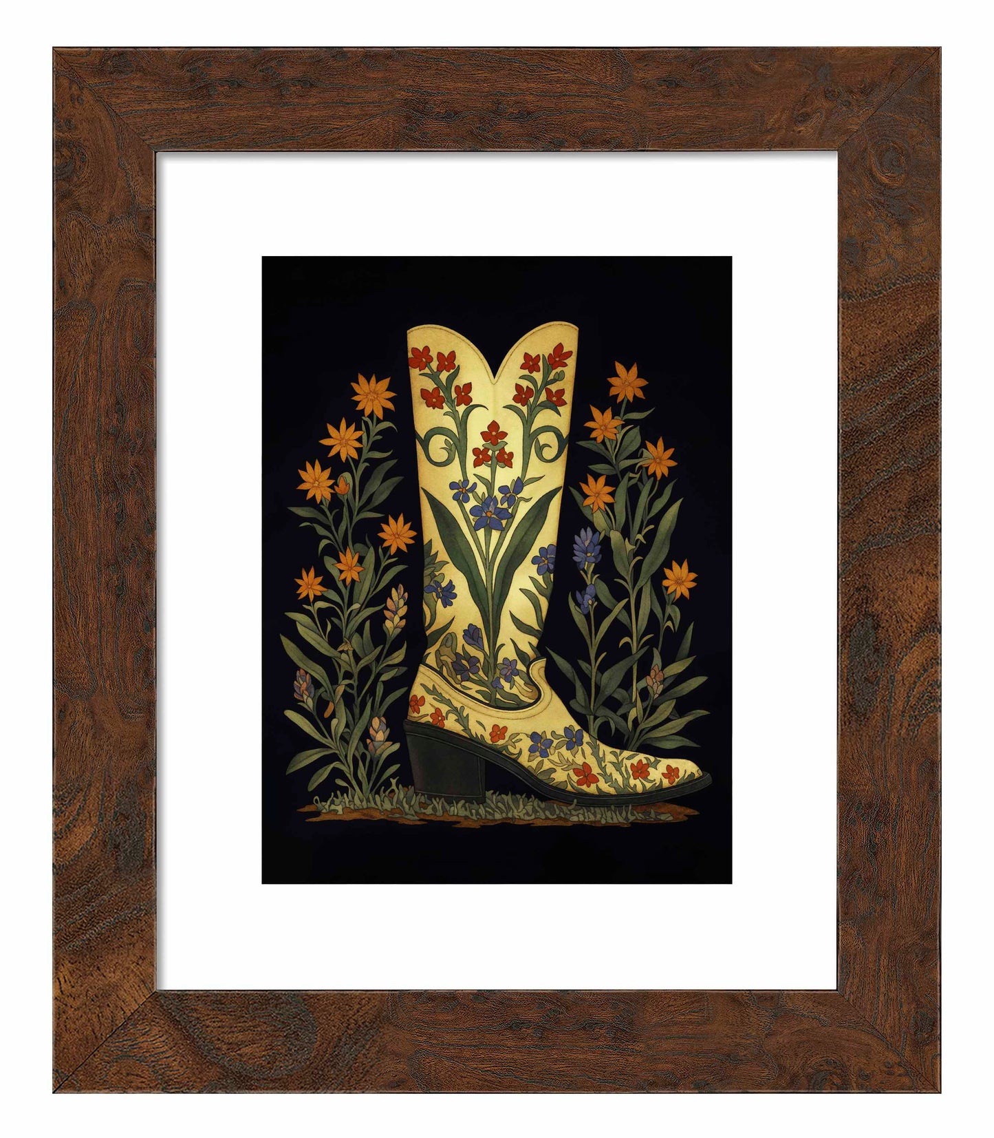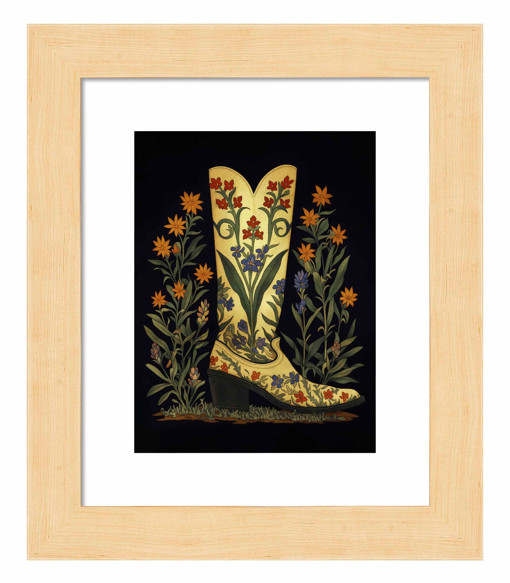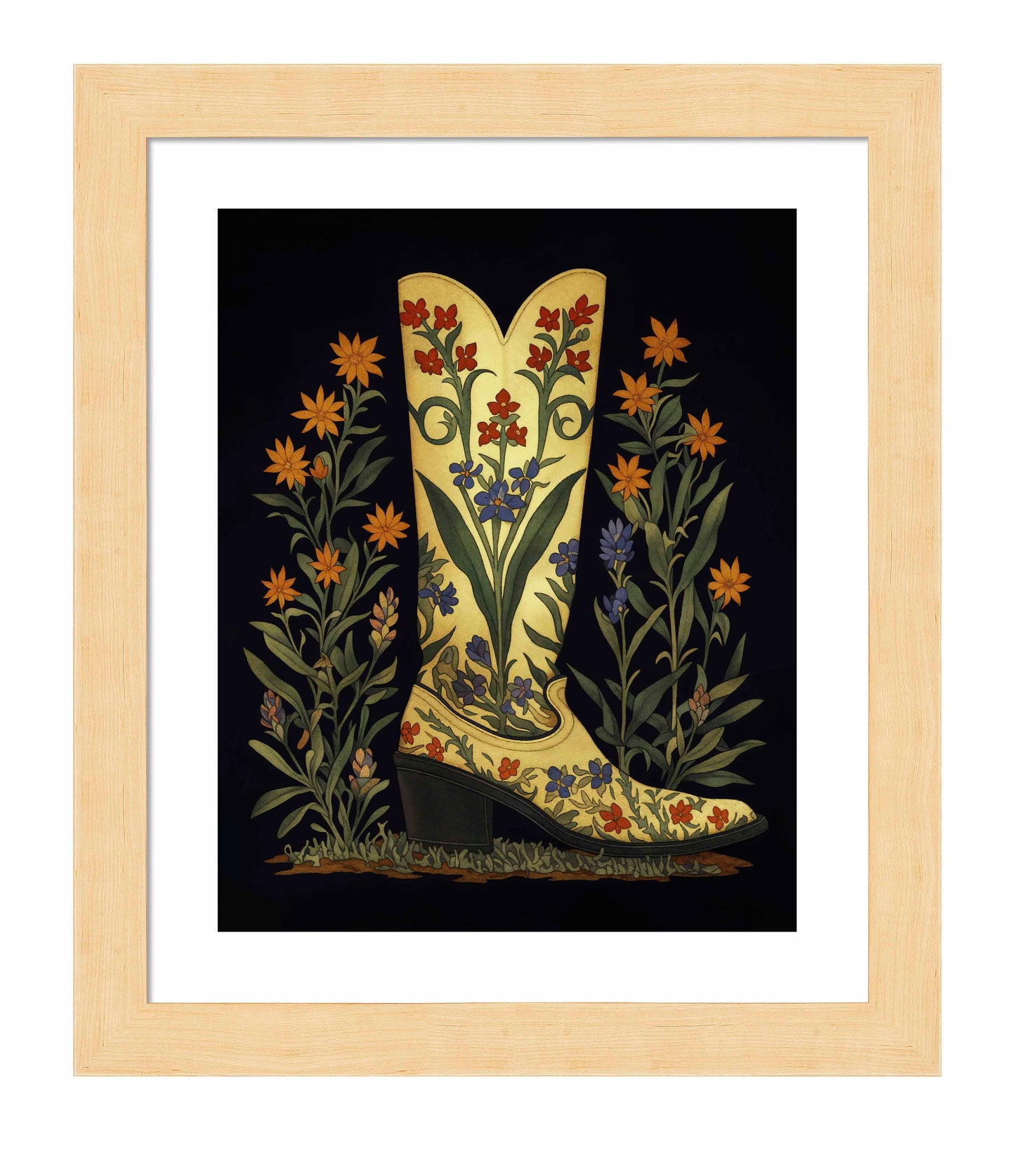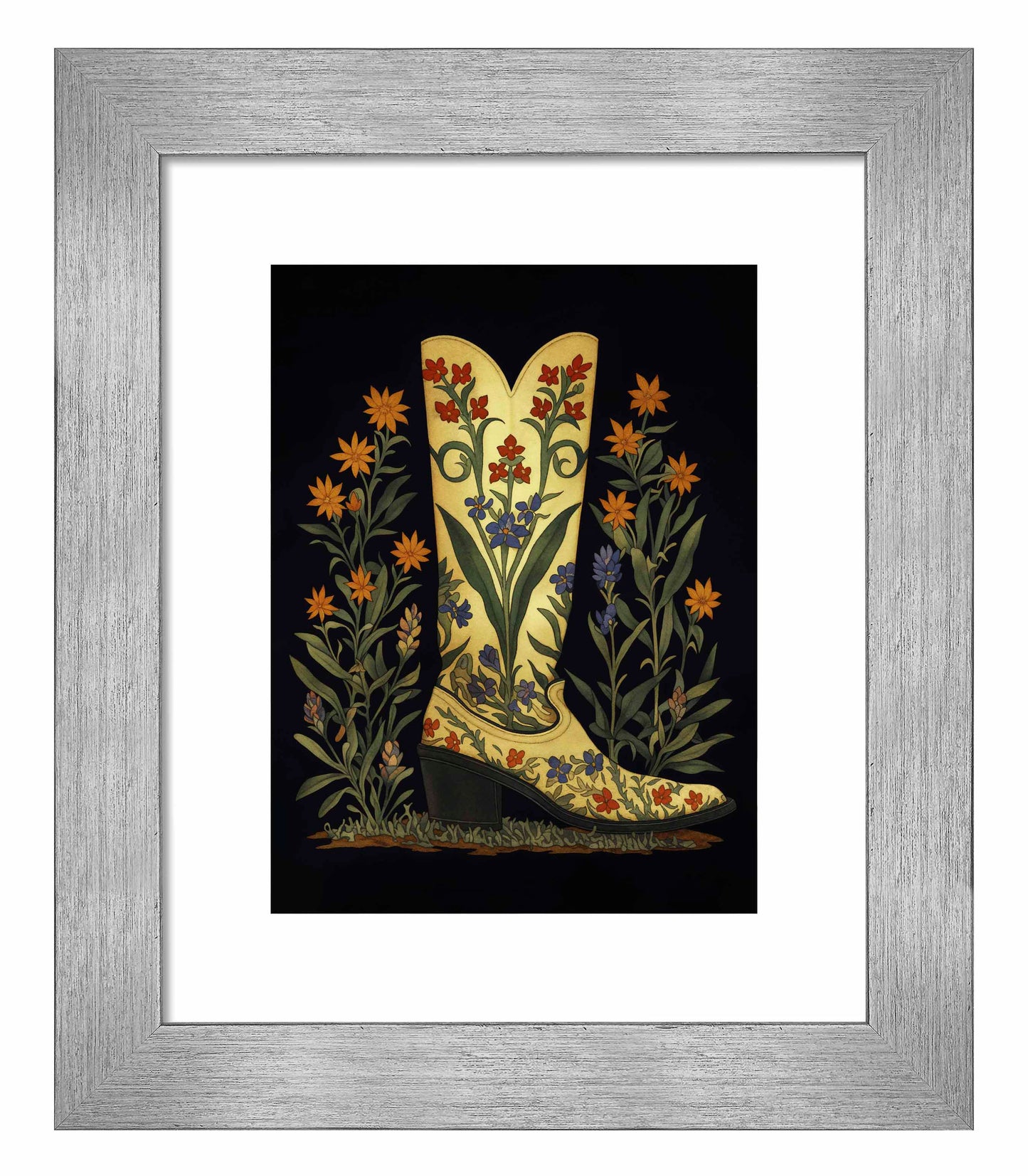 "Rodeo Ramblers" showcases a beautifully detailed cowboy boot set against a dark background, emphasizing its intricate floral design. The boot itself is depicted in a warm yellow hue, with vibrant red, blue, and green floral patterns decorating its surface, giving it a whimsical yet sophisticated appearance. The intricate details of the flowers, leaves, and vines that wrap around the boot bring a sense of life and movement to the static object, almost as if the boot itself is blossoming.