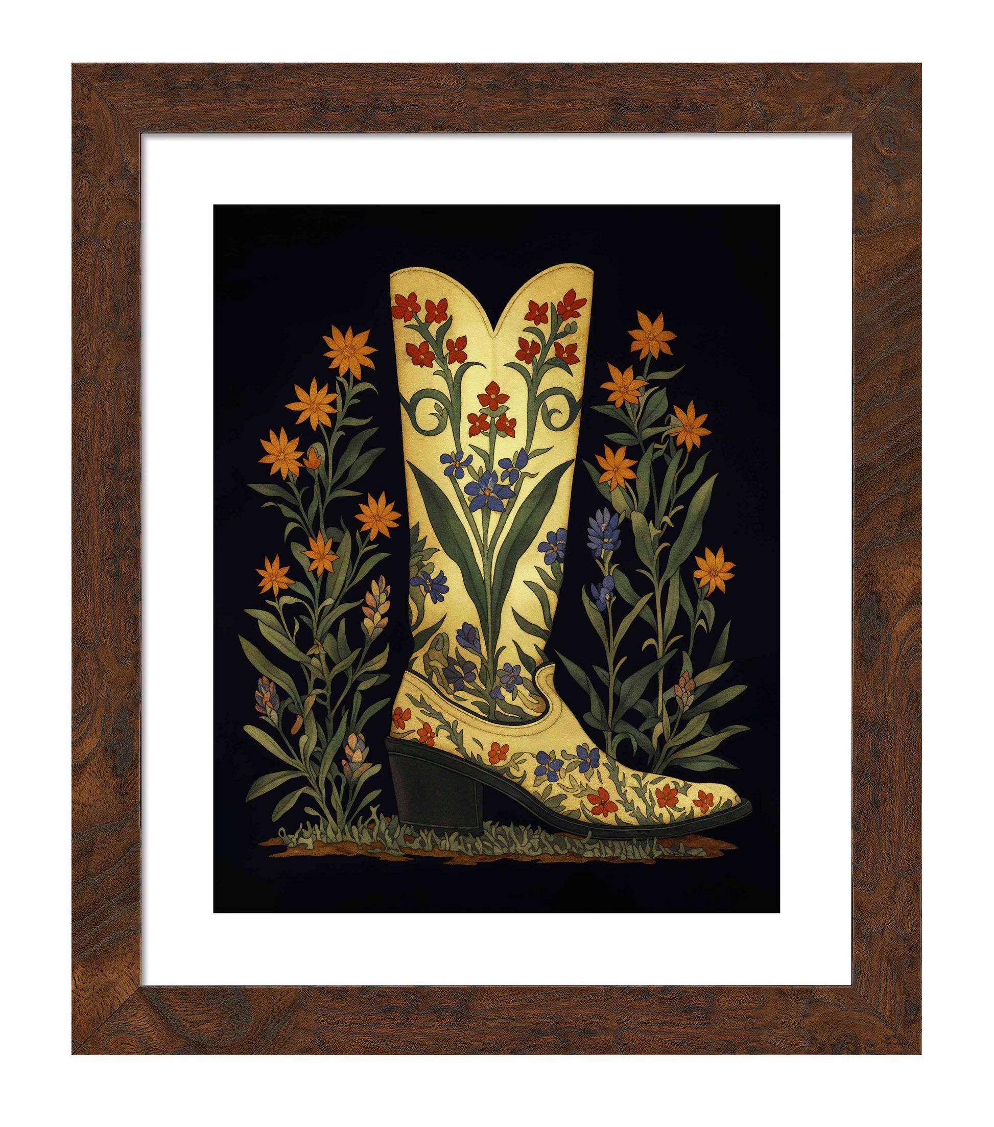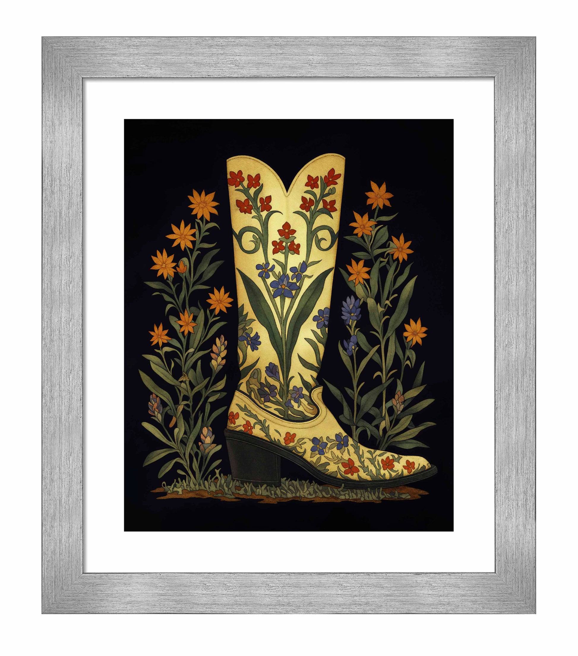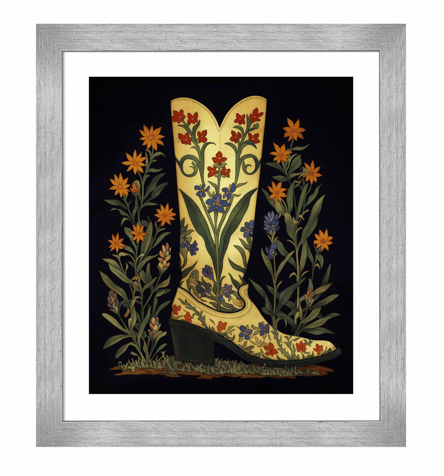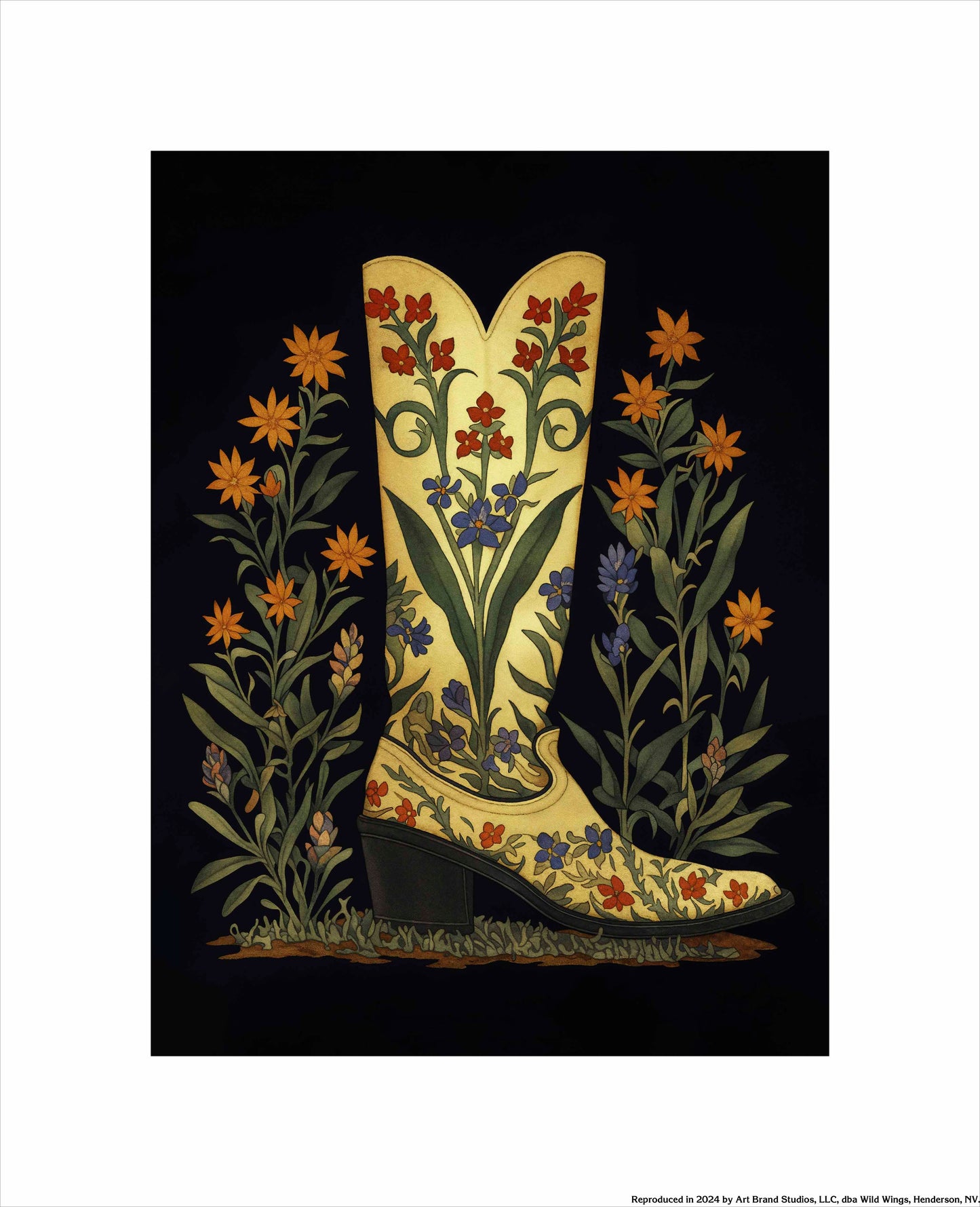 Surrounding the boot are tall stalks of wildflowers in orange, yellow, and purple tones. These flowers frame the boot and enhance the botanical theme, adding a sense of symmetry and balance to the composition. The dark background serves to make the boot and flowers pop, giving the painting a dynamic yet elegant feel.