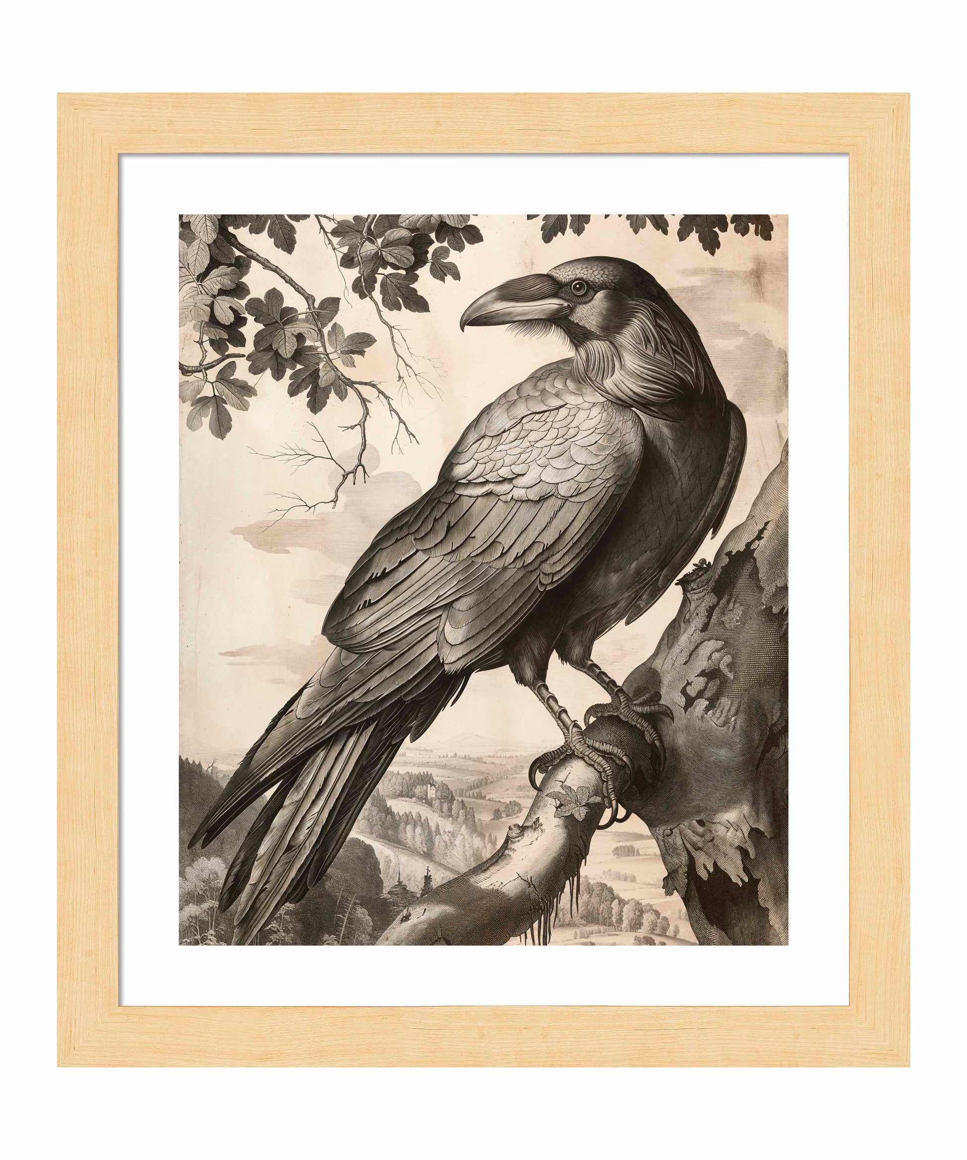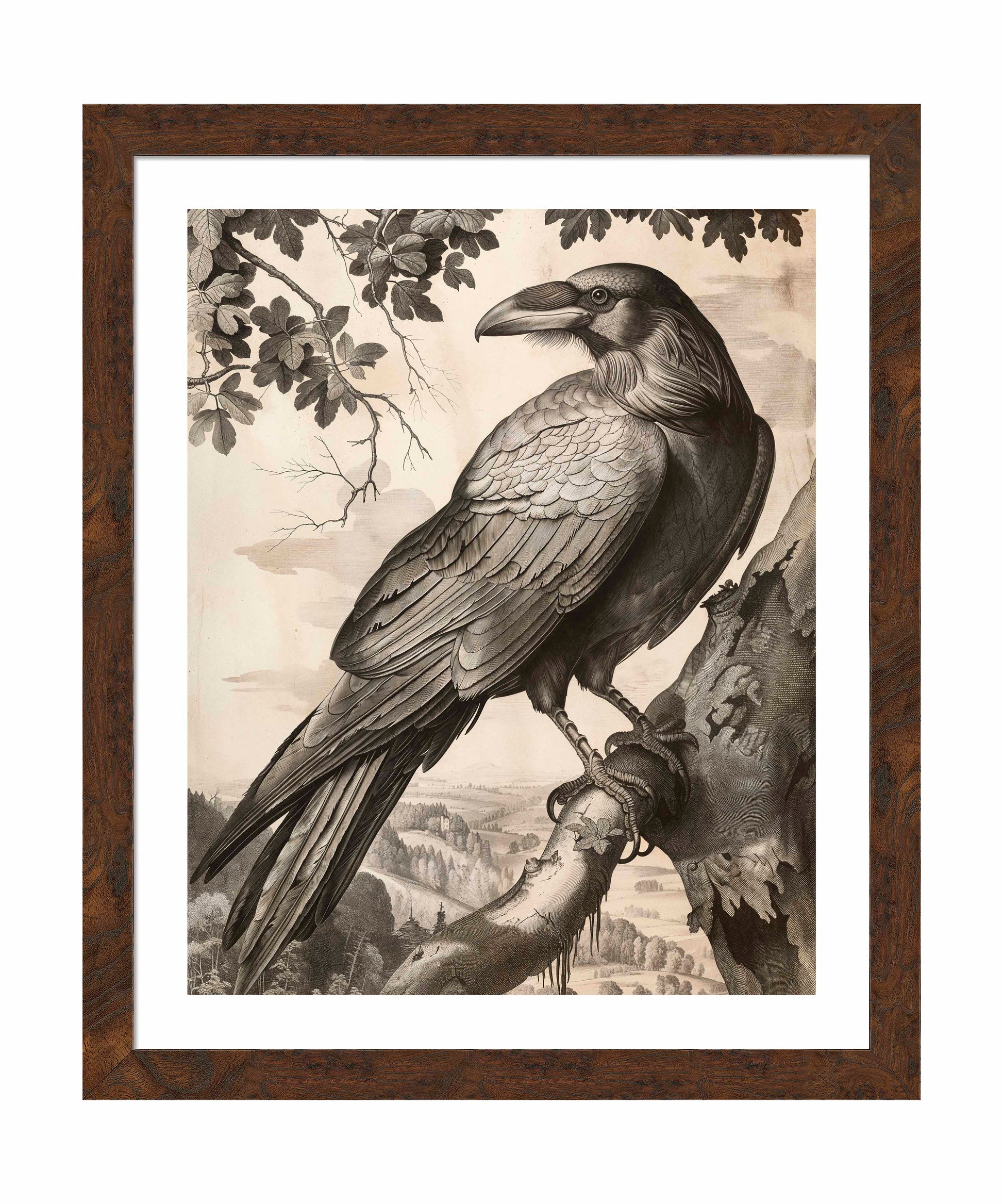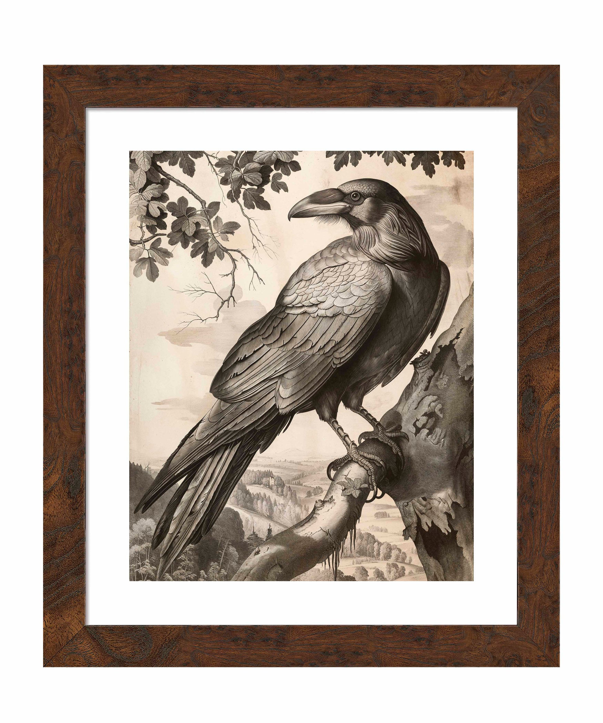 Regal Observer - Raven in Woodland Vista is an exceptional piece from the Engravers Choice Collection. This artwork features a majestic raven perched on a gnarled branch, overlooking a serene and expansive woodland landscape. The intricate linework and shading bring the raven to life, capturing the texture of its feathers and the contemplative intensity of its gaze.