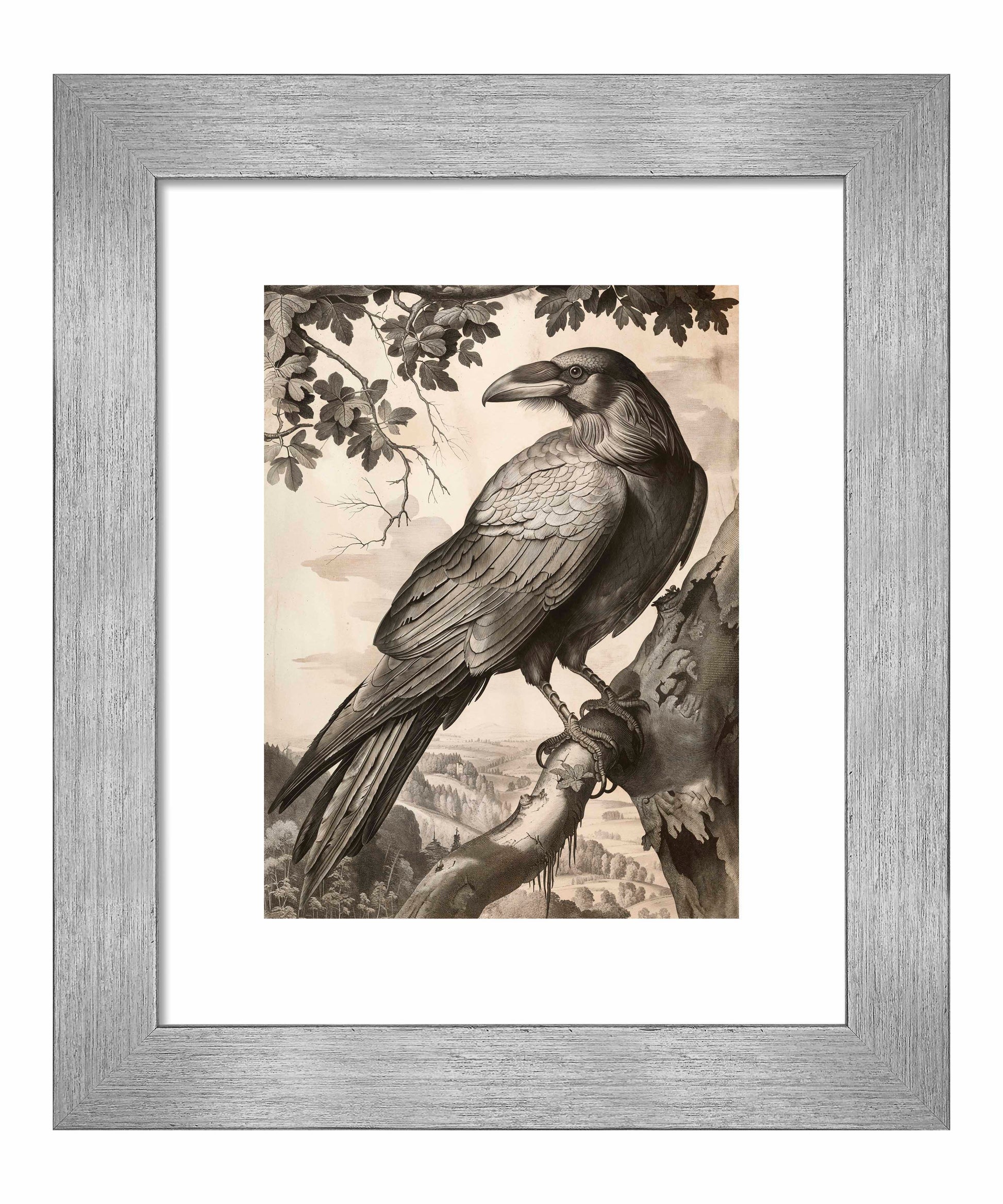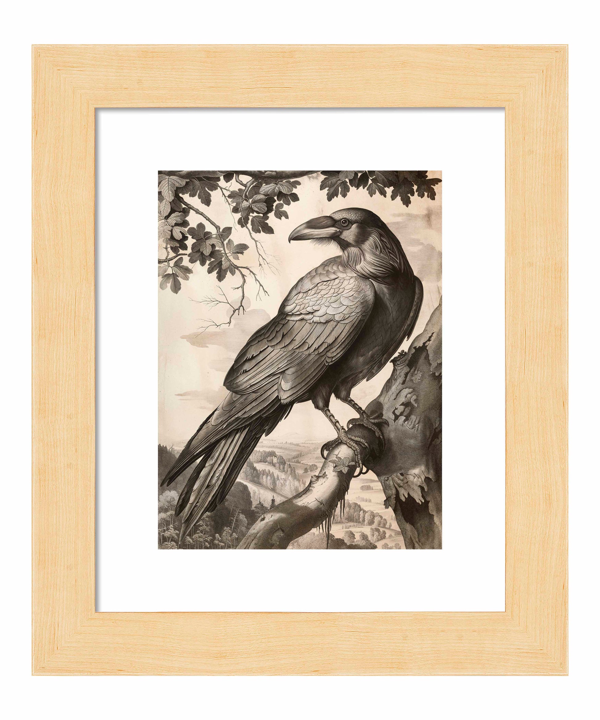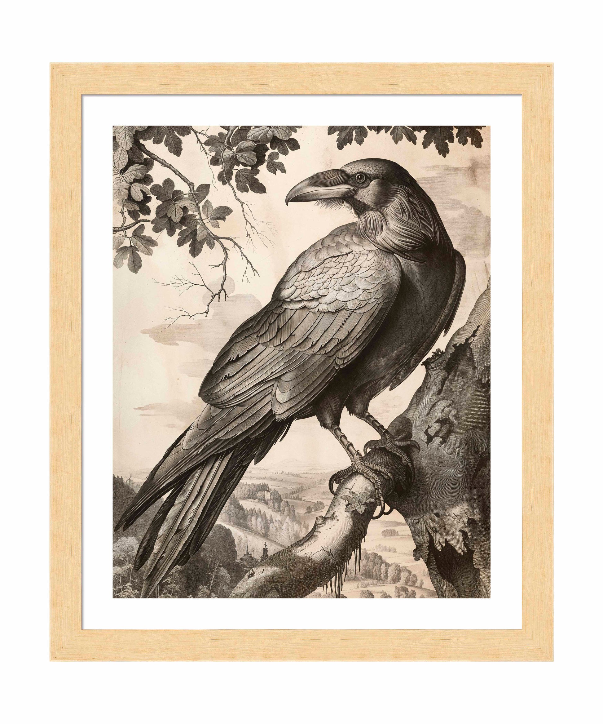 Regal Observer - Raven in Woodland Vista is an exceptional piece from the Engravers Choice Collection. This artwork features a majestic raven perched on a gnarled branch, overlooking a serene and expansive woodland landscape. The intricate linework and shading bring the raven to life, capturing the texture of its feathers and the contemplative intensity of its gaze.