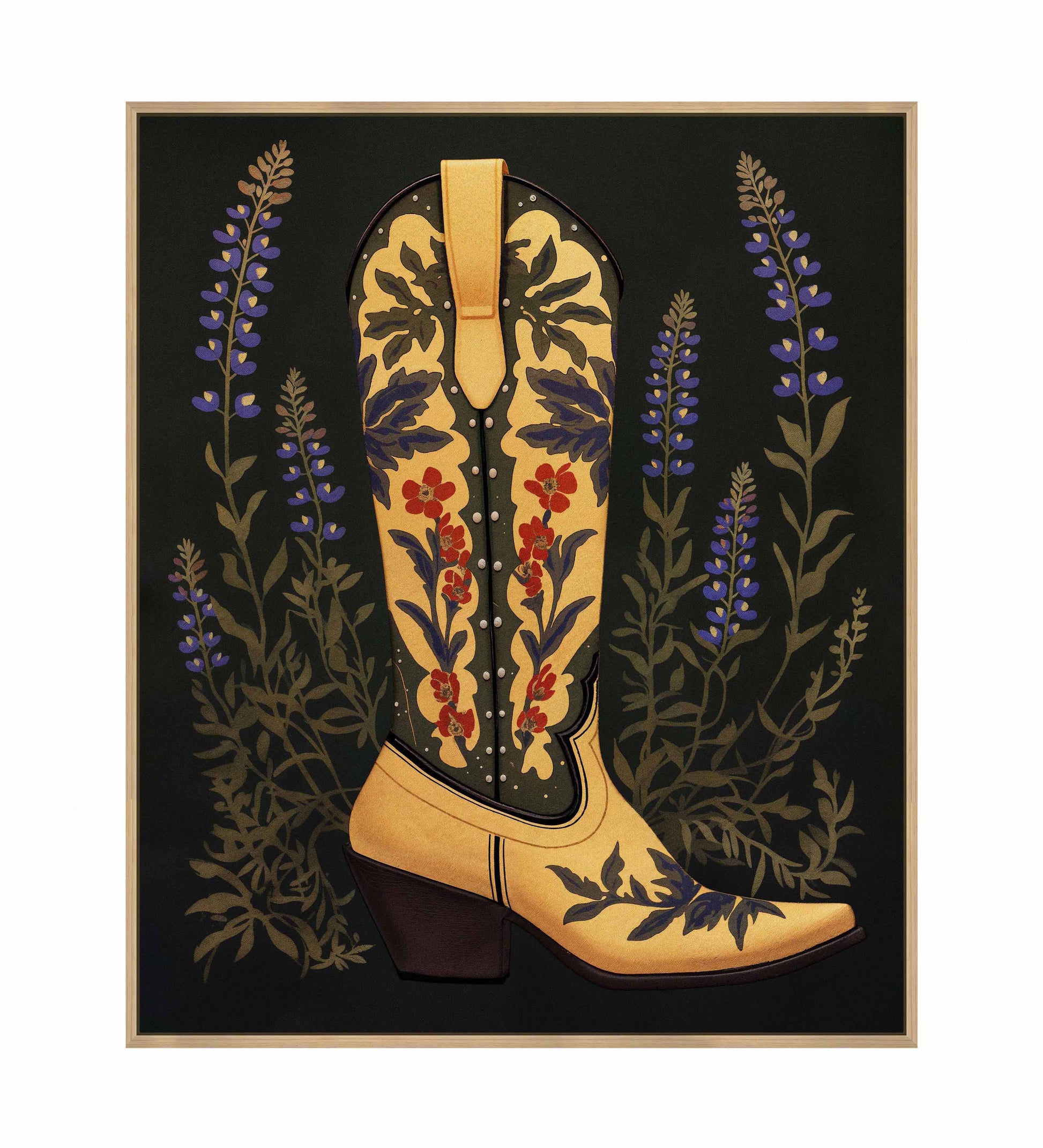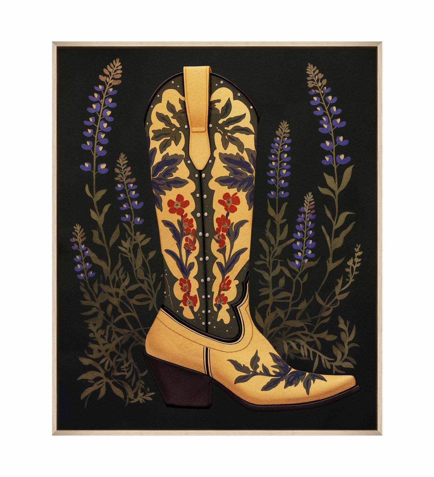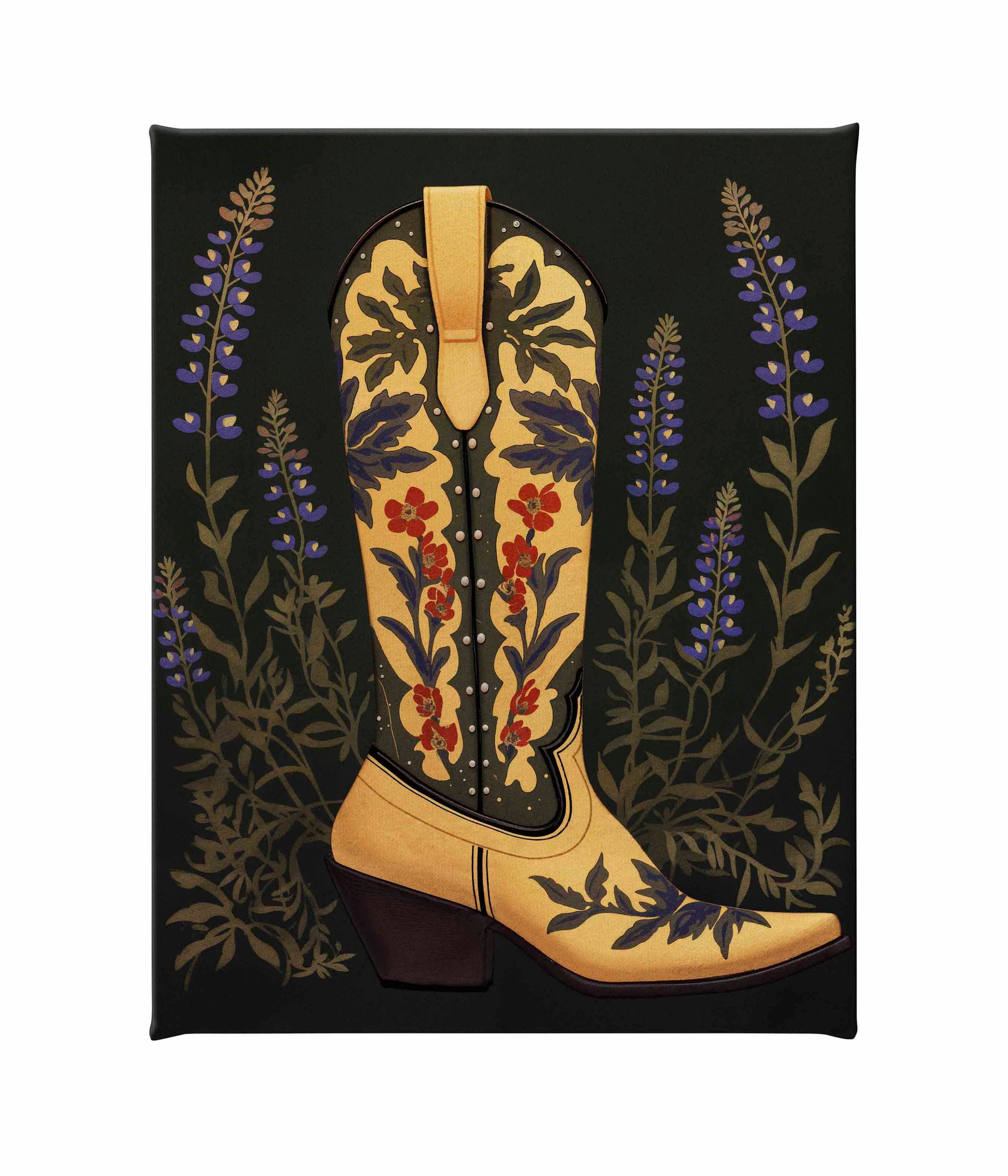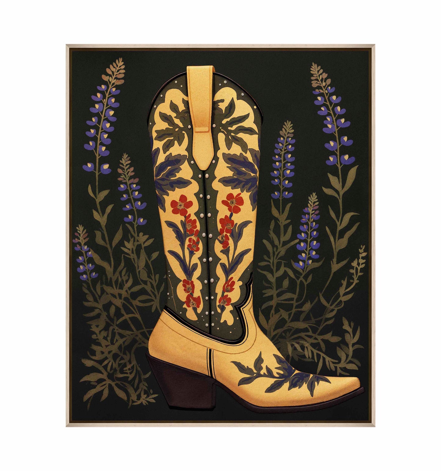 "Rattlesnake Stompers" is a vibrant and bold artwork that captures the essence of Western spirit and style through the depiction of a single, intricately designed cowboy boot. The boot is adorned with elaborate floral patterns in rich hues of blue and red, which contrast beautifully against the warm tan leather. This central image is set against a backdrop of bluebonnet flowers, reinforcing the connection to the Texan landscape and its iconic flora.