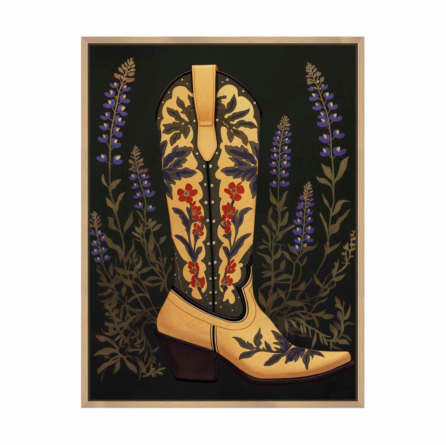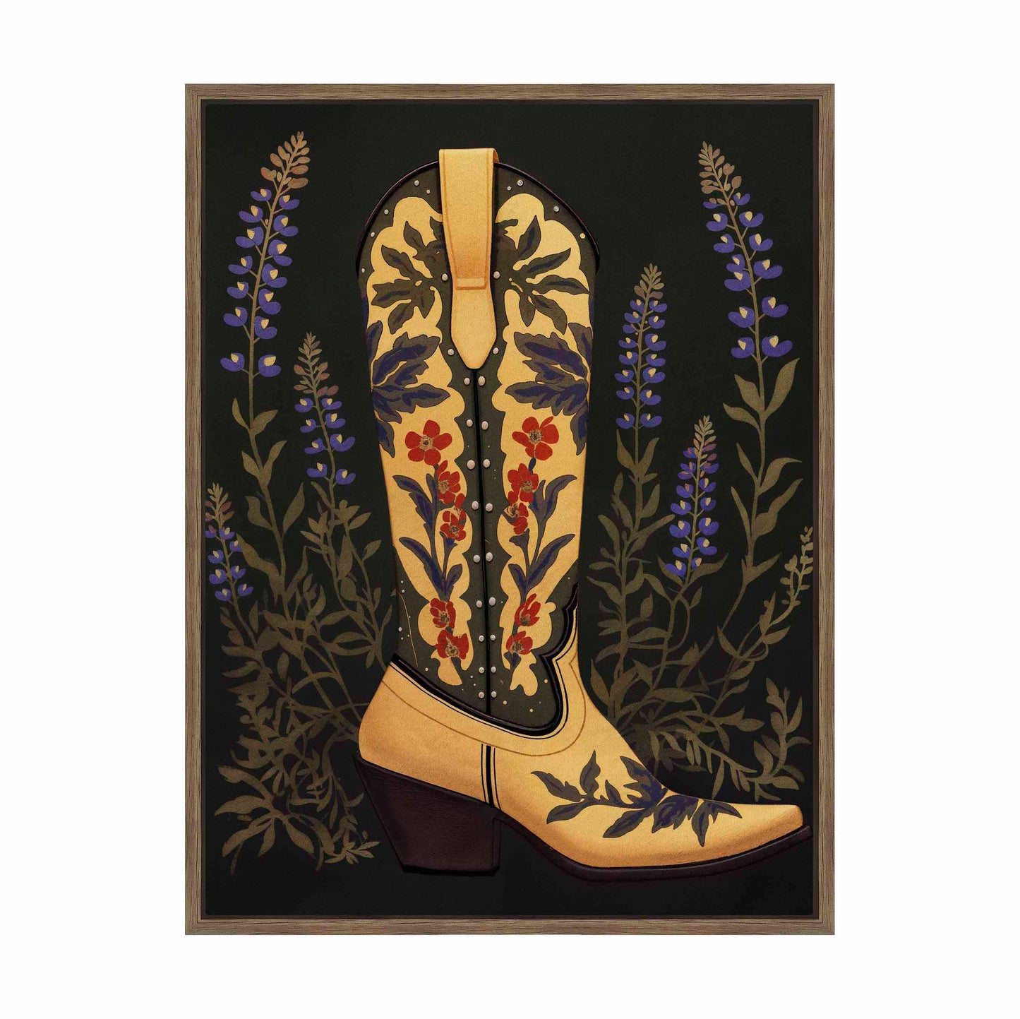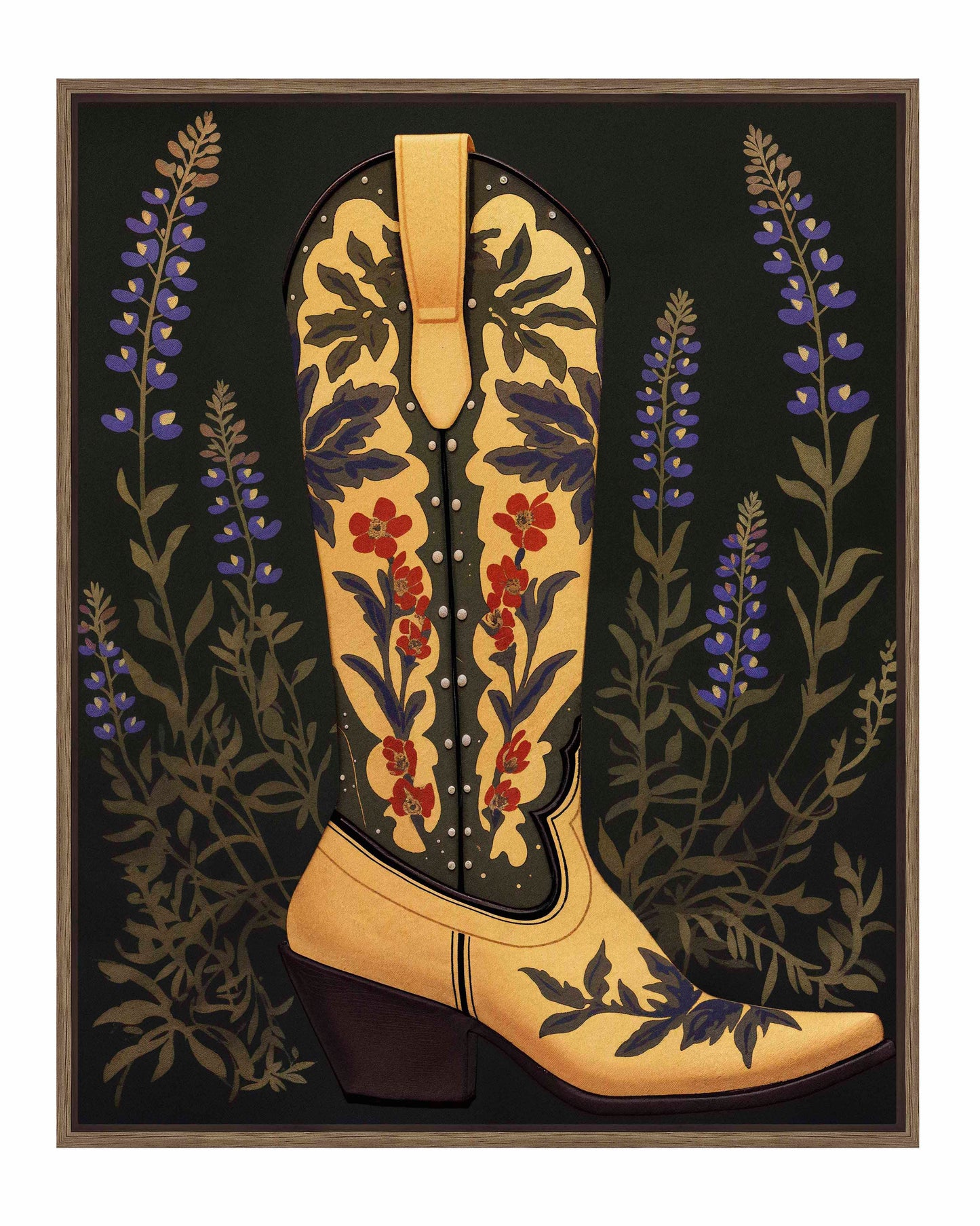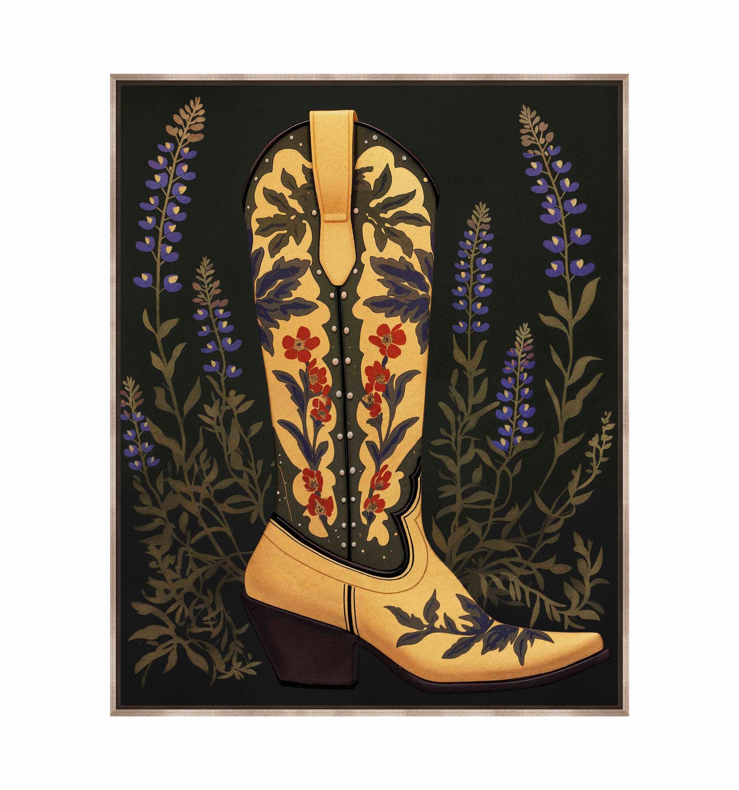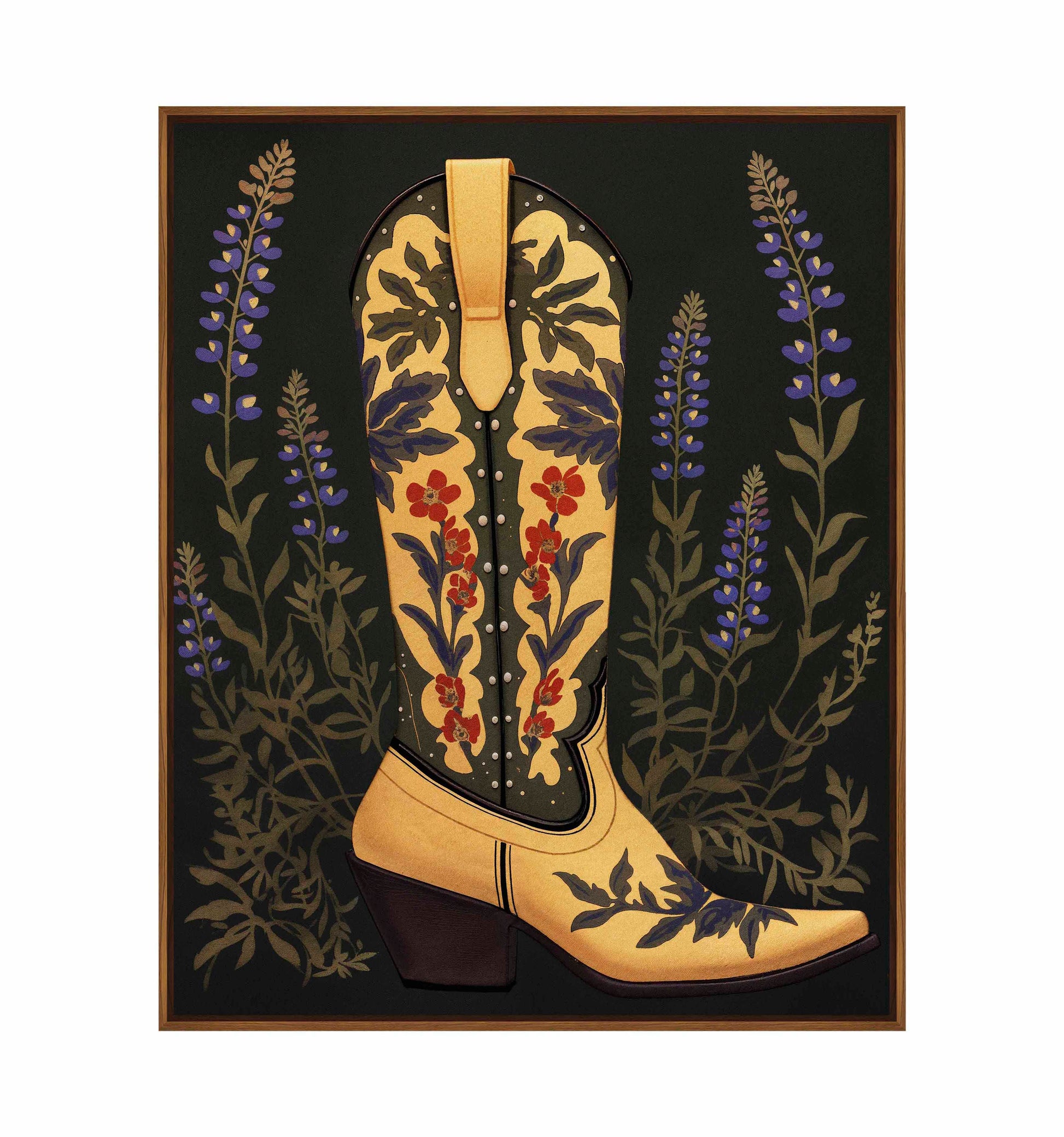 "Rattlesnake Stompers" is a vibrant and bold artwork that captures the essence of Western spirit and style through the depiction of a single, intricately designed cowboy boot. The boot is adorned with elaborate floral patterns in rich hues of blue and red, which contrast beautifully against the warm tan leather. This central image is set against a backdrop of bluebonnet flowers, reinforcing the connection to the Texan landscape and its iconic flora.