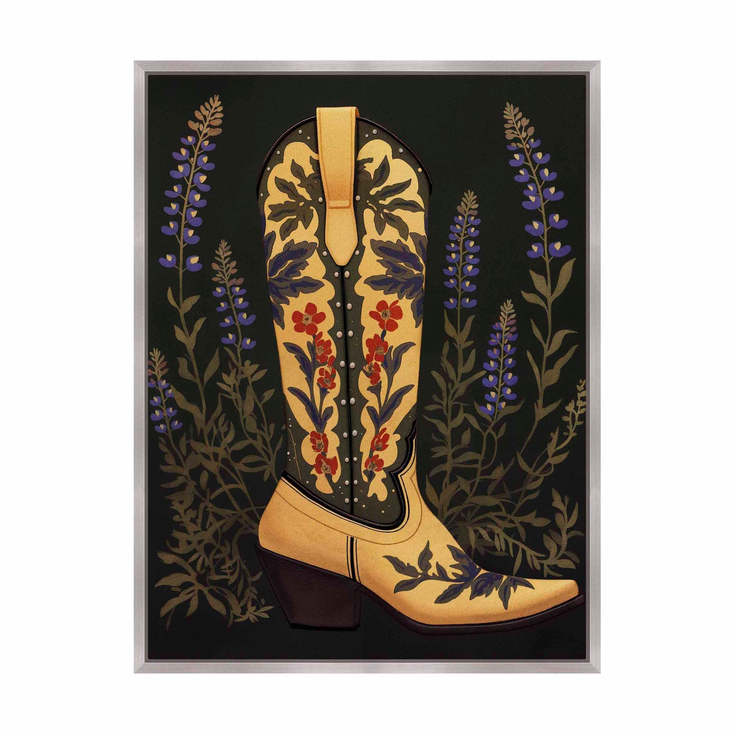 The boot itself is a work of art within a work of art, featuring finely detailed embroidery that reflects the craftsmanship and pride associated with cowboy culture. The deep green background creates a striking contrast, making the colors of the boot and bluebonnets pop with intensity. The carefully rendered floral motifs on the boot echo the surrounding bluebonnets, creating a visual harmony between the foreground and background elements.