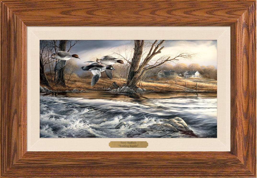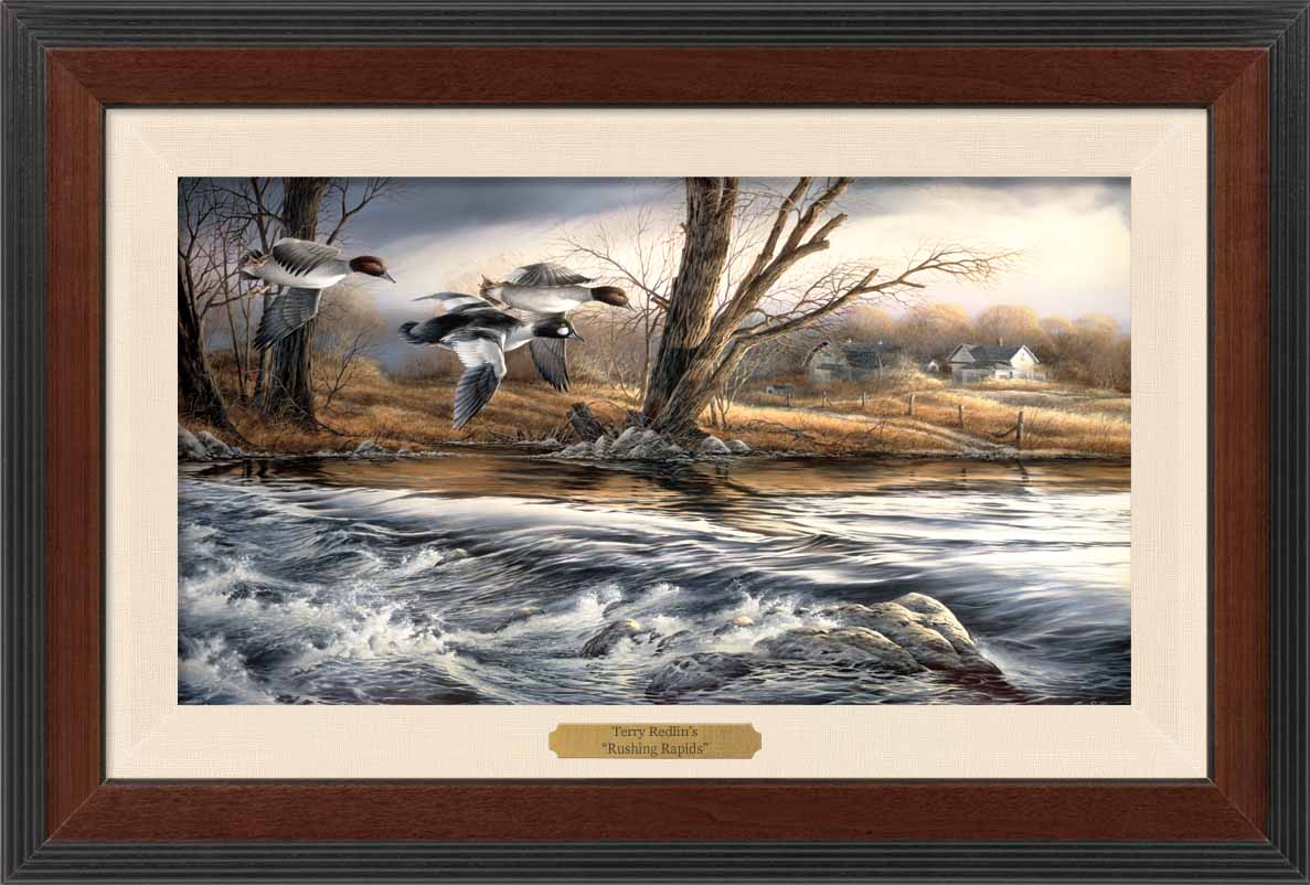 “Three Goldeneyes skim the river’s surface and head upstream looking for quieter water. These birds are commonly known as ‘whistlers’ because of the loud, high pitched sound of their wings in flight. Here Terry Redlin treats us to a vivid contrast of color and movement. The horizontal center of warm browns and oranges is essentially static. Cool blues and greys frame this center, and the rushing water and straining Goldeneyes quickly bring the viewer into the scene’s focus of high action.”