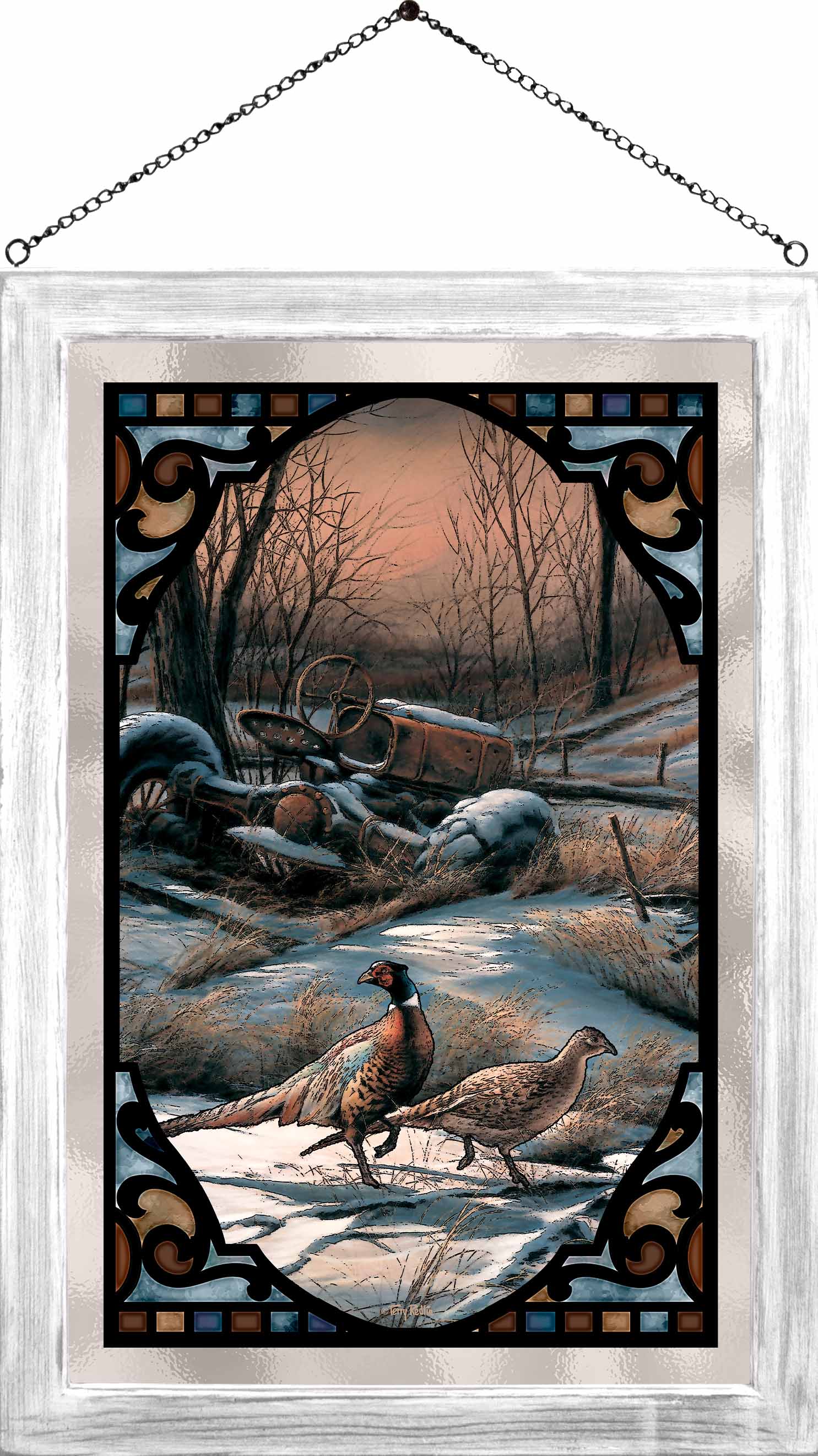 Let the light shine! Stained glass art hangings show their true colors when back-lit with natural sunlight. Popular designs are printed with fade resistant inks on 12" x 18" glass, framed with 1" black-finished moulding. Framed size 14" x 20". Ready to hang with provided chain. Designed, printed, and assembled in North America.