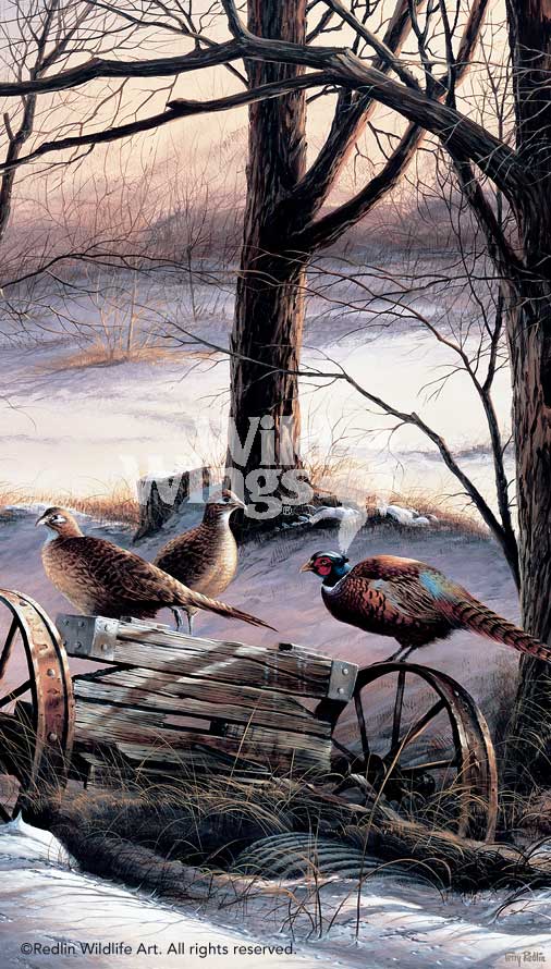 “It is one of those almost perfect winter afternoons. The wind is stilled, and the warm sun reflects up from the bright snow cover. In this peaceful setting three ring-necked pheasants have found the ideal roost. A long-ago farmer has left his worn out wagon by the side of the road. It is only a skeleton now, but serves as a poignant reminder of people and their dreams passing from the land.”