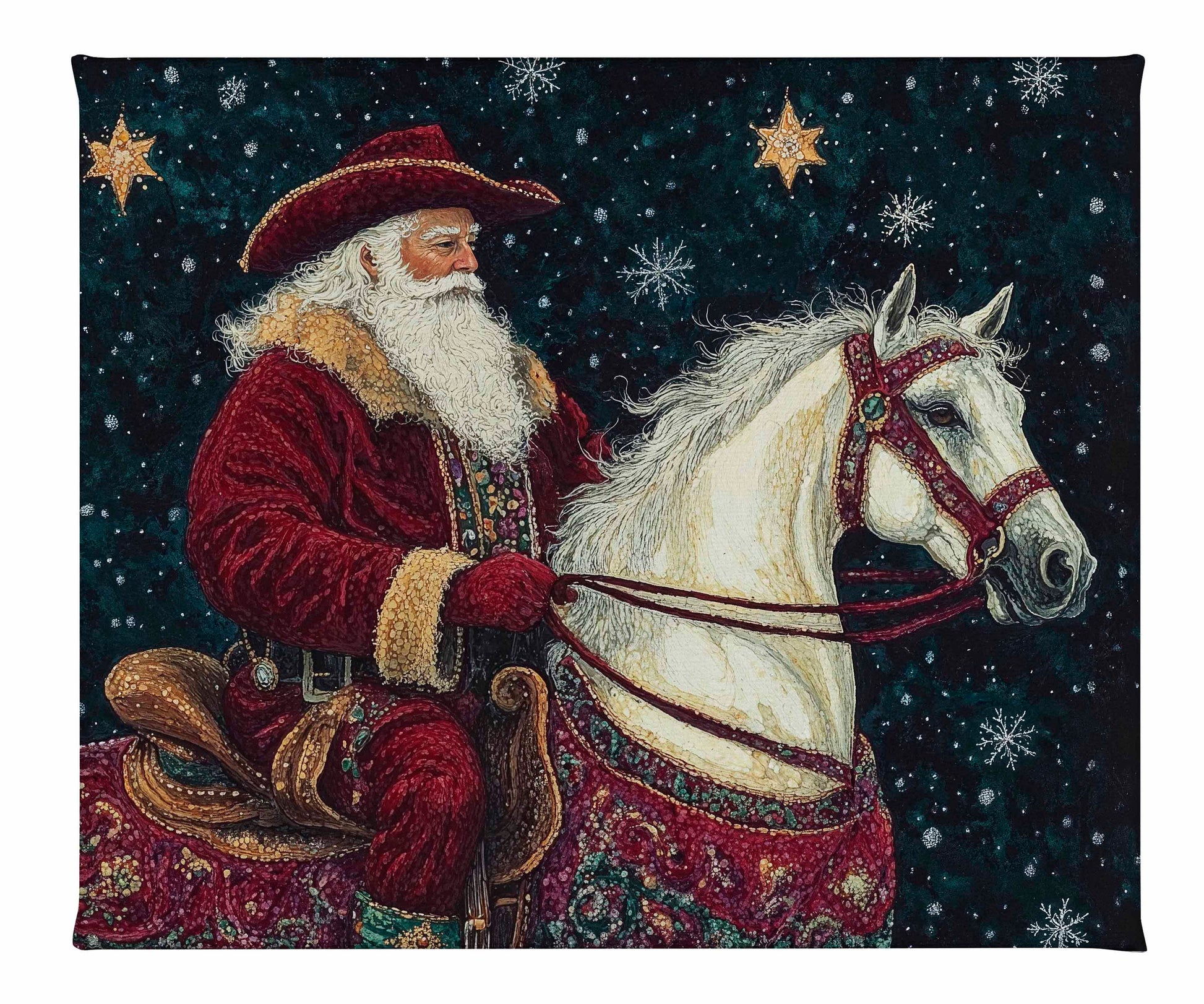 Santa's mount, a beautiful white horse, is equally adorned for the holiday season. Its bridle and saddle blanket are a deep red, matching Santa's attire, and are decorated with intricate patterns that suggest both Western tooled leather and Christmas motifs. The horse's mane flows majestically, adding to the overall sense of movement and adventure.