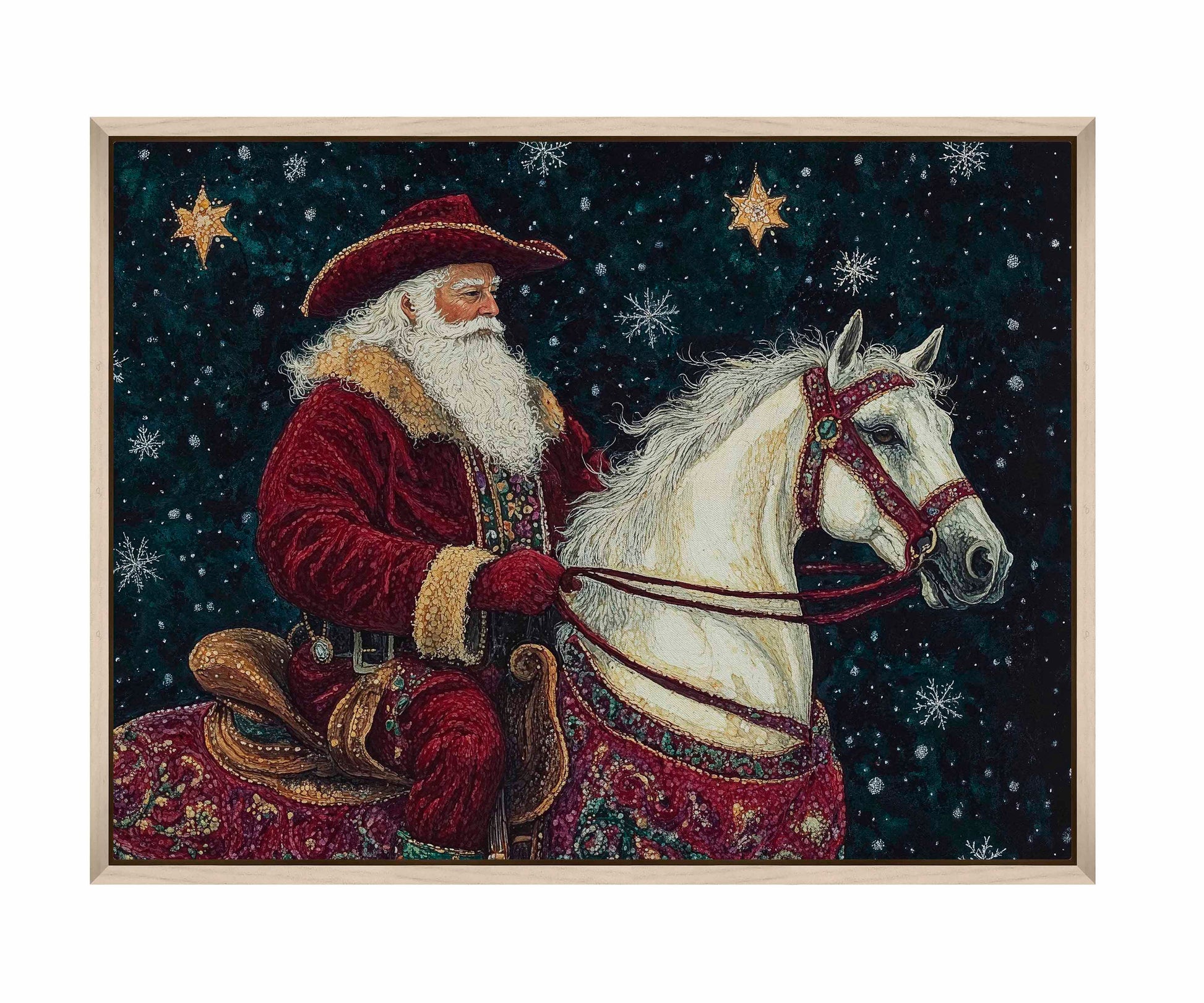 The focal point of the piece is Santa Claus himself, transformed into a rugged yet jolly cowboy. He's depicted astride a majestic white horse, embodying both the spirit of the Old West and the magic of Christmas. Santa's familiar white beard and kind eyes remain, but his usual red suit has been replaced with a rich burgundy duster coat trimmed with fur, perfectly melding his traditional look with frontier attire.