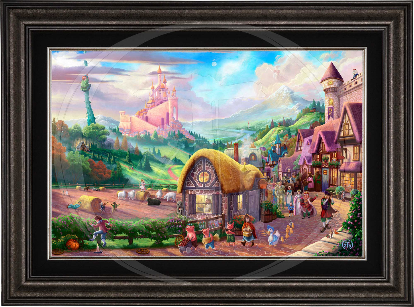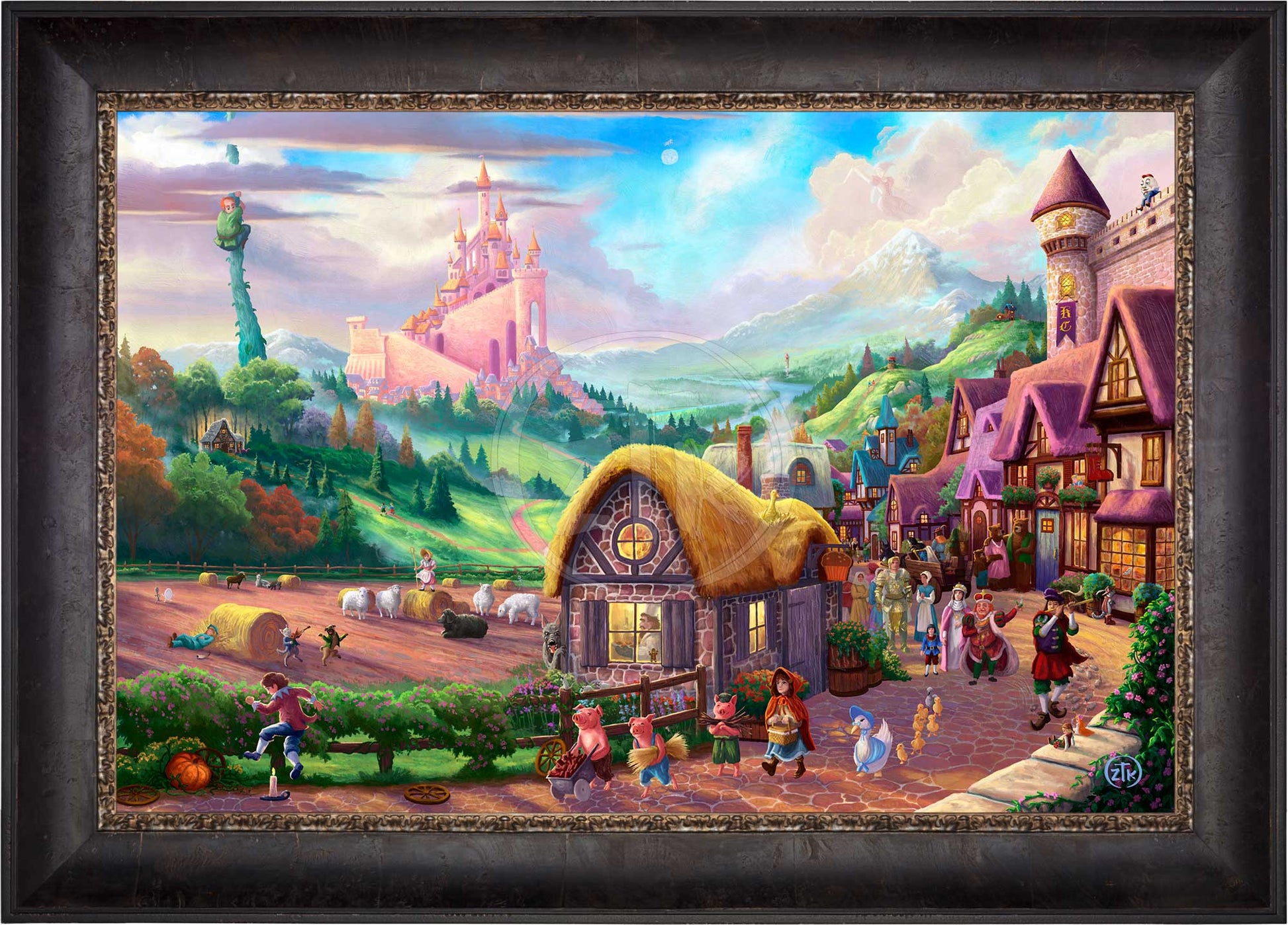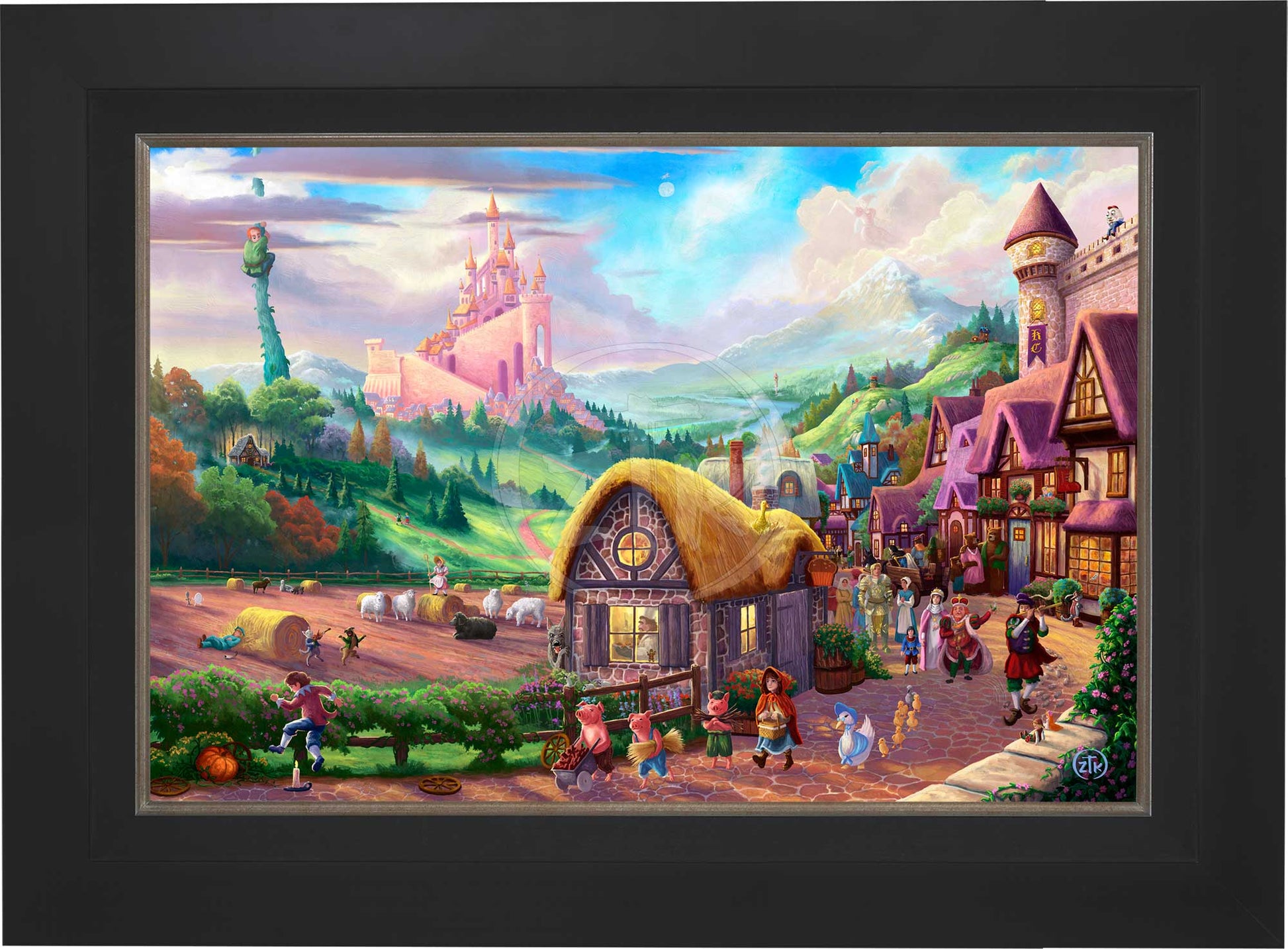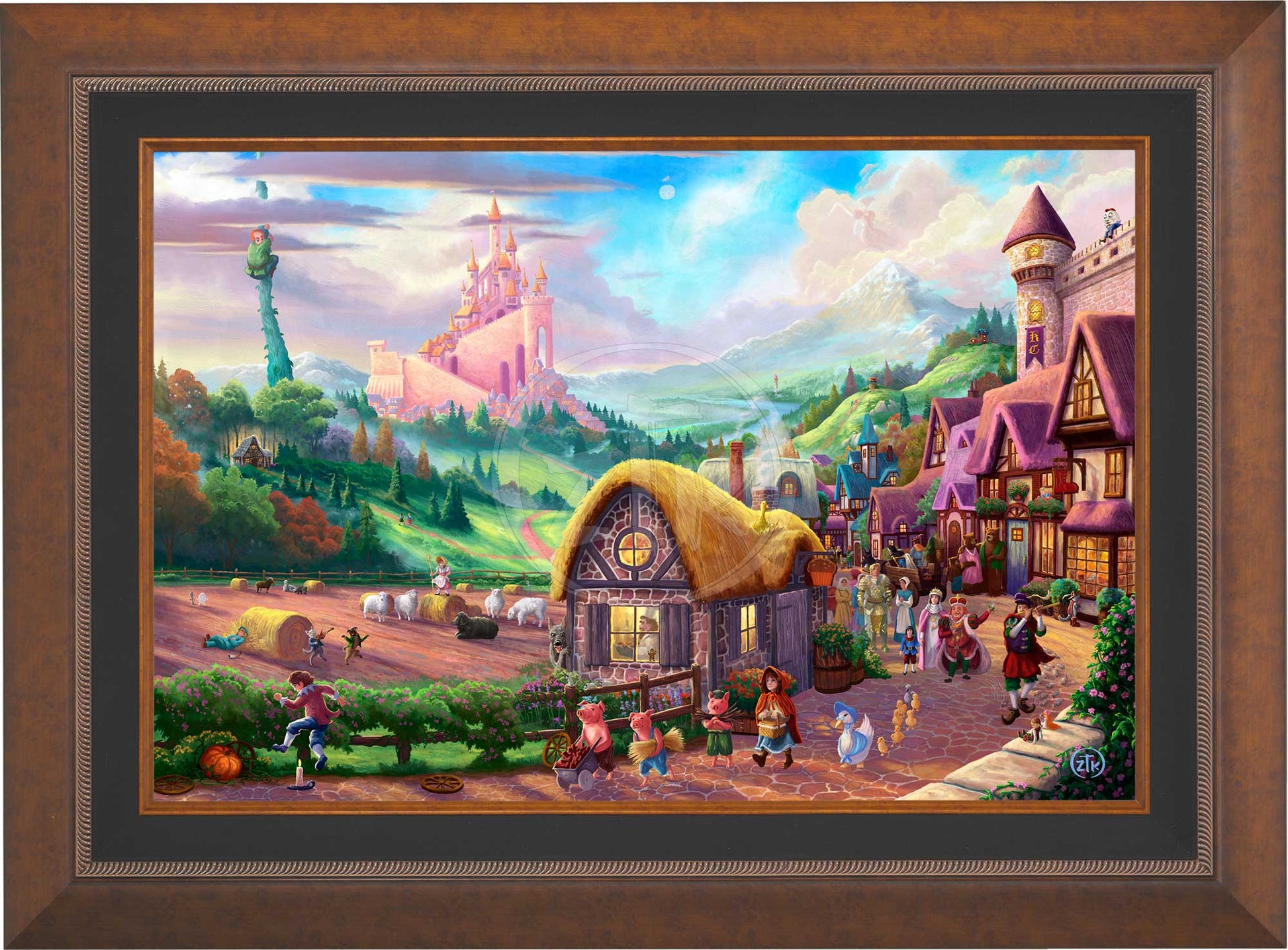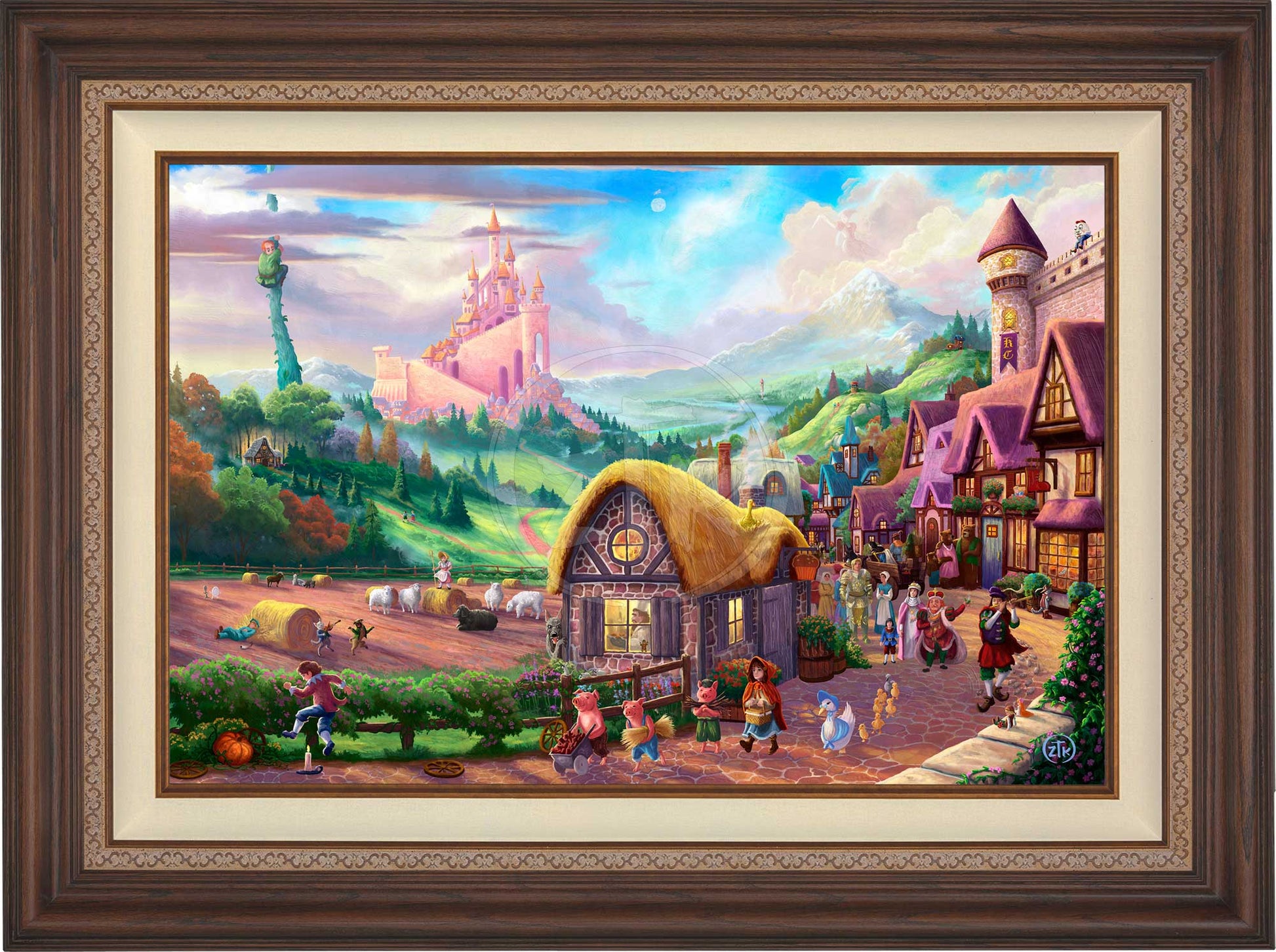 There is an innocence and fun that comes with revisiting childhood stories. Mother Goose nursery rhymes and fairy tales from both the Brothers Grimm and Hans Christian Andersen evoke smiles and nostalgia from even the most quieted adult imaginations. In my work Storybook Land, I have attempted to capture many of my favorite childhood tales in a whimsical view of a fantasy realm where these adventures are true, and the colorful characters involved in them all might exist. Look closely and see that here, there is, indeed, an old woman who lives in a shoe and Jack and Jill did go up that troublesome hill. It is also the case that giants tend to live at the top of beanstalks and Goldilocks truly had an unfortunate run-in with three unsuspecting bears. Join me to fully explore this magical place. There are over 30 references to popular nursery rhymes and fairy tales rendered into this composition. Think back and let the child inside you revel in their rediscovery and give the children in your life a chance to enjoy your telling of the stories. I hope this painting brings you the happiness I felt in its creation, and as always, I want to thank you all for sharing my adventure in art.