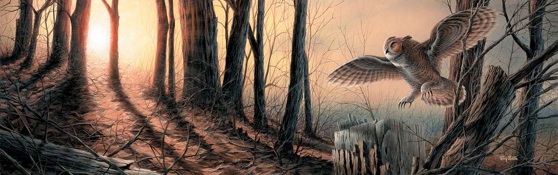 Considered by many to be a painter only of waterfowl and upland game birds, in reality Terry Redlin's interests extend well beyond the boundaries of redheads and ring-necks. This painting of the great horned owl offers a good example of, not only his subject versatility, but also his skillful handling of landscape detail, atmospheric mood and arresting composition. As darkness approaches the owl is preparing for an evening of good hunting. Its ability to maneuver in near perfect silence means trouble for all small nocturnal animals. Few people are privileged to see this largest of our eared owls, but you may have heard its soft and haunting 'hoo-hoo-hoooo' from deep in the night.