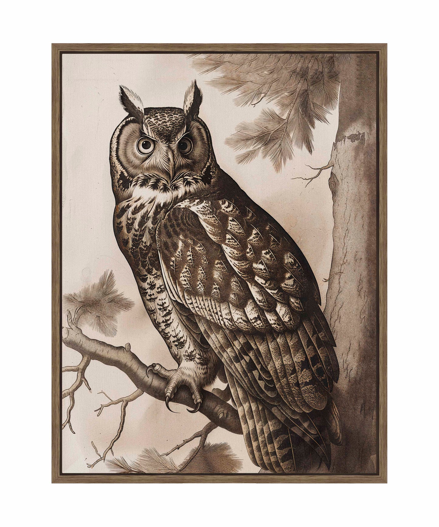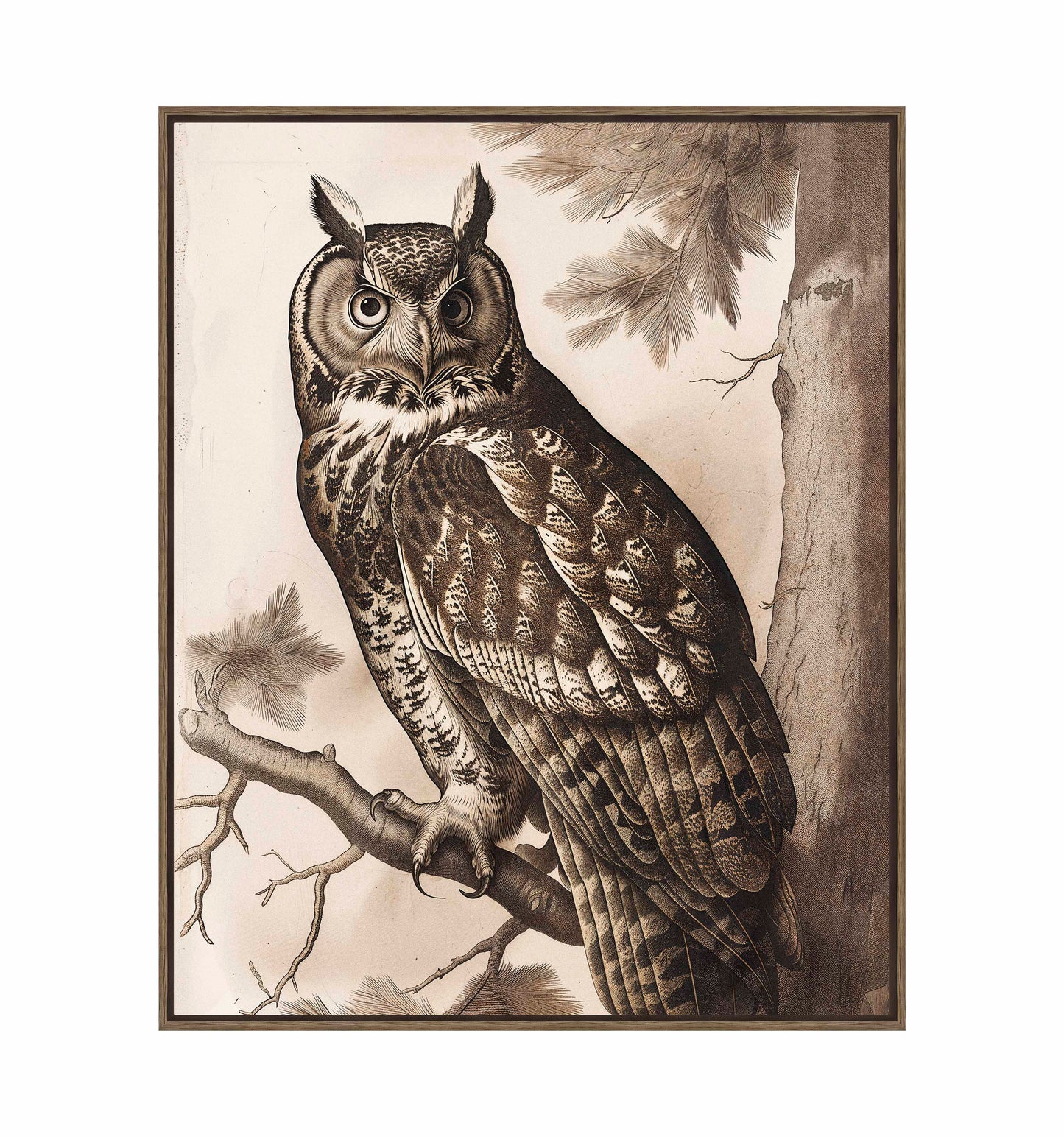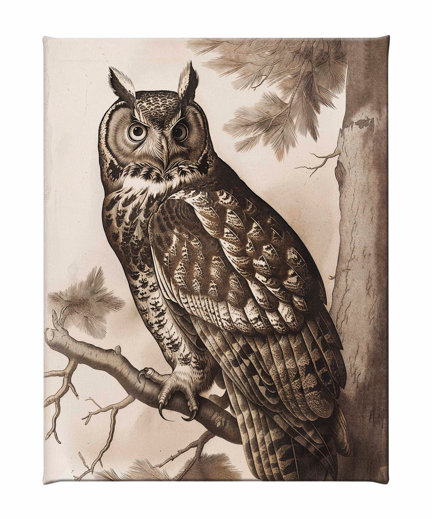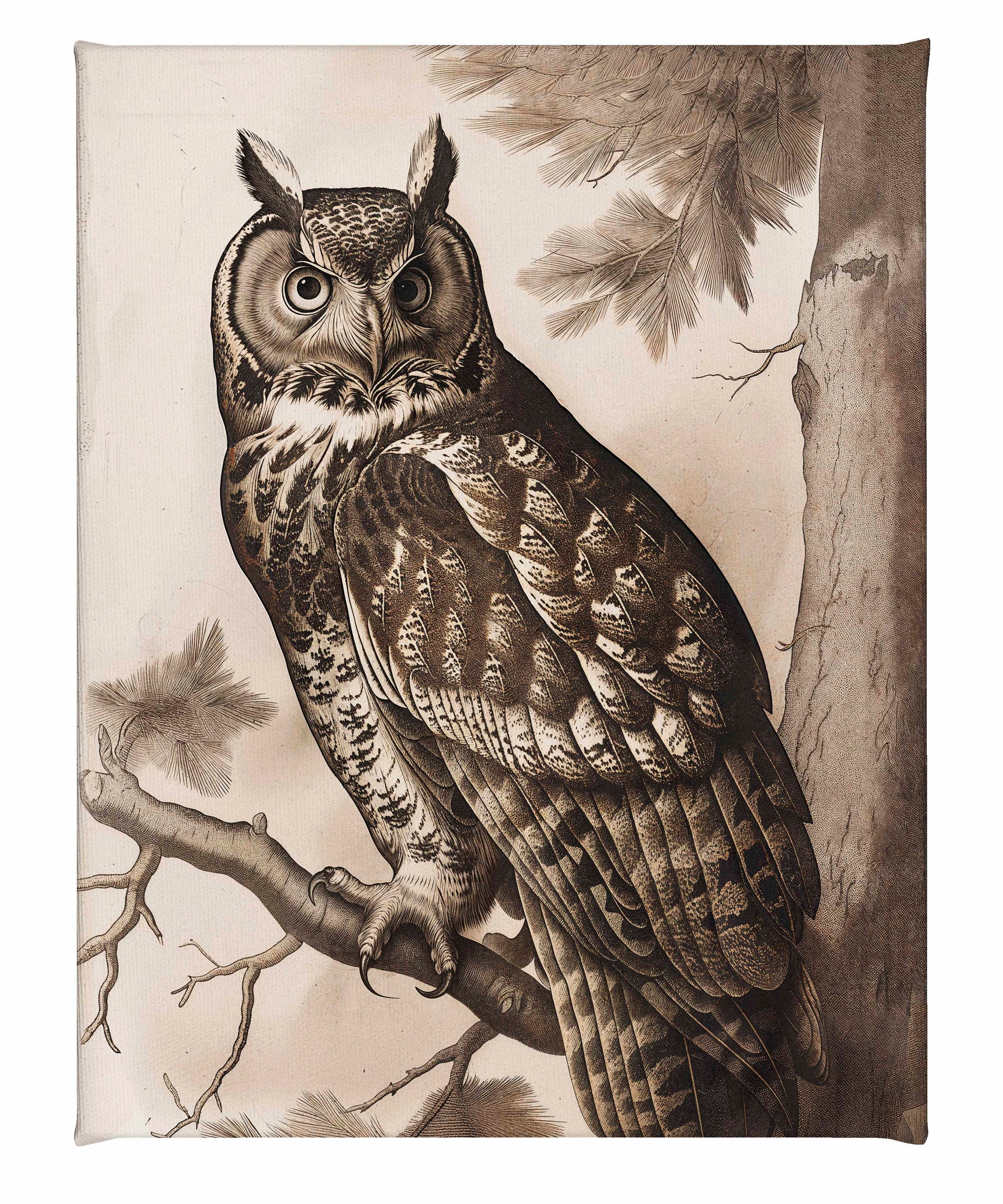The artist's masterful use of linework and shading brings out the rich textures of the owl's plumage and the rugged bark of the pine tree, creating a lifelike and immersive scene. The monochromatic palette enhances the dramatic contrast between the owl and its natural surroundings, emphasizing the bird's regal presence against the detailed backdrop of the forest.
